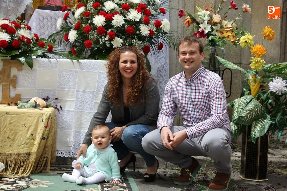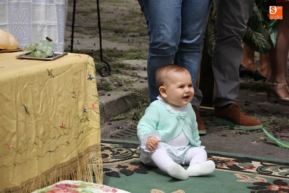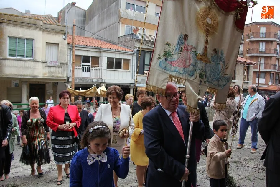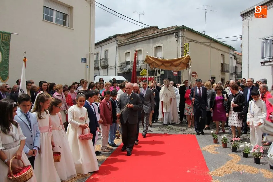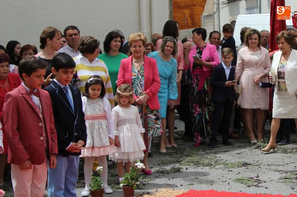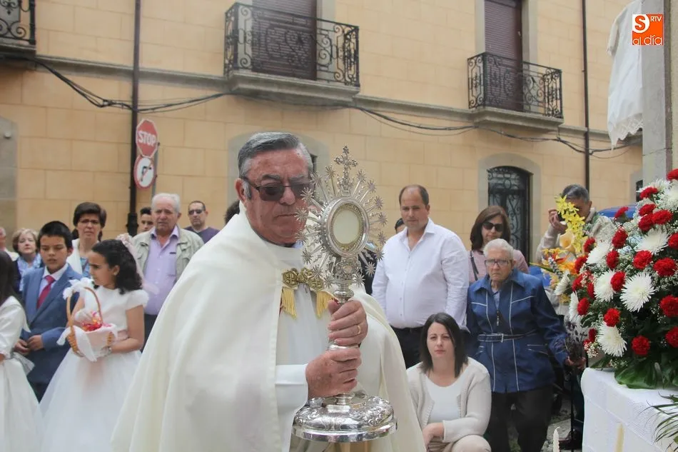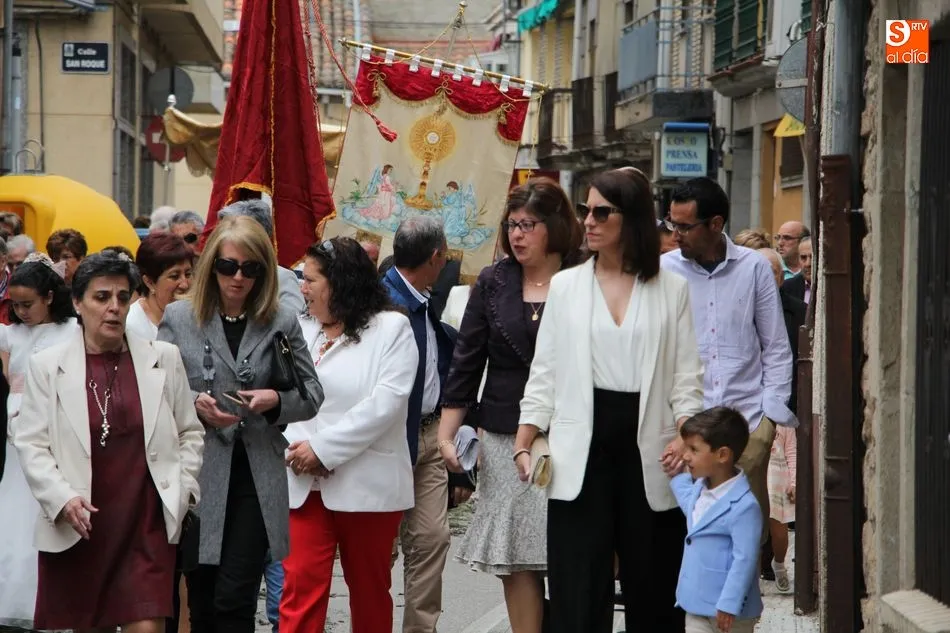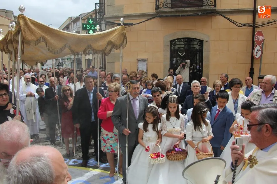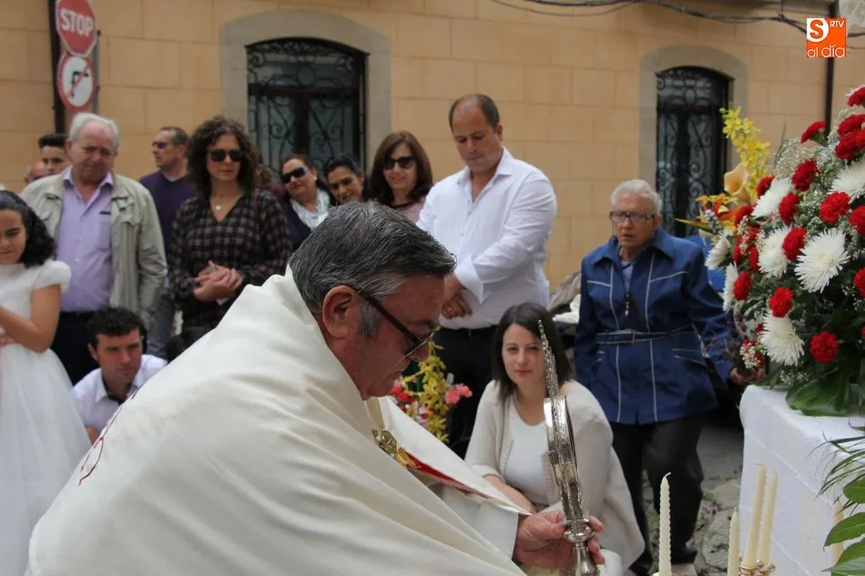 Fernando y Manuel Nieto, en su papel de mayordomos, presidian los actos religiosos en este día grande del Corpus. Tras la eucaristía daba comienzo la procesión por la calles, acto que estaba encabezado por la gaita y el tamboril de Jorge Sousa, tamborilero de la localidad; seguido por una veintena de niños y niñas que los domingos previos habían tomado la Primera Comunión.