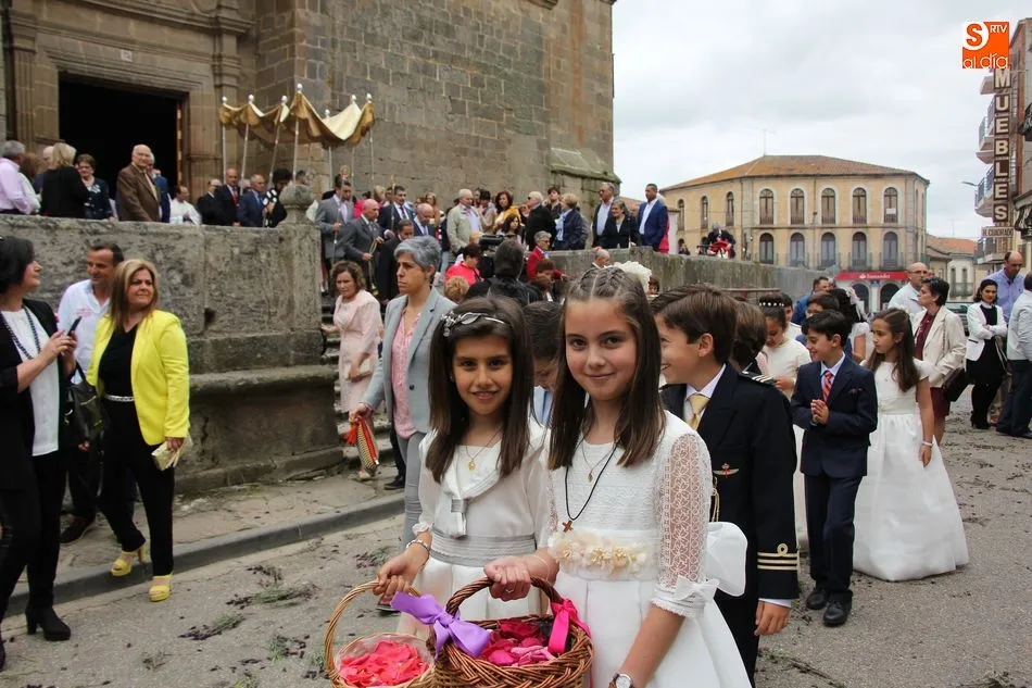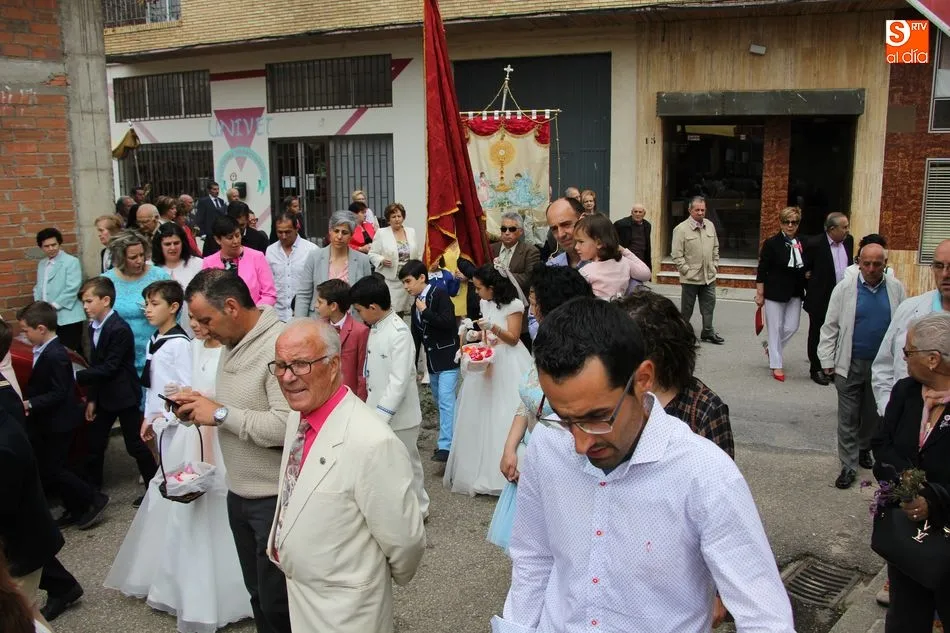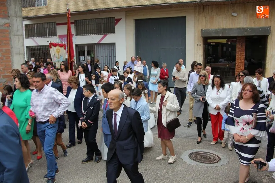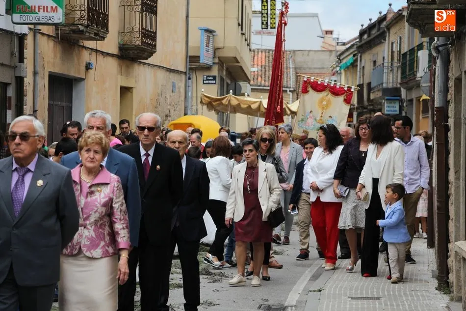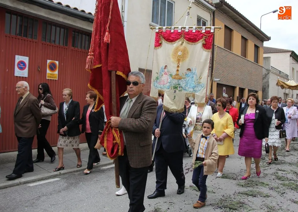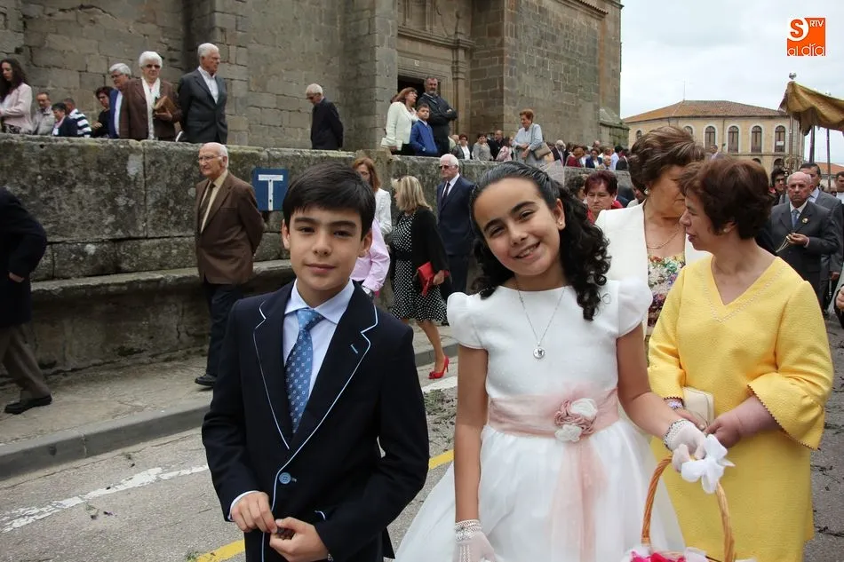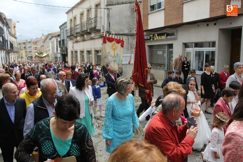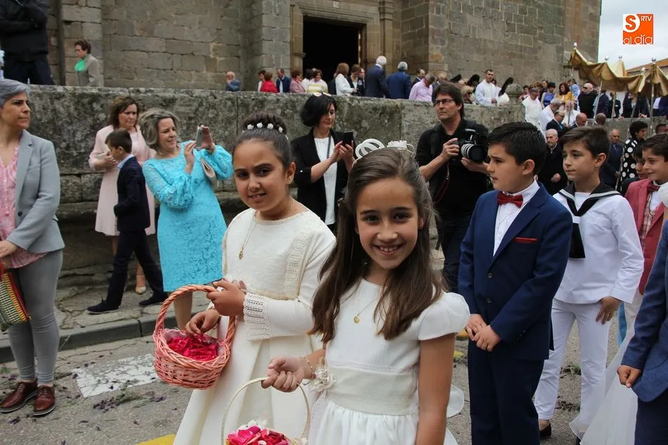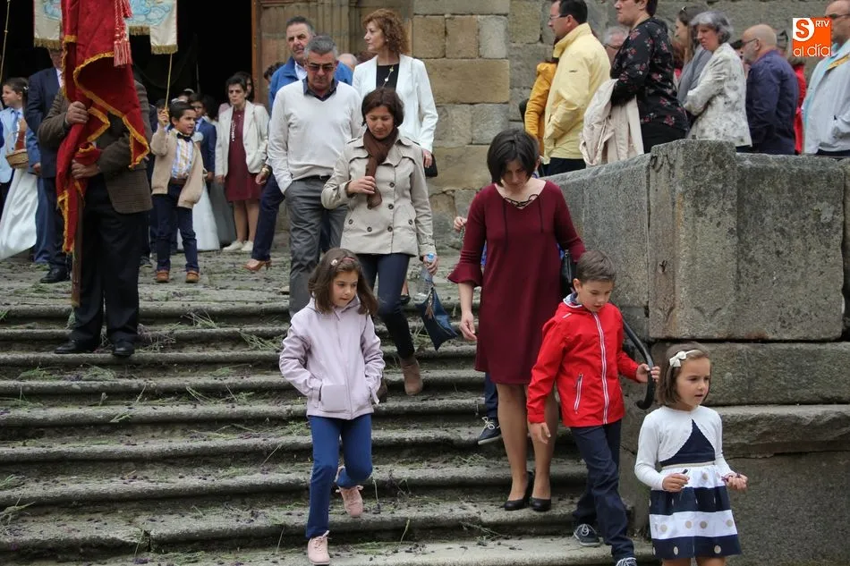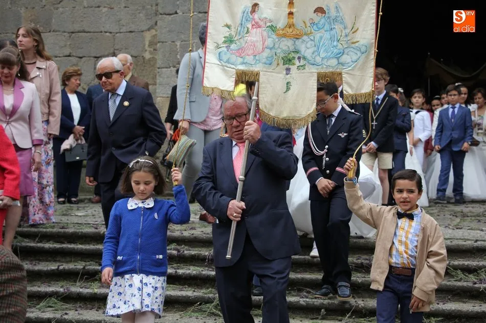 Fernando y Manuel Nieto, en su papel de mayordomos, presidian los actos religiosos en este día grande del Corpus. Tras la eucaristía daba comienzo la procesión por la calles, acto que estaba encabezado por la gaita y el tamboril de Jorge Sousa, tamborilero de la localidad; seguido por una veintena de niños y niñas que los domingos previos habían tomado la Primera Comunión.