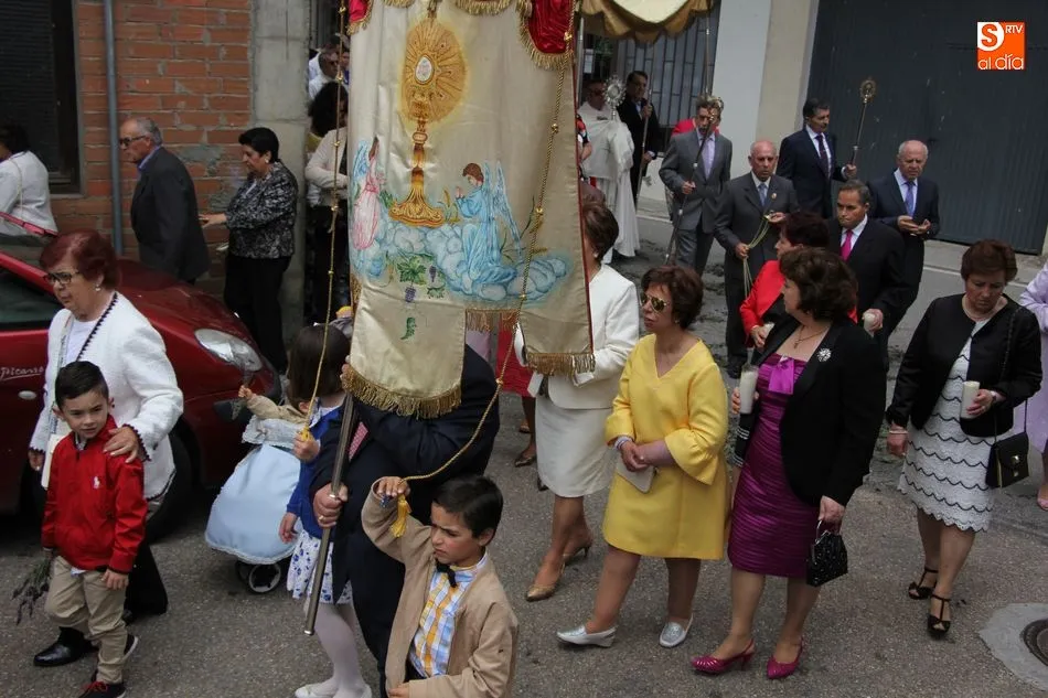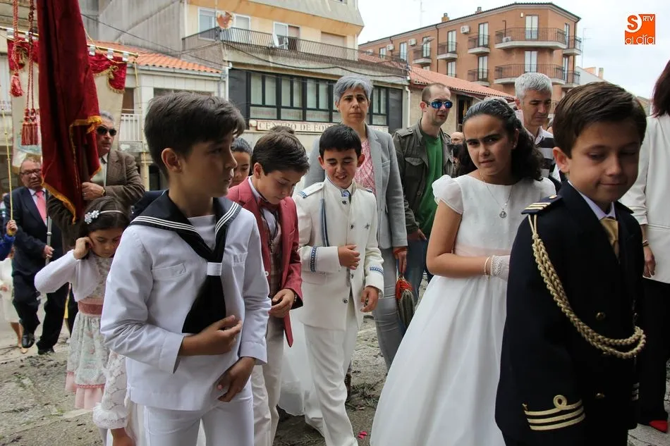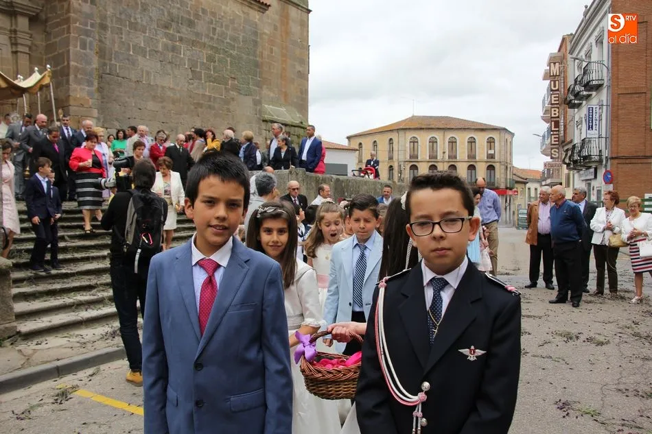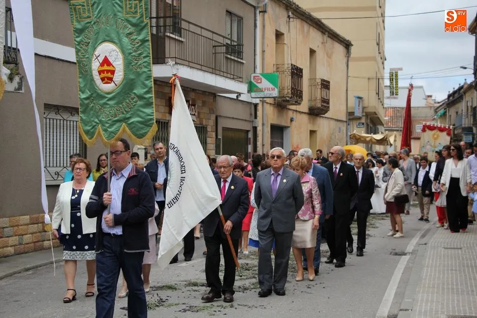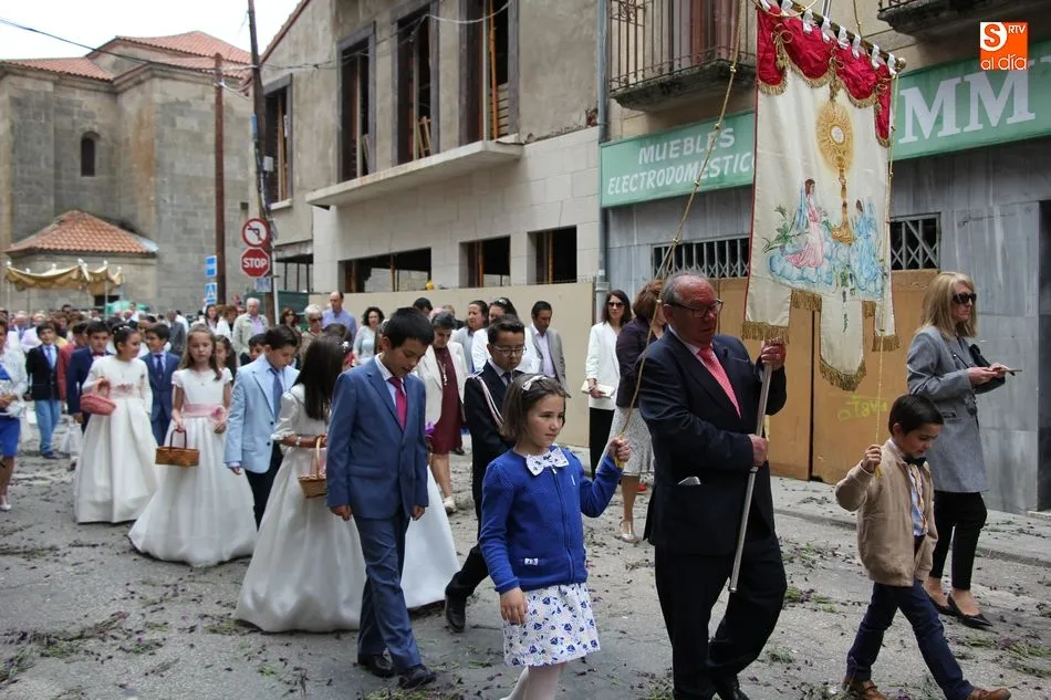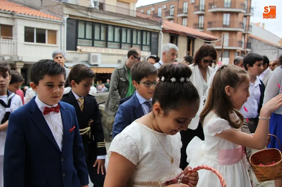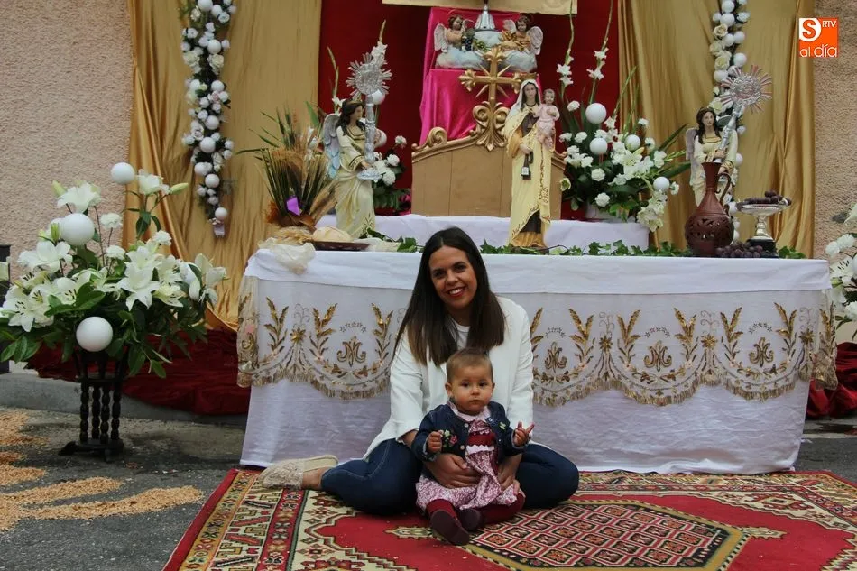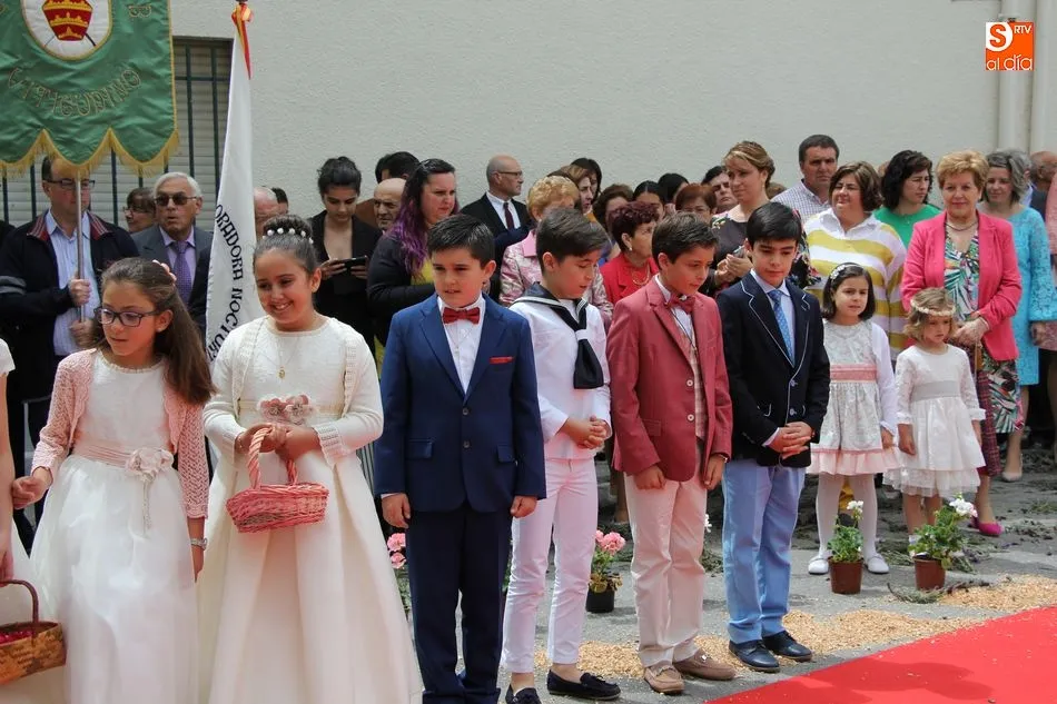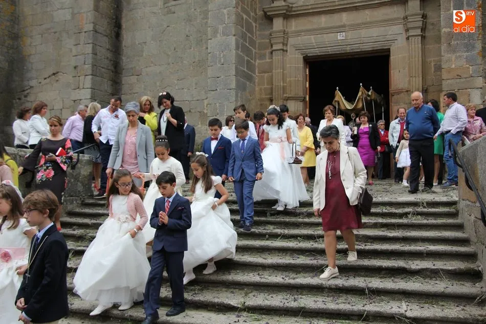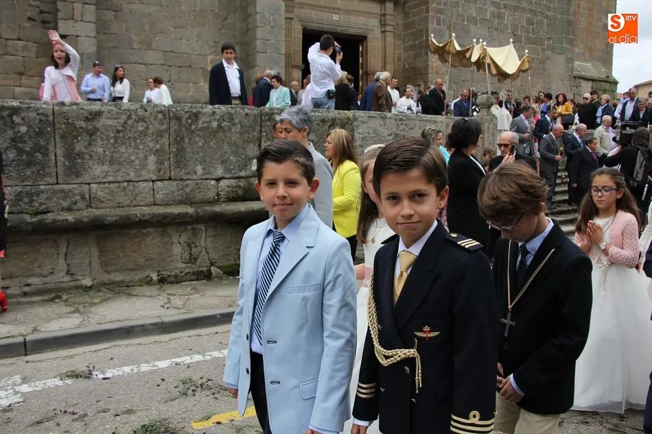 Fernando y Manuel Nieto, en su papel de mayordomos, presidian los actos religiosos en este día grande del Corpus. Tras la eucaristía daba comienzo la procesión por la calles, acto que estaba encabezado por la gaita y el tamboril de Jorge Sousa, tamborilero de la localidad; seguido por una veintena de niños y niñas que los domingos previos habían tomado la Primera Comunión.