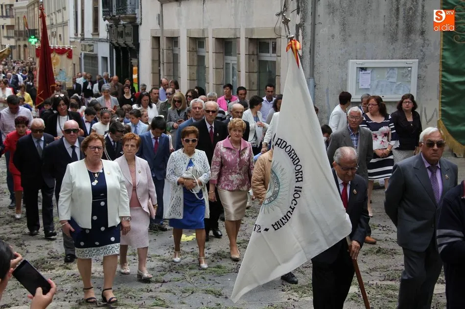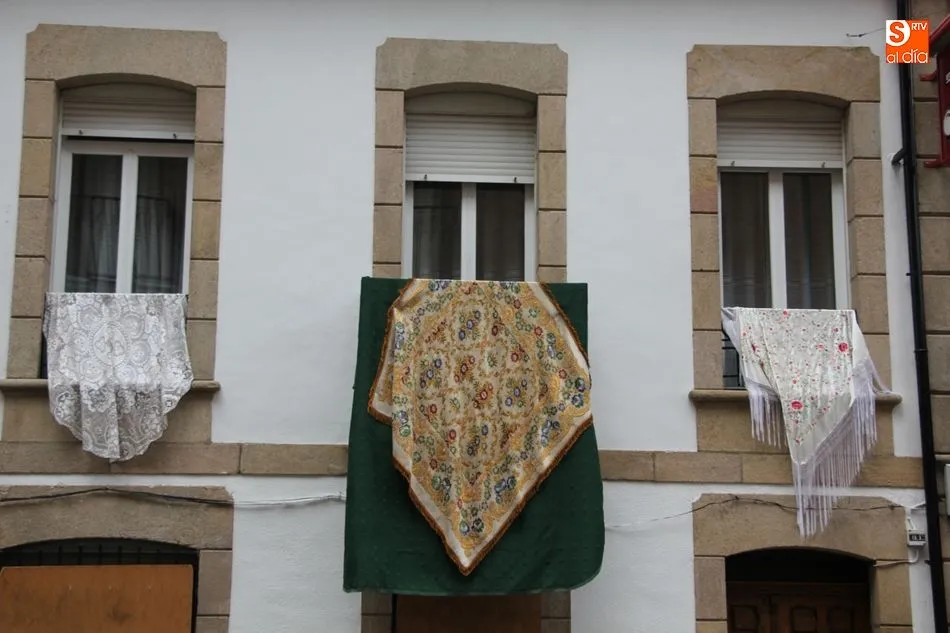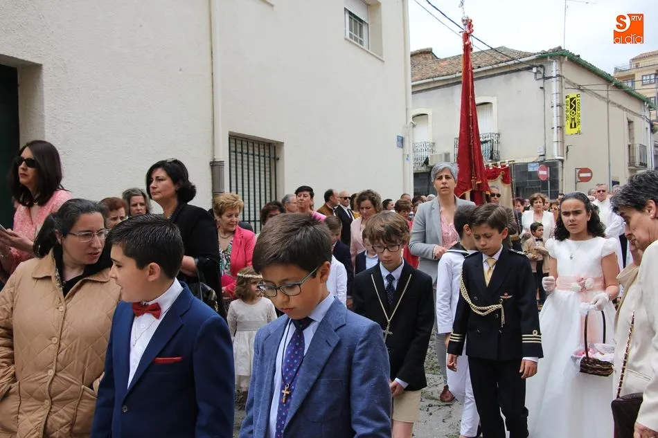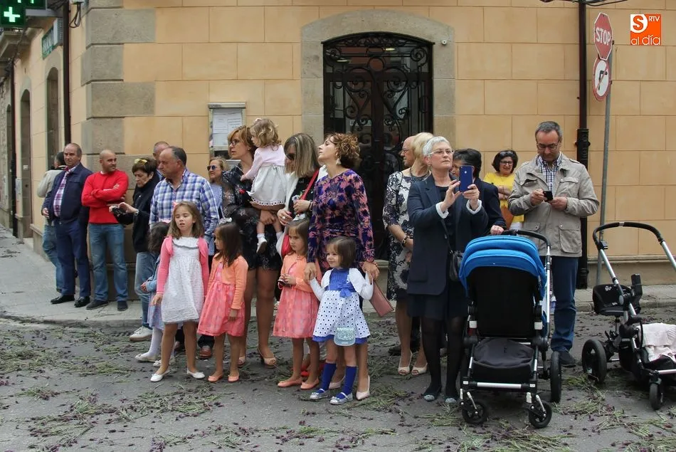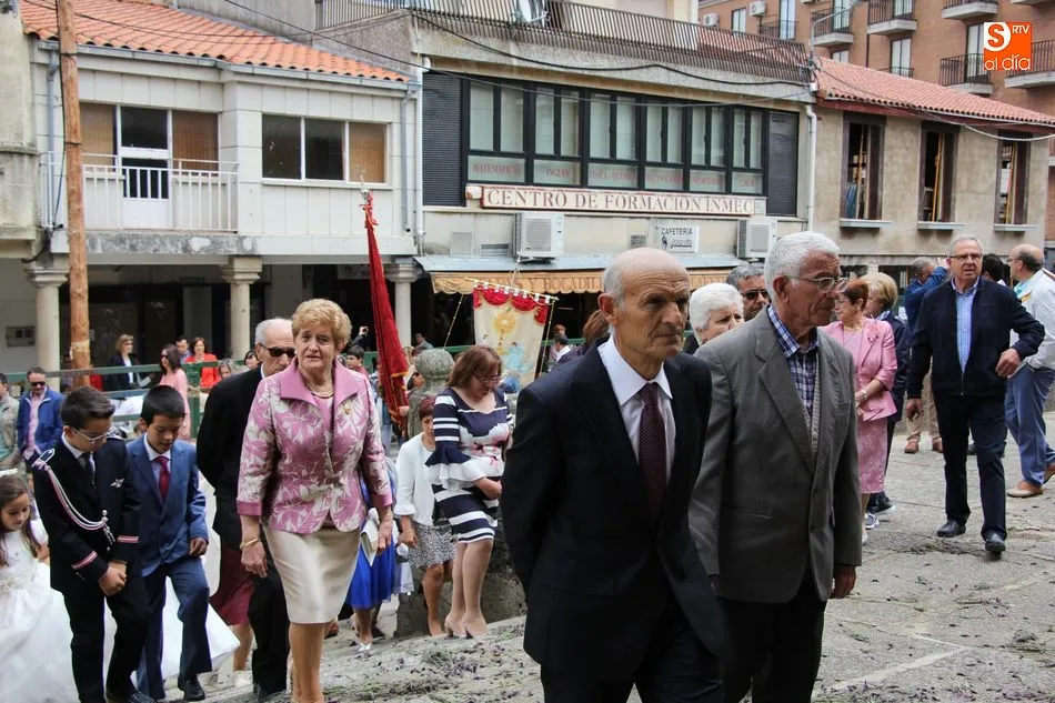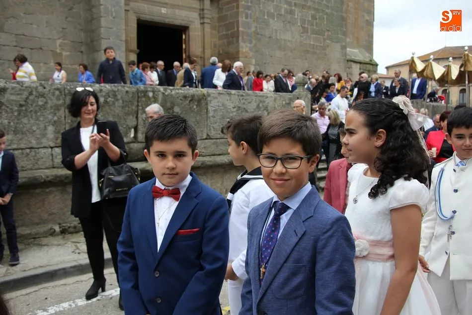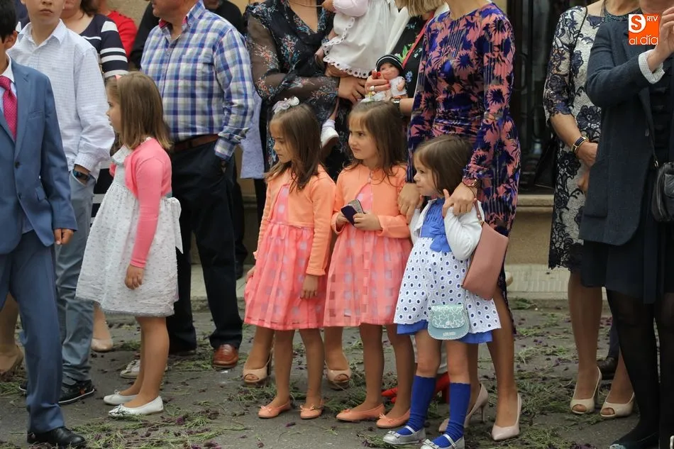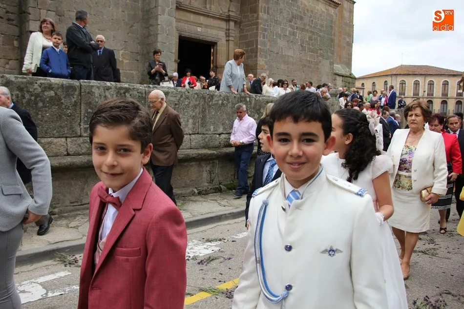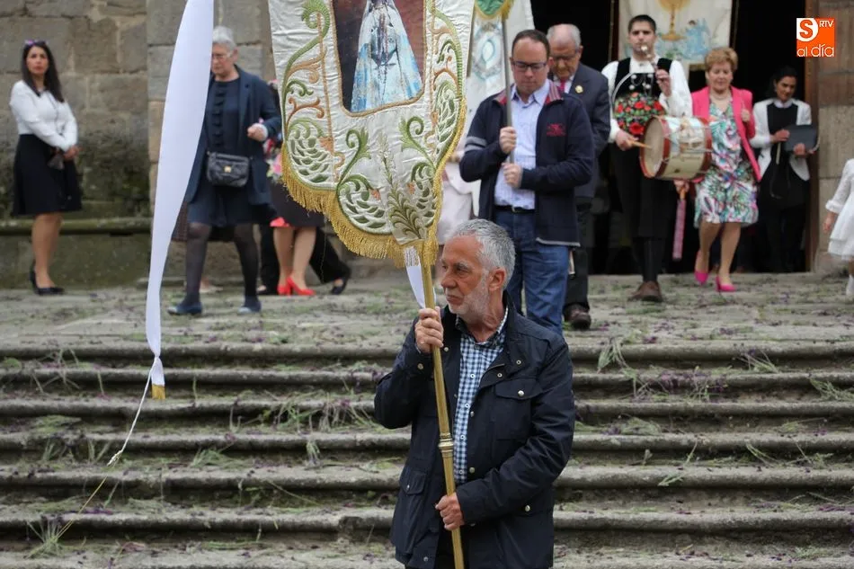 Fernando y Manuel Nieto, en su papel de mayordomos, presidian los actos religiosos en este día grande del Corpus. Tras la eucaristía daba comienzo la procesión por la calles, acto que estaba encabezado por la gaita y el tamboril de Jorge Sousa, tamborilero de la localidad; seguido por una veintena de niños y niñas que los domingos previos habían tomado la Primera Comunión.
