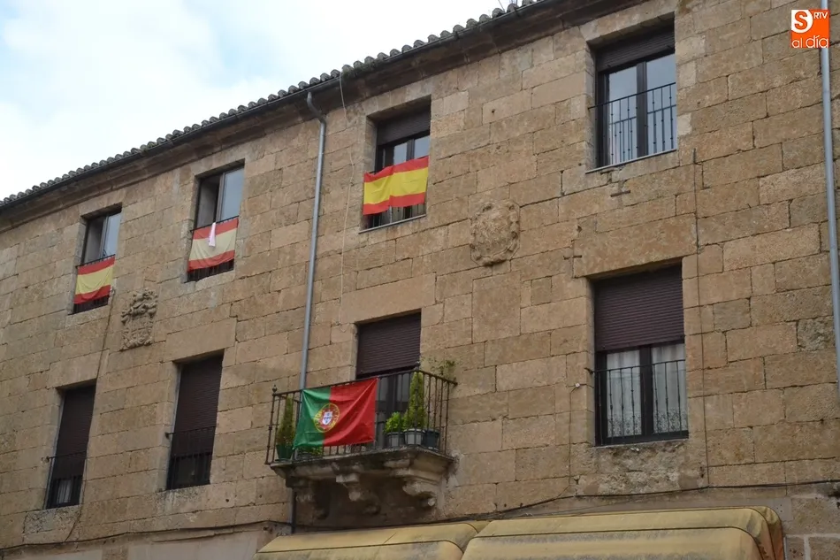 Eso sí, esta vez no están solas, ya que esas banderas españolas situadas especialmente en balcones de la Plaza Mayor, pero también en la Rúa del Sol, en la calle Cardenal Pacheco o en la calle Julián Sánchez, están acompañadas de banderas de Portugal, algo que ya ocurrió a finales del mes de abril.