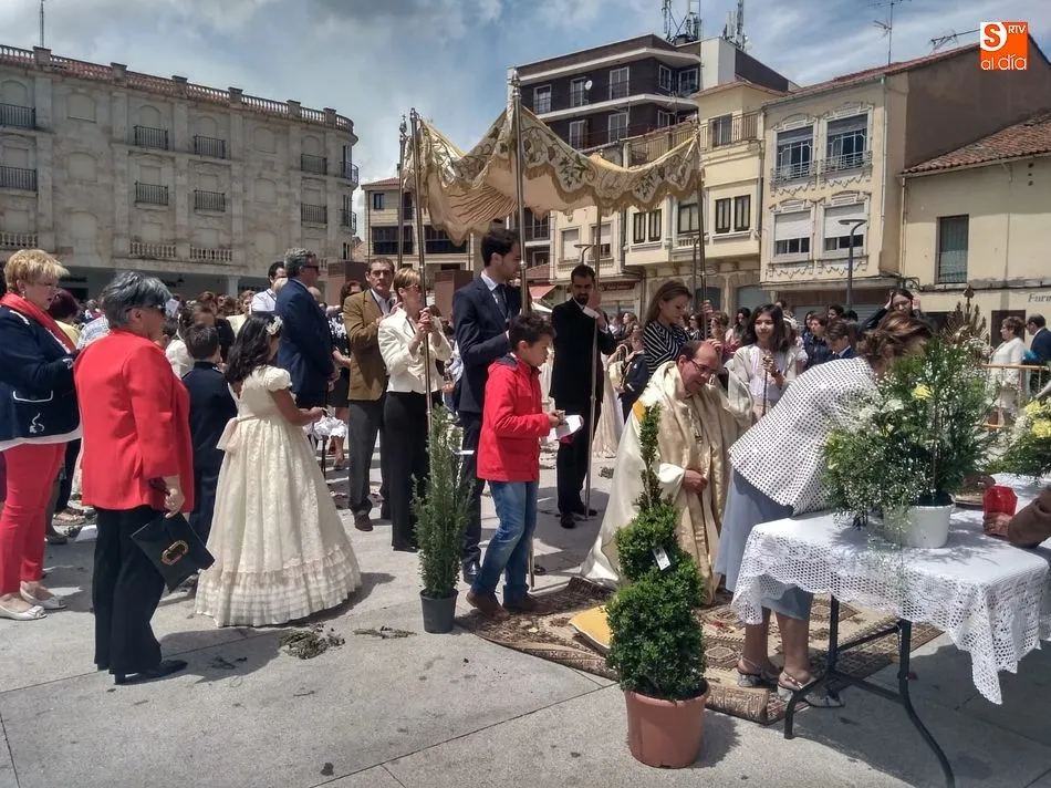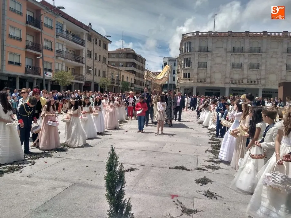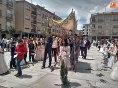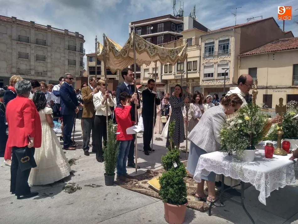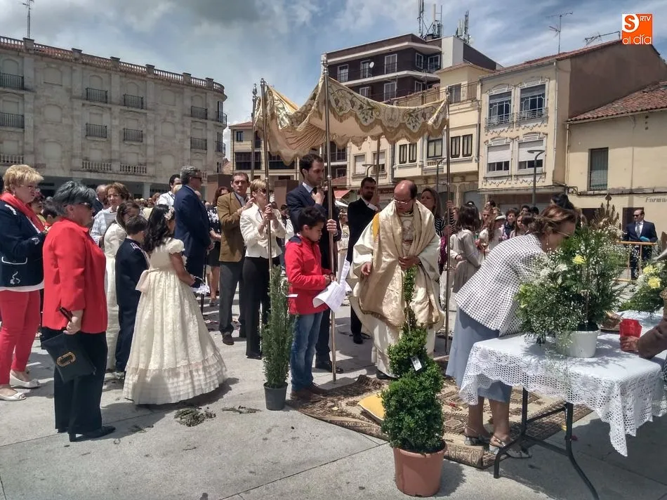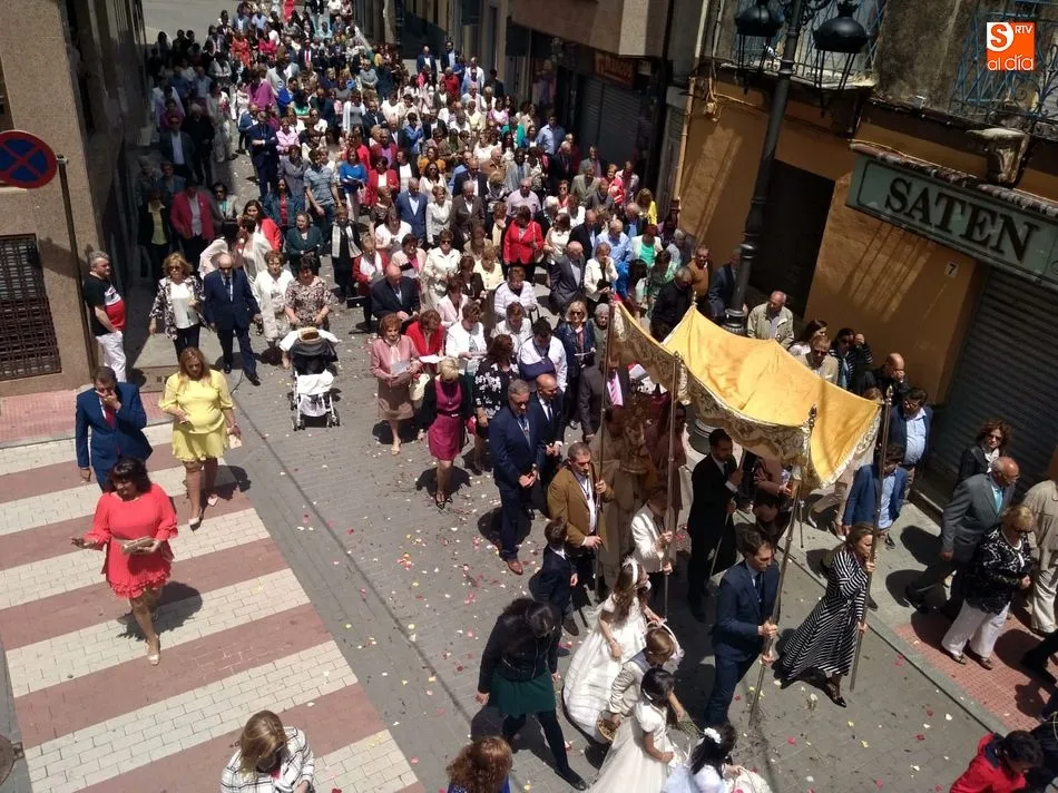 chó, como es tradición, bajo palio durante la marcha. En los soportales del nuevo ayuntamiento estaba instalado el altar en el que se cumplió con la tradición de la bendición para los pequeños a cargo del párroco, Amable Criado. Una vez finalizado el acto religioso, se regresó al templo con todos los participantes.