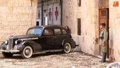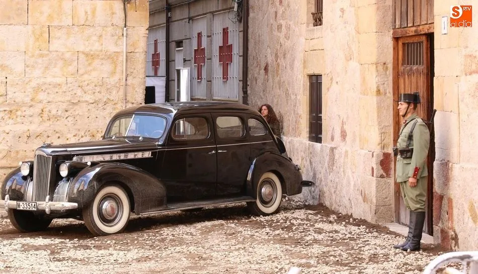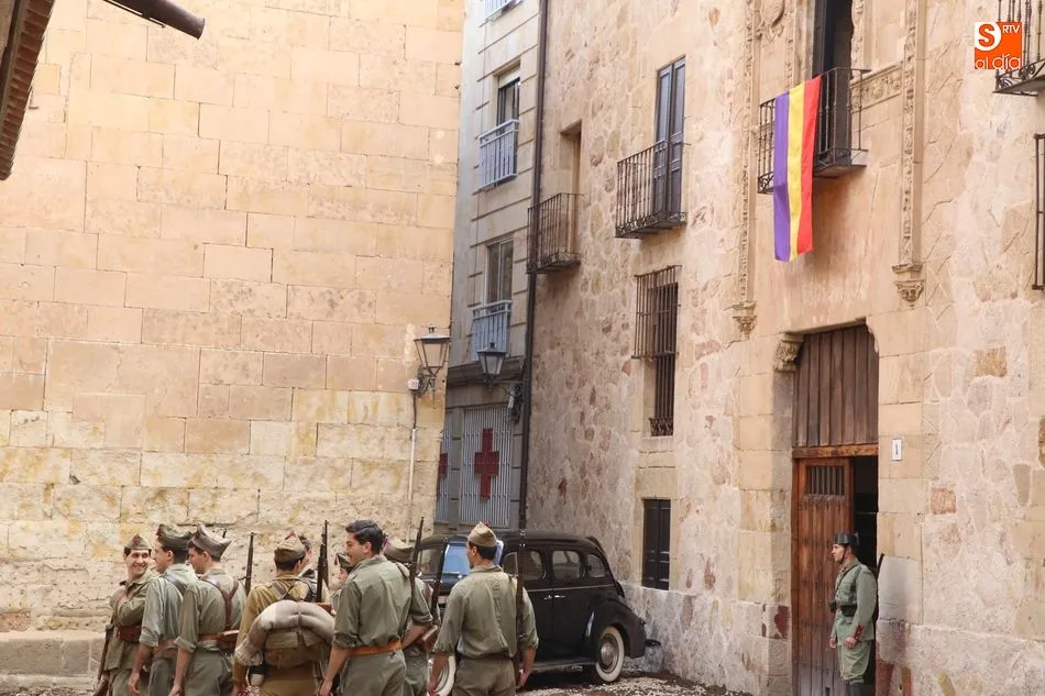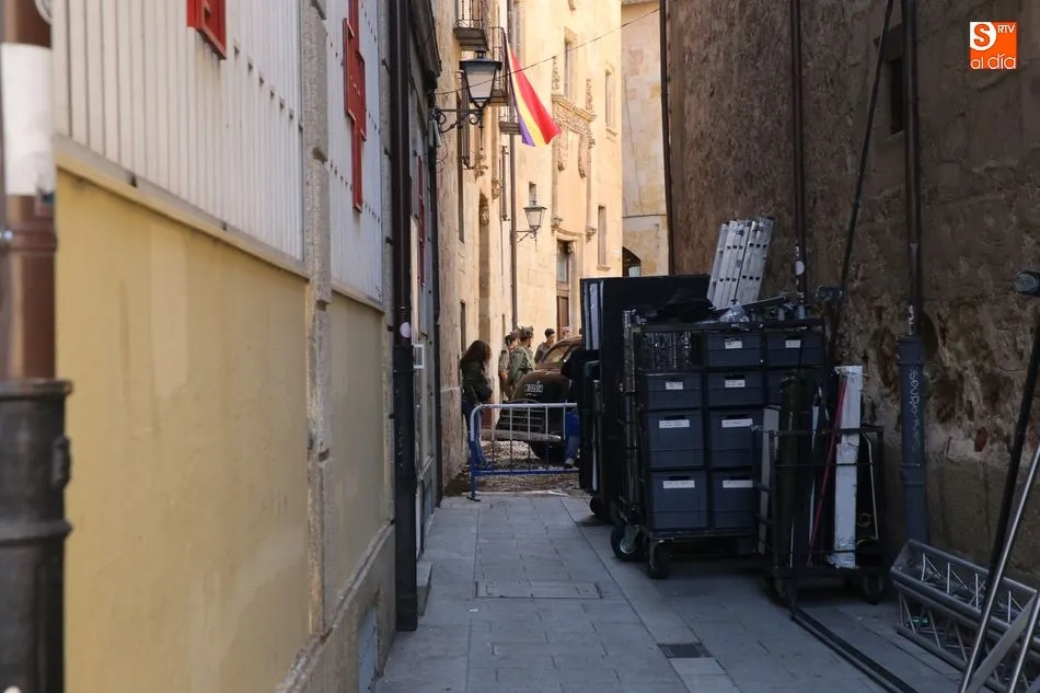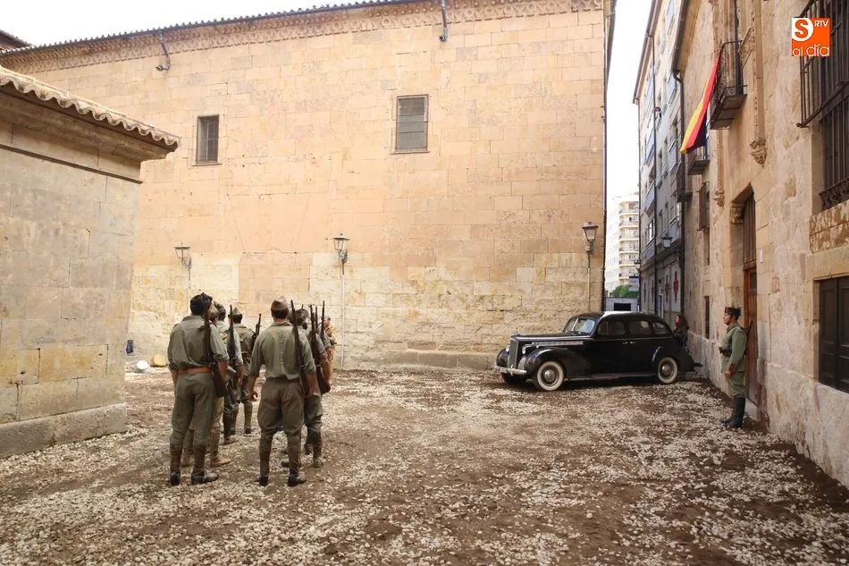 El rodaje de la película ?Mientras dure la guerra?, que dirige Alejandro Amenábar, se ha trasladado este jueves a la plaza San Benito, donde una bandera republicana lucía en el balcón del Palacio de Maldonado. Además, el suelo se ha llenado de tierra y por la zona circulaban coches de época y figurantes vestidos como soldados.