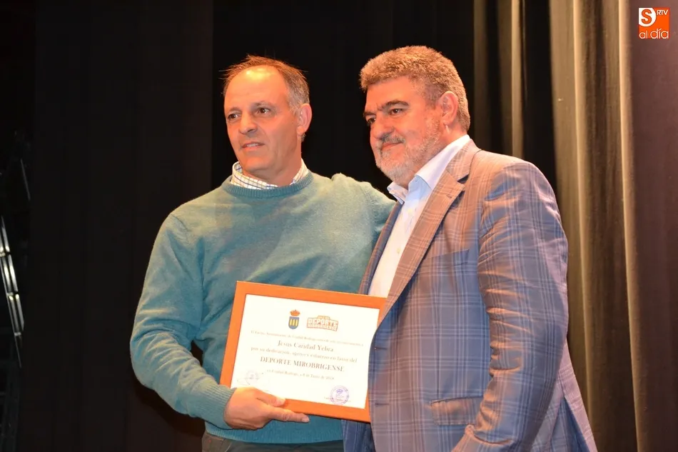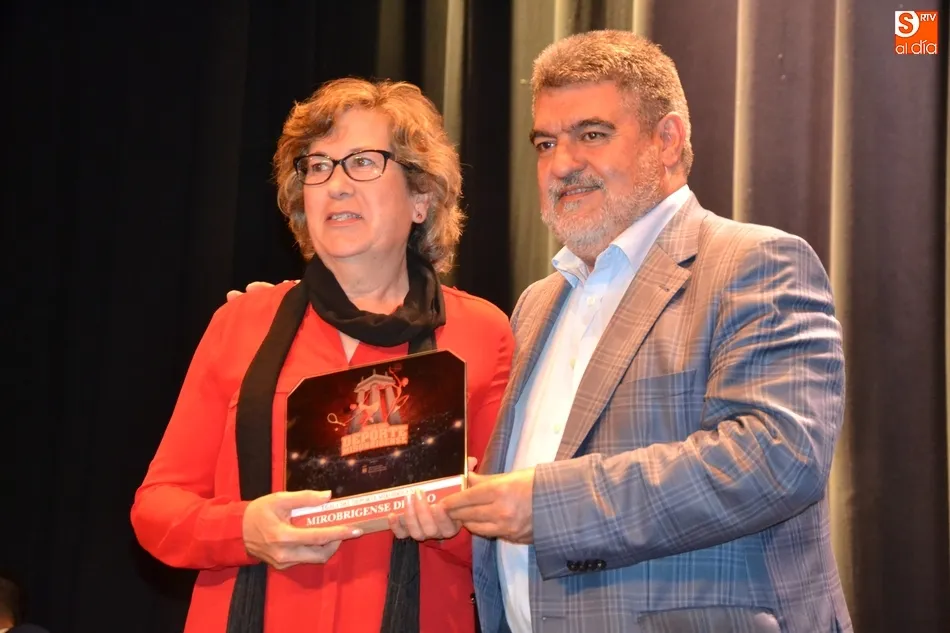 Y por otro, se concedió el galardón estrella, bautizado como Mirobrigense de Oro, que ha ido a parar al atleta Álvaro de Arriba, quien no pudo estar presente en la Gala ya que se encontraba a muchos kilómetros de distancia, en Huelva, donde disputó una carrera justo a la misma hora que la Gala. De forma previa a la carrera, envió un vídeo de agradecimiento que fue proyectado en el Teatro. En su lugar, recogió su premio su madre, quién ya sabía que su hijo acababa de quedar 2º en esa prueba onubense firmando su mejor marca de siempre.