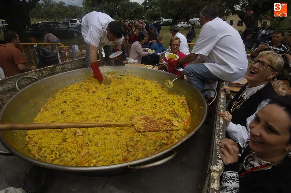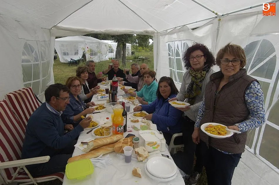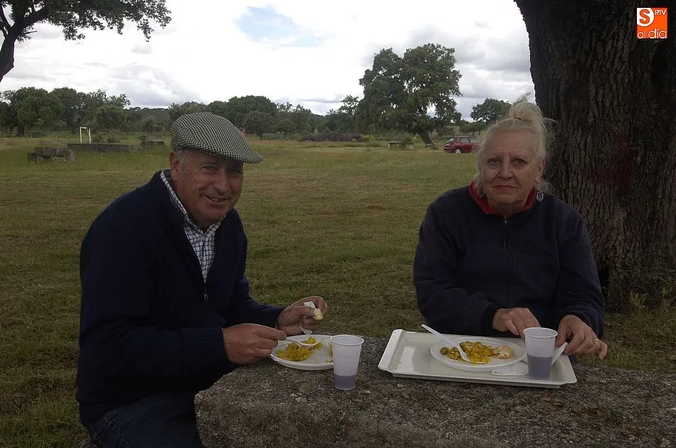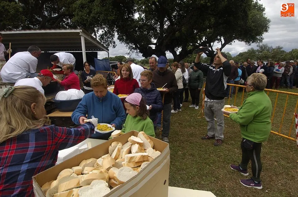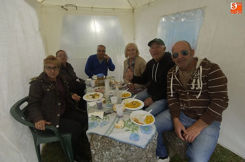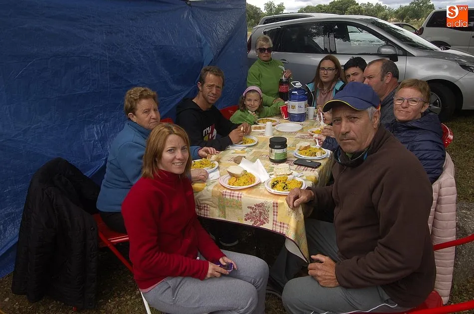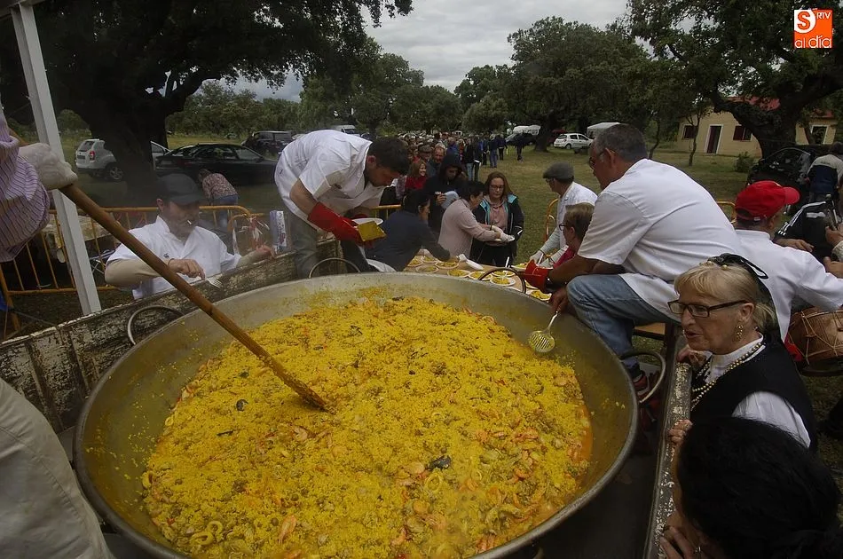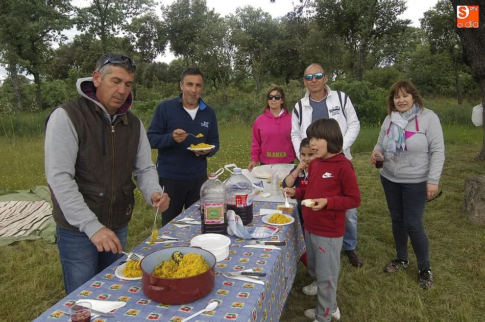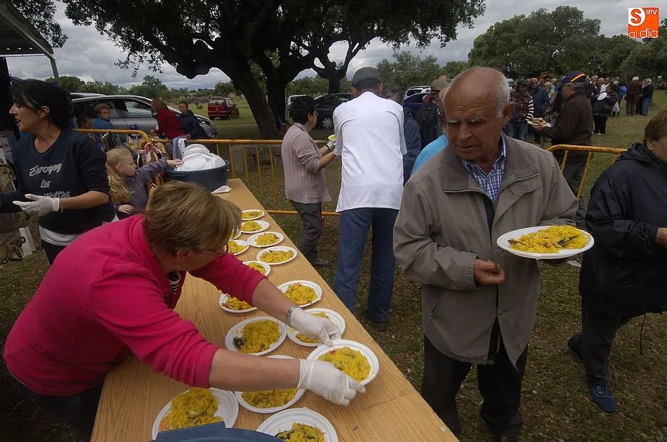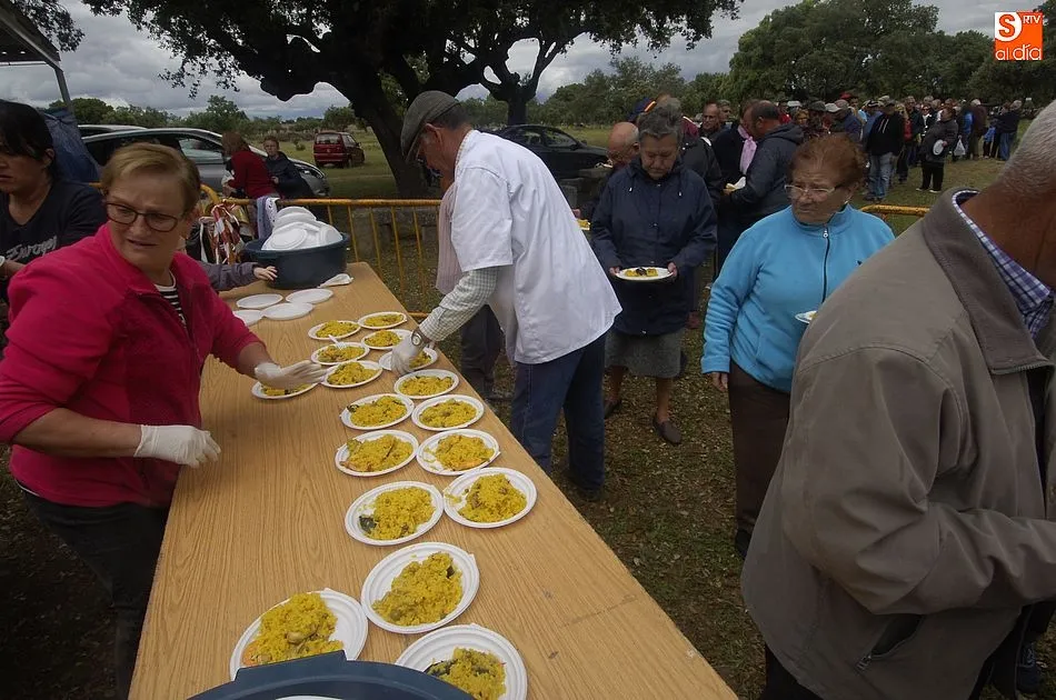 El punto central de esta jornada de convivencia es la comida al aire libre a base de paella, que este año no fue preparada en el campo al no poder hacer fuego, siendo llevada ya lista en un camión hasta el lugar, donde fue repartida entre todos los que allí congregados, que la degustaron en familia o con amigos.