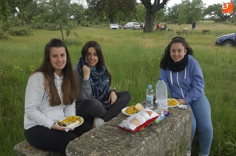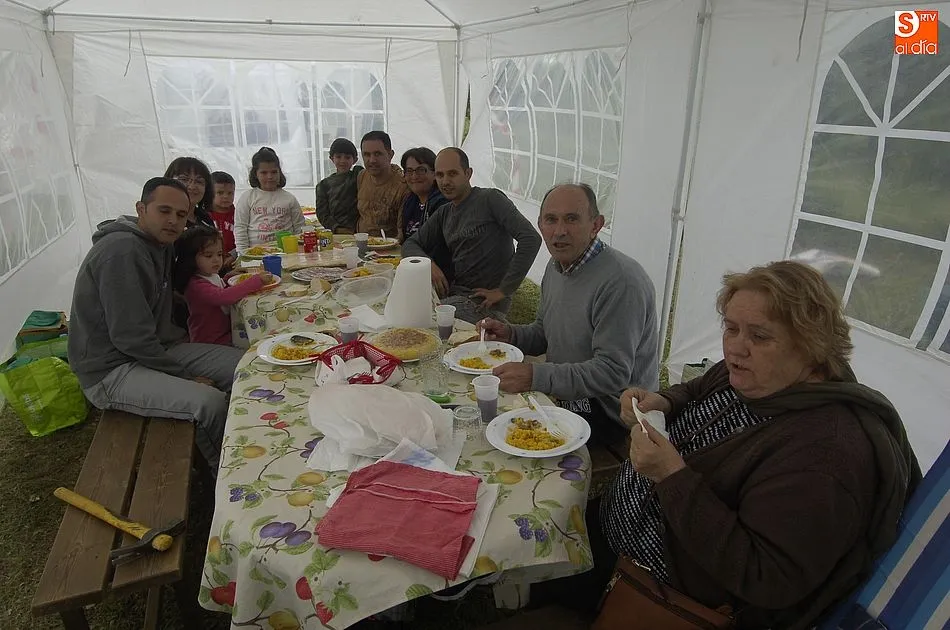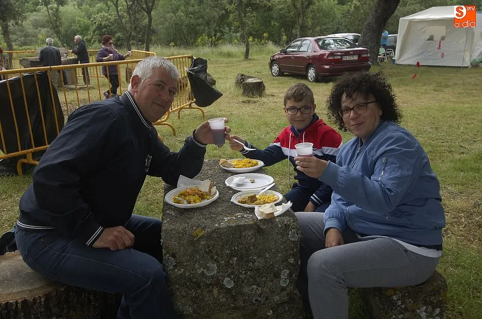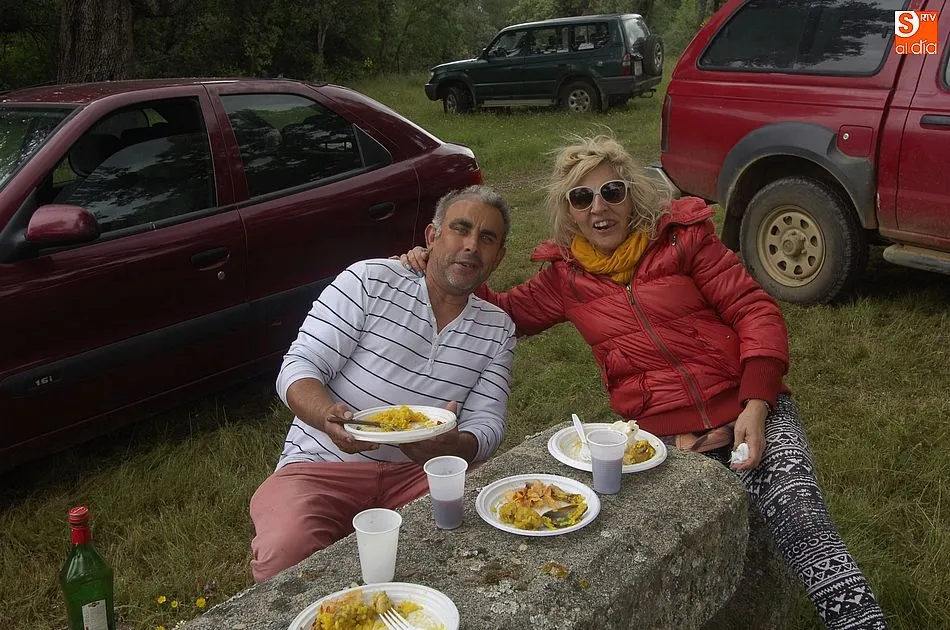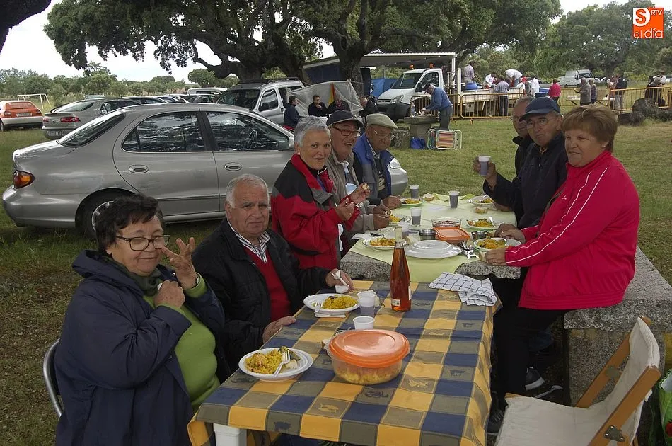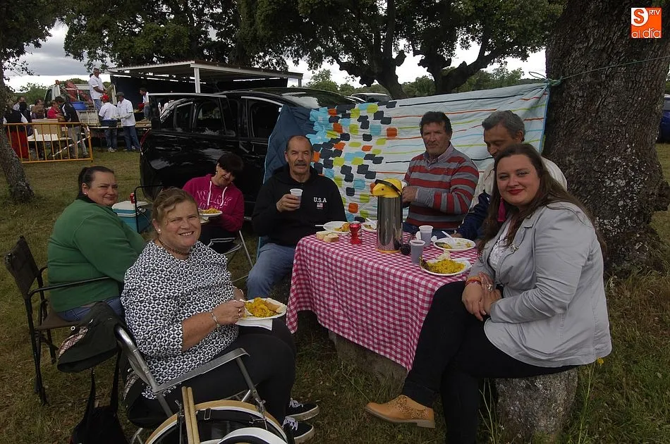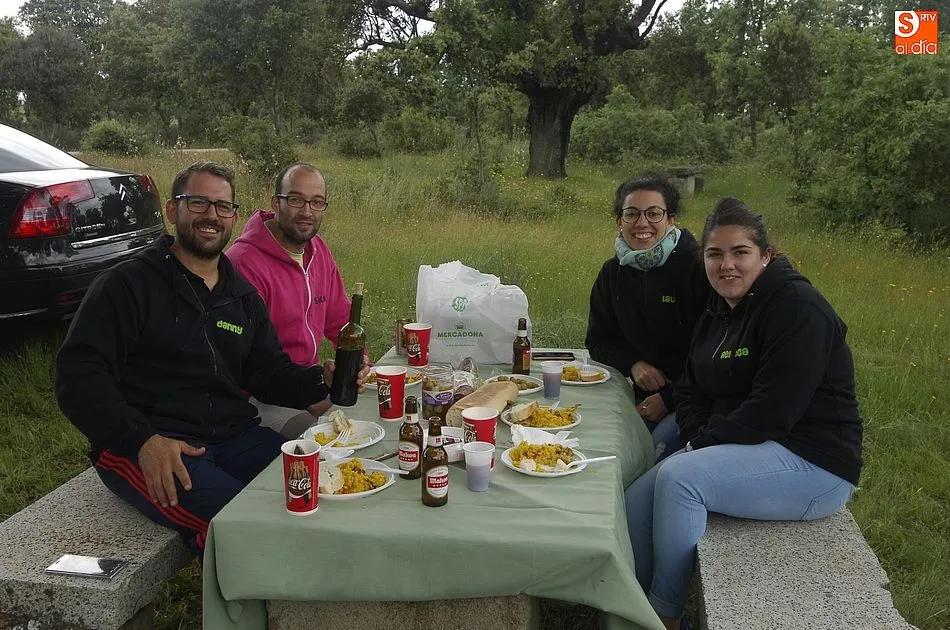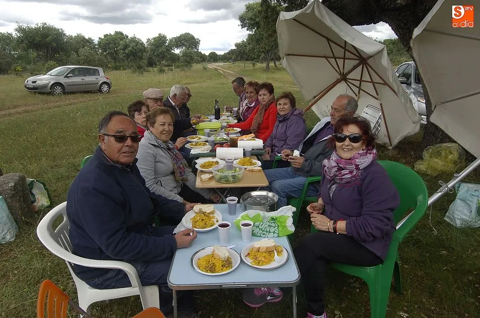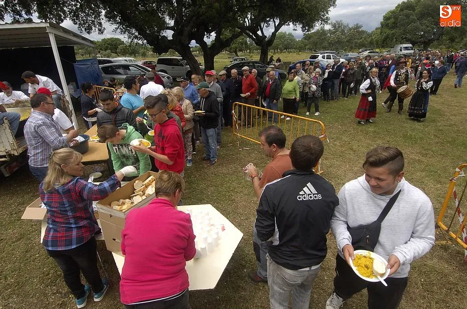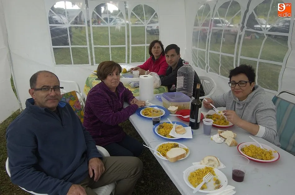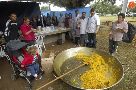 El punto central de esta jornada de convivencia es la comida al aire libre a base de paella, que este año no fue preparada en el campo al no poder hacer fuego, siendo llevada ya lista en un camión hasta el lugar, donde fue repartida entre todos los que allí congregados, que la degustaron en familia o con amigos.