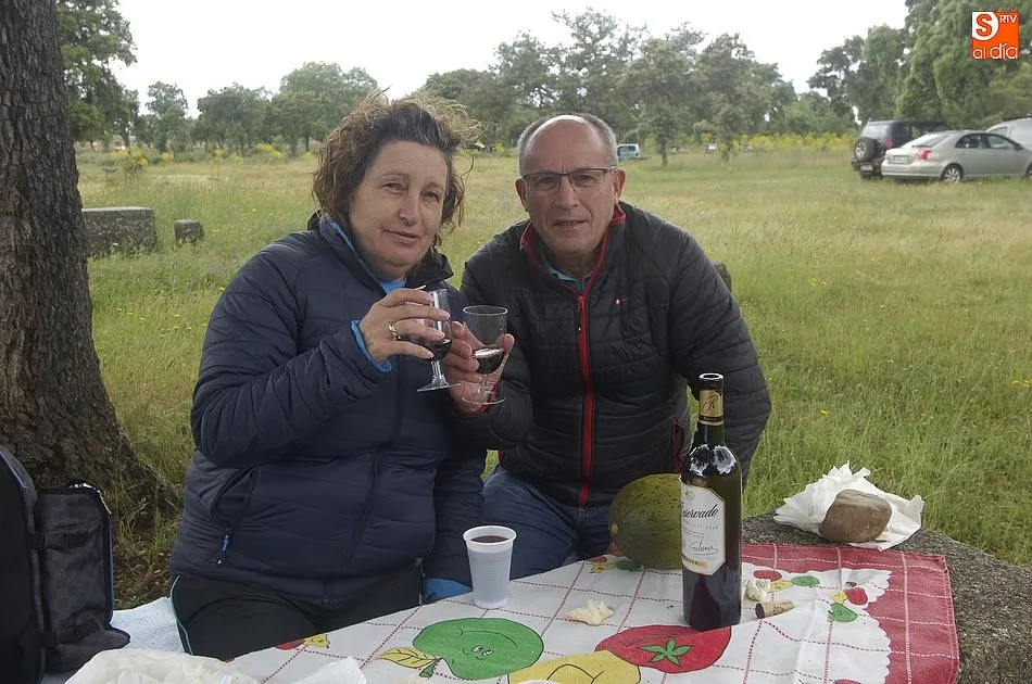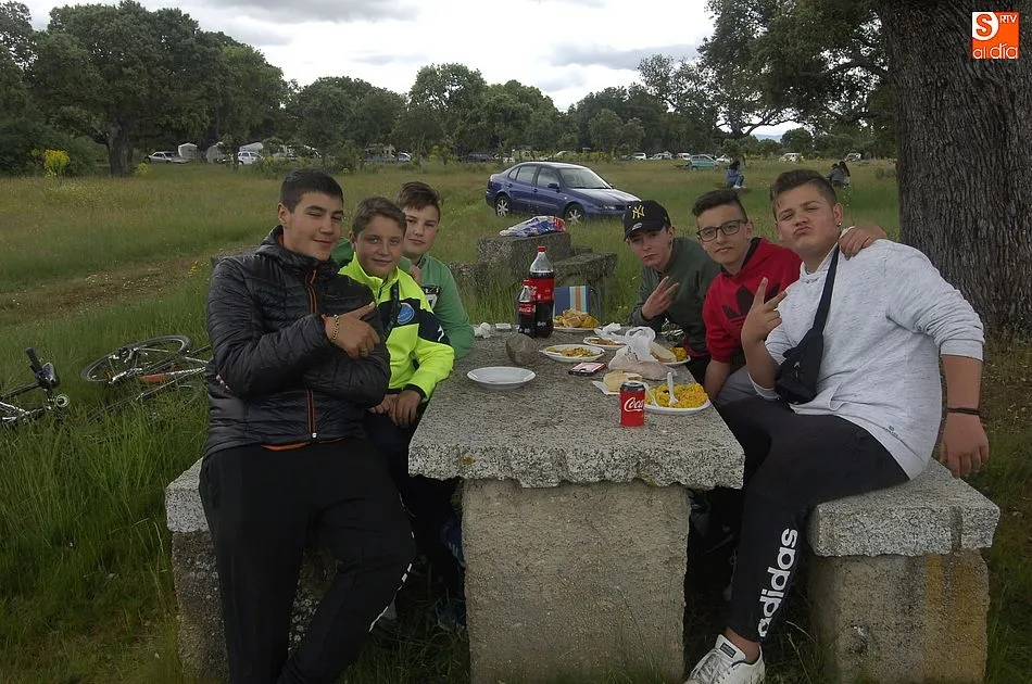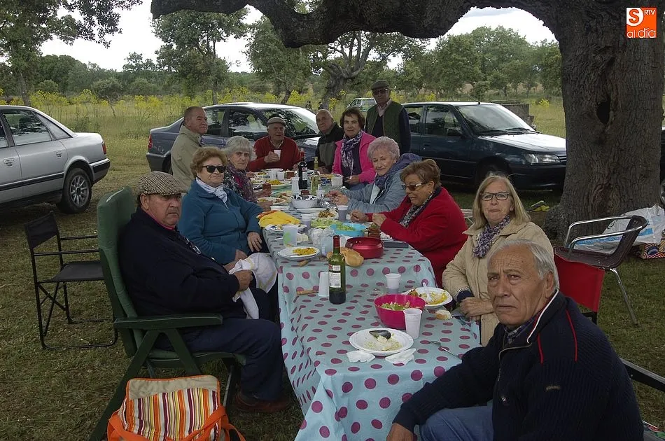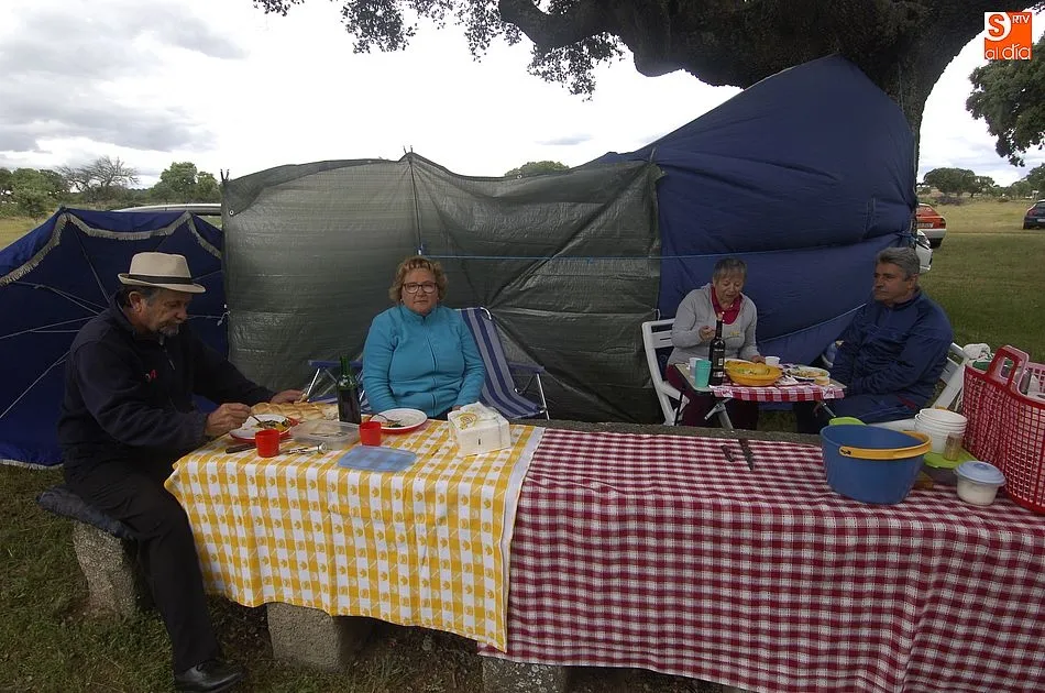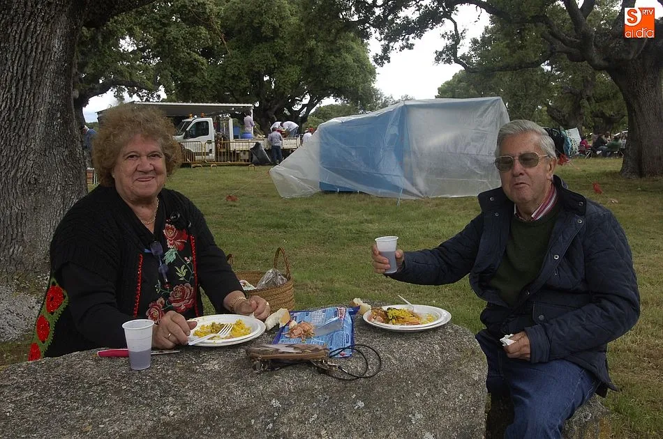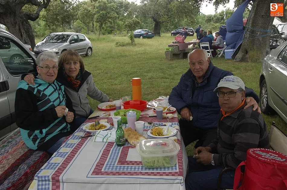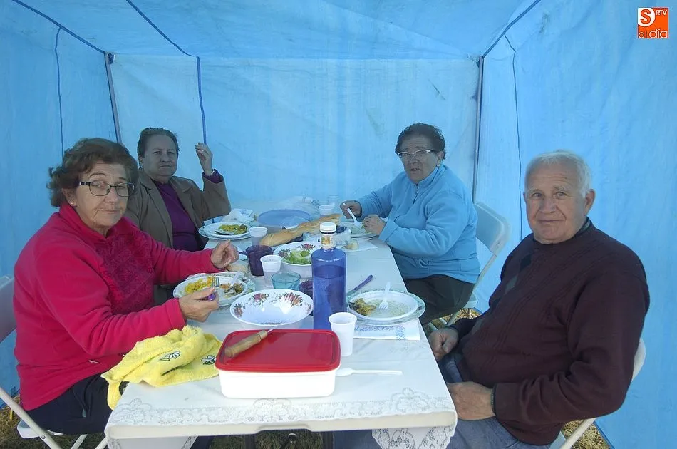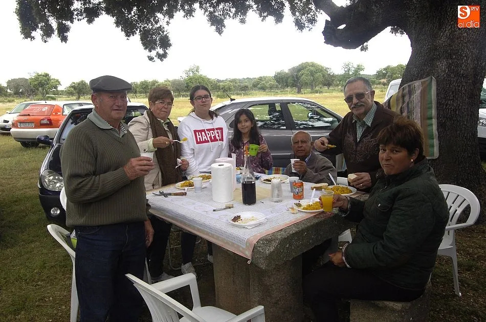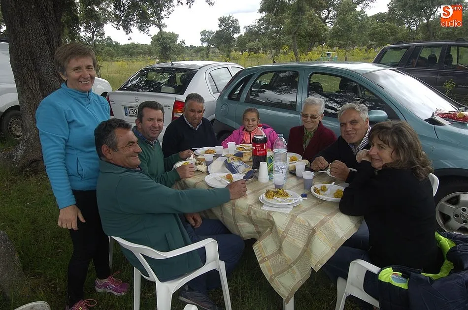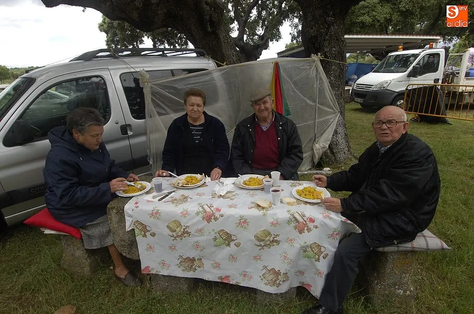 El punto central de esta jornada de convivencia es la comida al aire libre a base de paella, que este año no fue preparada en el campo al no poder hacer fuego, siendo llevada ya lista en un camión hasta el lugar, donde fue repartida entre todos los que allí congregados, que la degustaron en familia o con amigos.