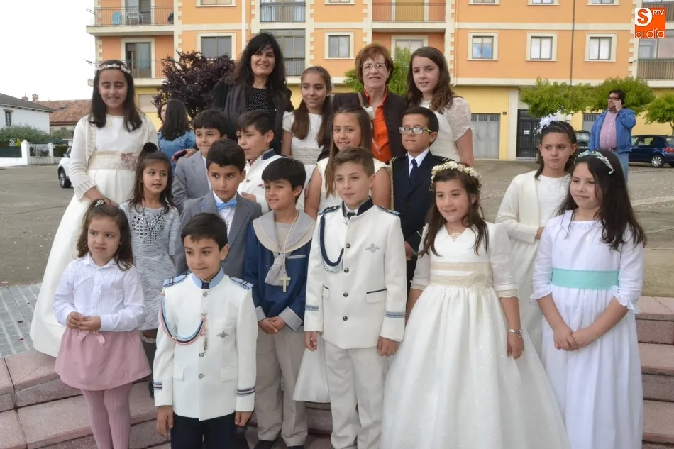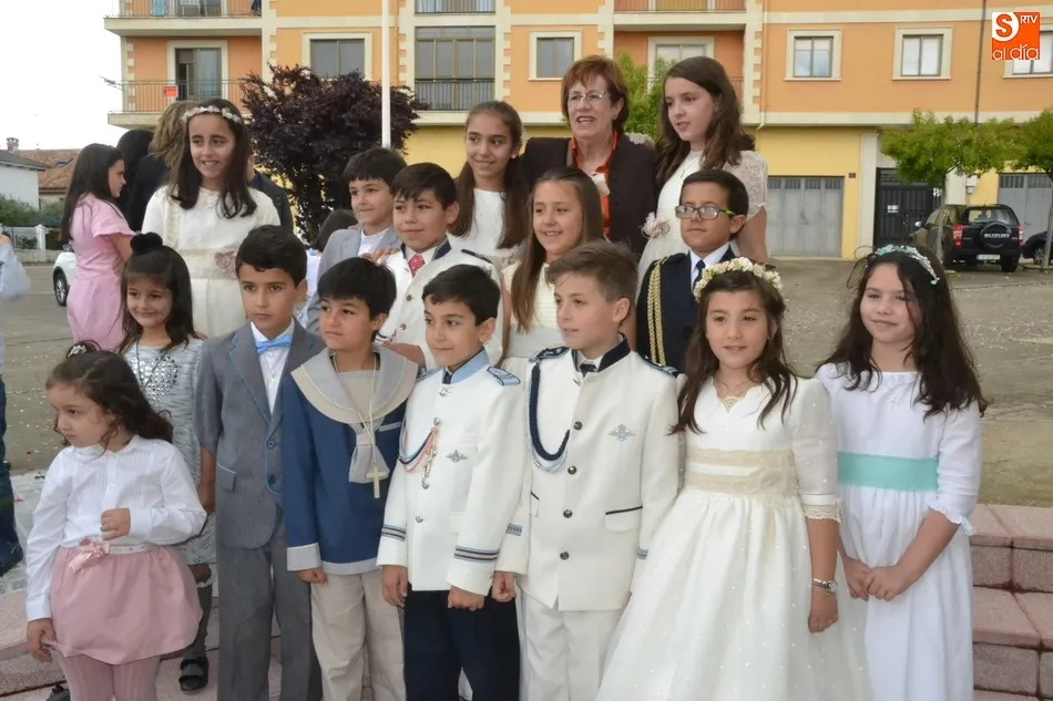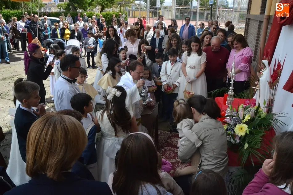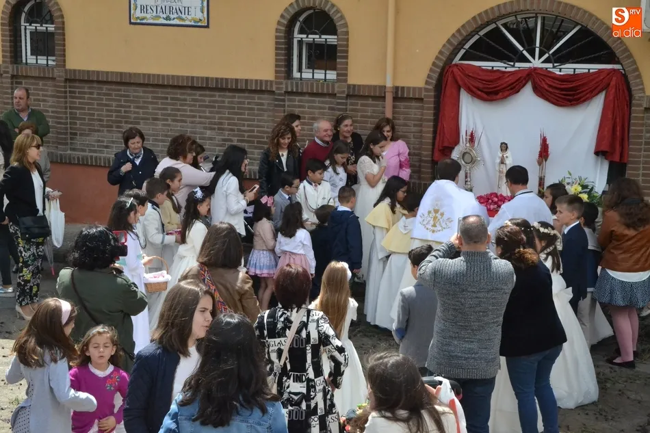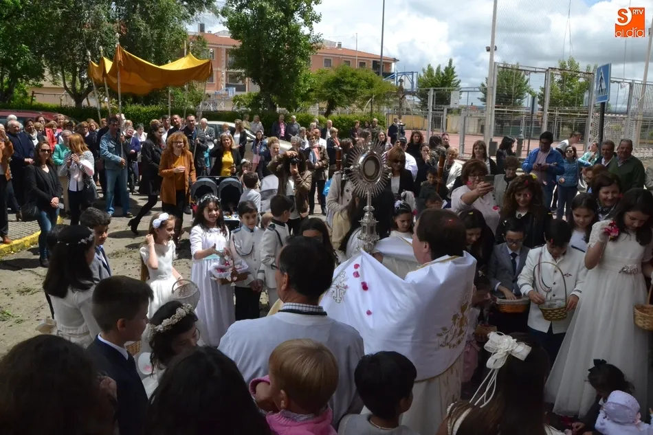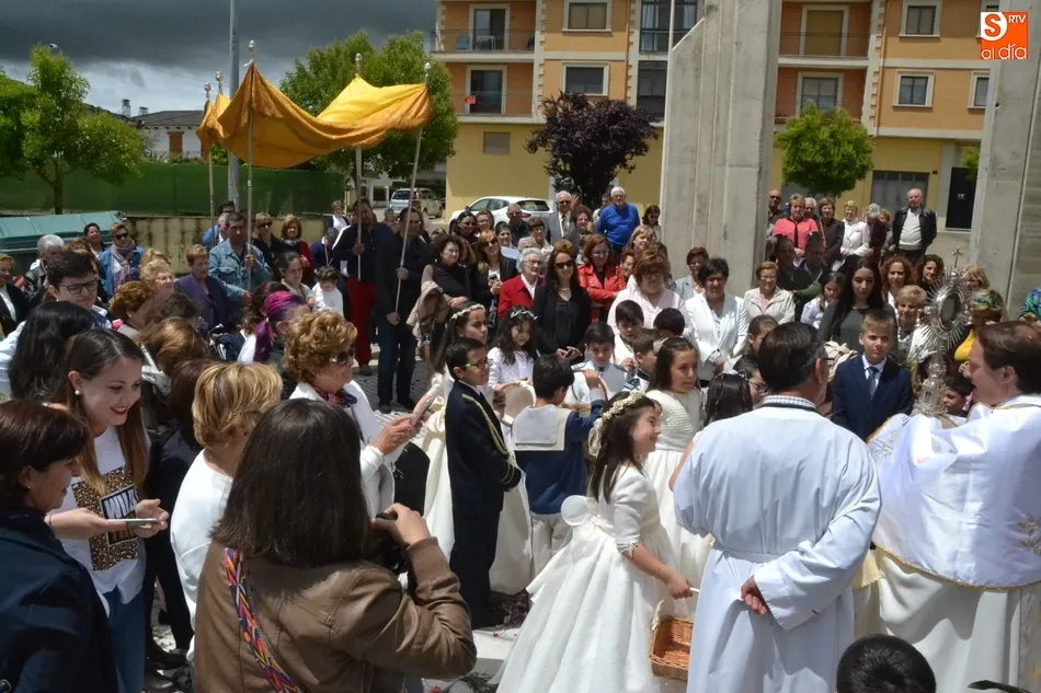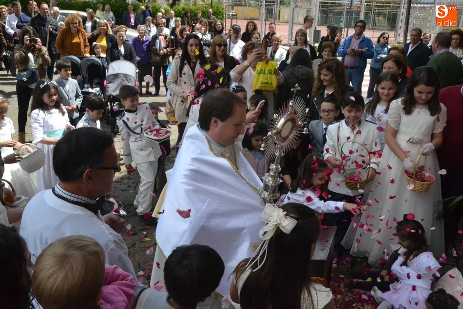 Mientras el Santísimo era introducido en la Iglesia, llegó el turno de hacer unas fotos de familia de los niños de Primera Comunión con dos profesoras del Colegio Misioneras-Santa Teresa. Apenas diez segundos después de la toma de esas fotografías se puso a llover con bastante fuerza, siendo necesario abrir rápidamente los paraguas, o ir corriendo a los vehículos aparcados en las inmediaciones.