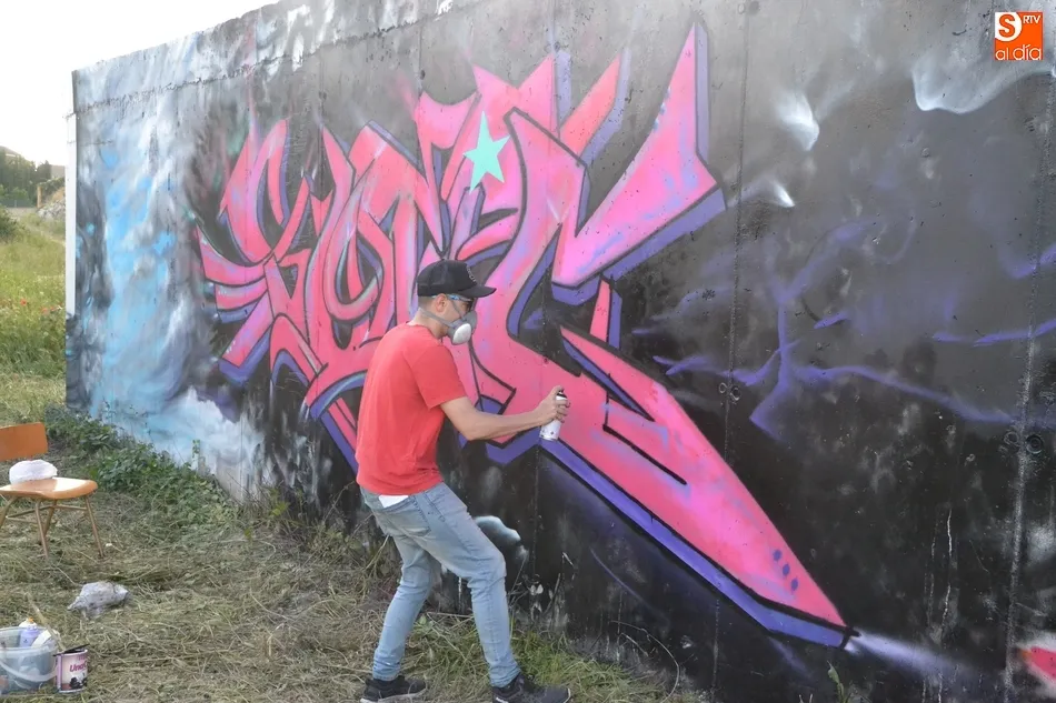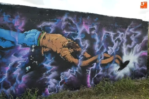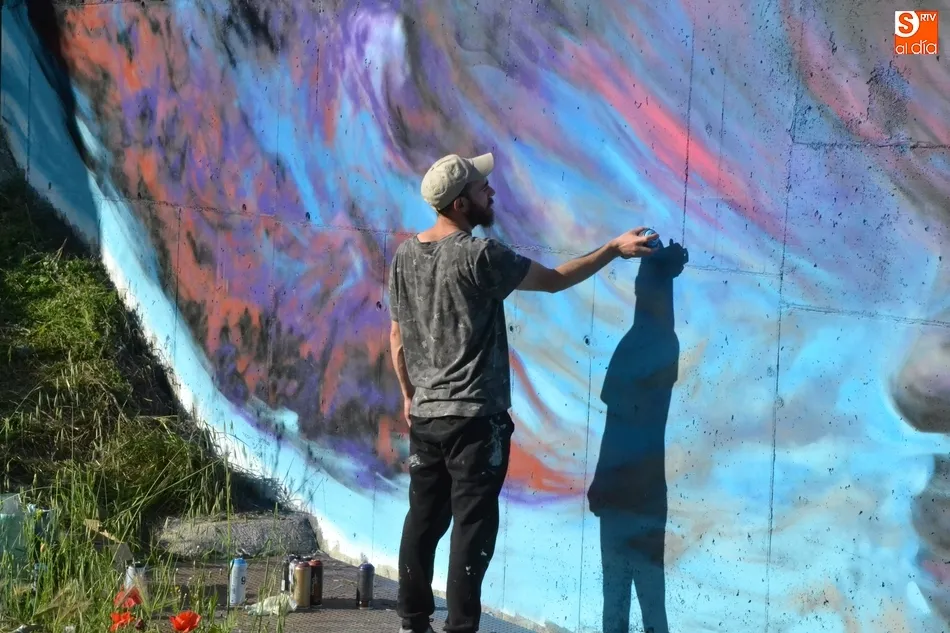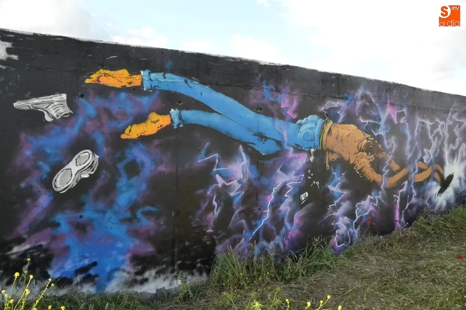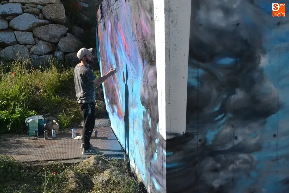 A la hora de plasmar el dibujo, han querido jugar además con la noche y el día a partir de una esquina del espacio, donde en la tarde del lunes estaban rematando un haz de luz con una figura humana. En total, han empleado unas 20 horas y unos 50 botes de spray en darle el aspecto que aparece en las imágenes al tanque.