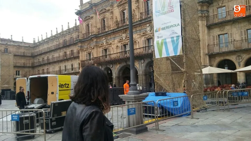El festival Luz y Vanguardias de Salamanca está a la vuelta de la esquina. Comienza el jueves pero este lunes la Plaza Mayor ha comenzado su transformación, con motivo del montaje de andamios e infraestructuras para llevar a cabo las proyecciones artísticas.
