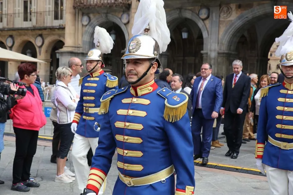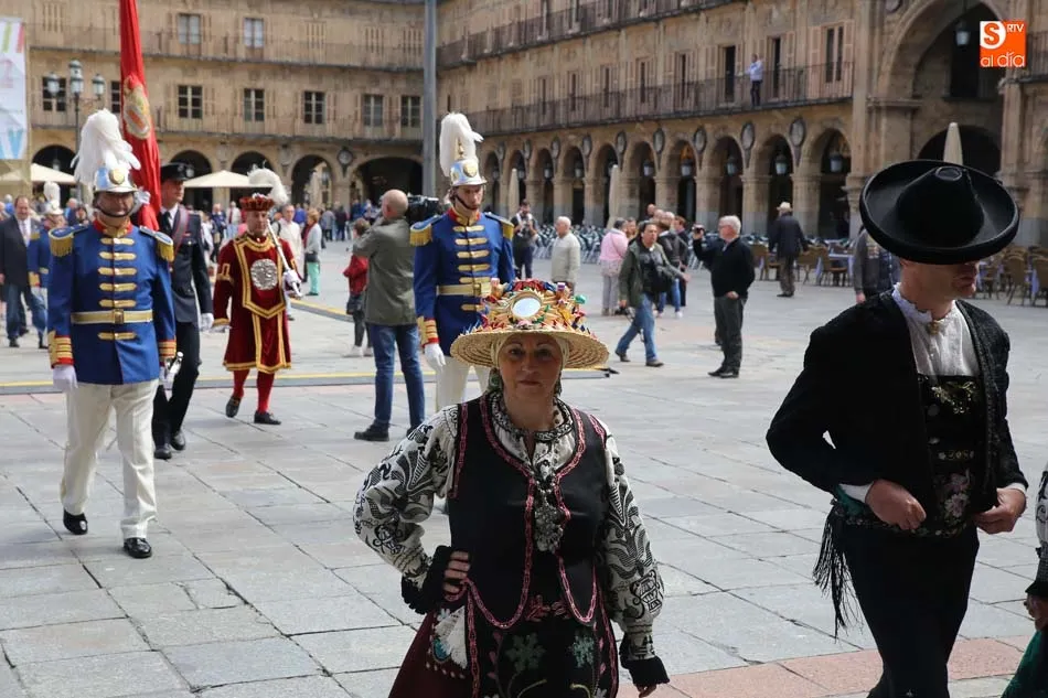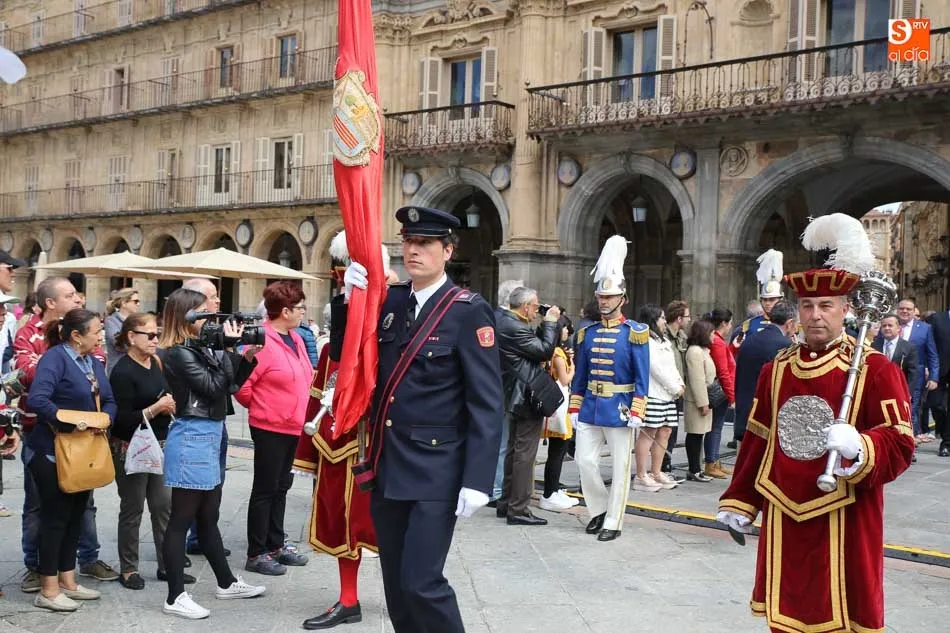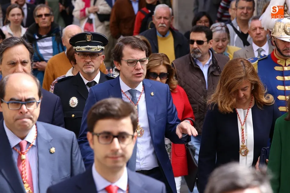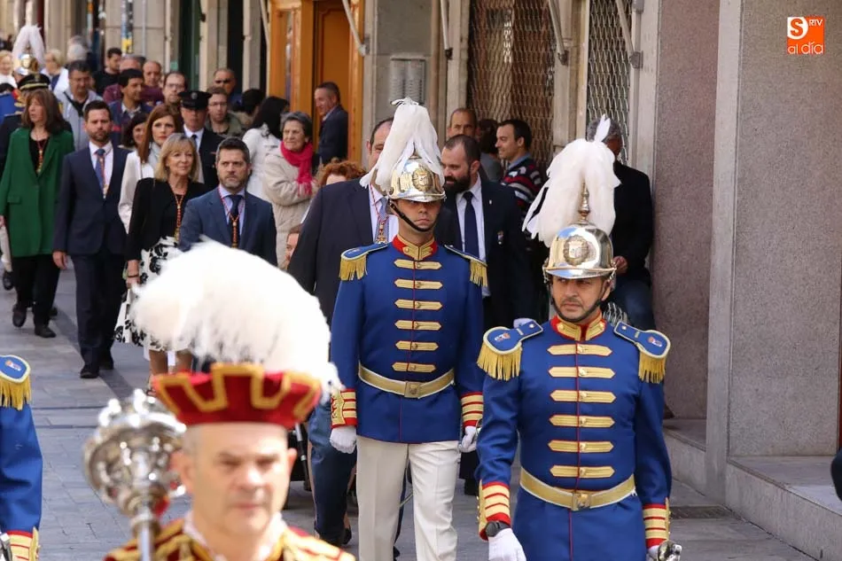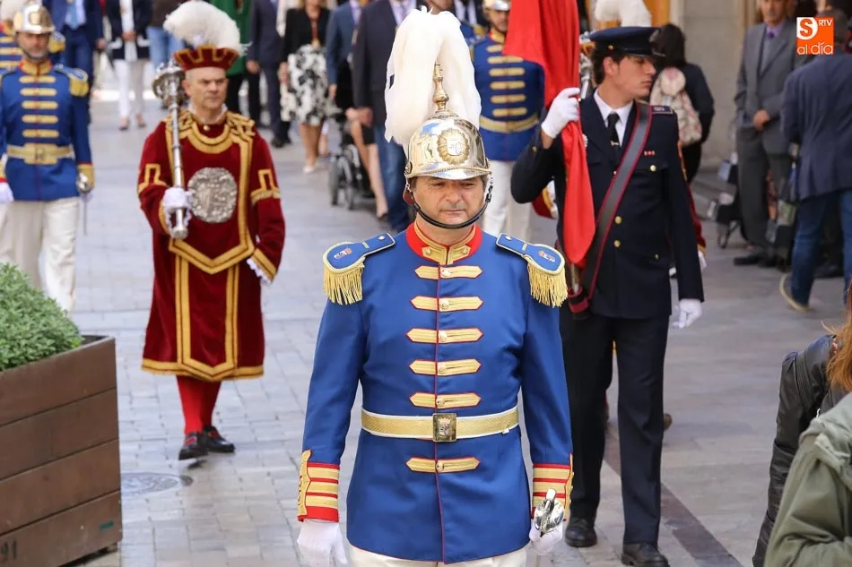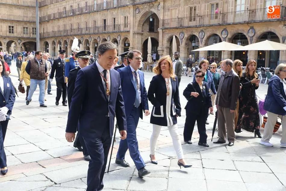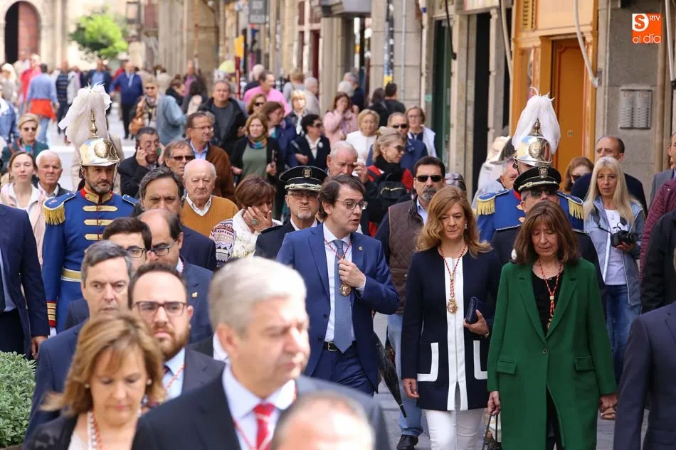 El alcalde de Salamanca, Alfonso Fernández Mañueco, encabezaba la marcha, seguido por concejales y junto a un grupo charro con trajes tradicionales y agentes de la Policía Local con el traje de gala.