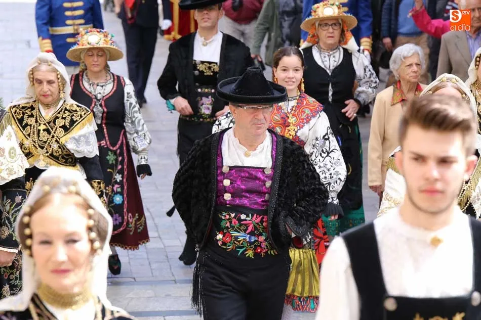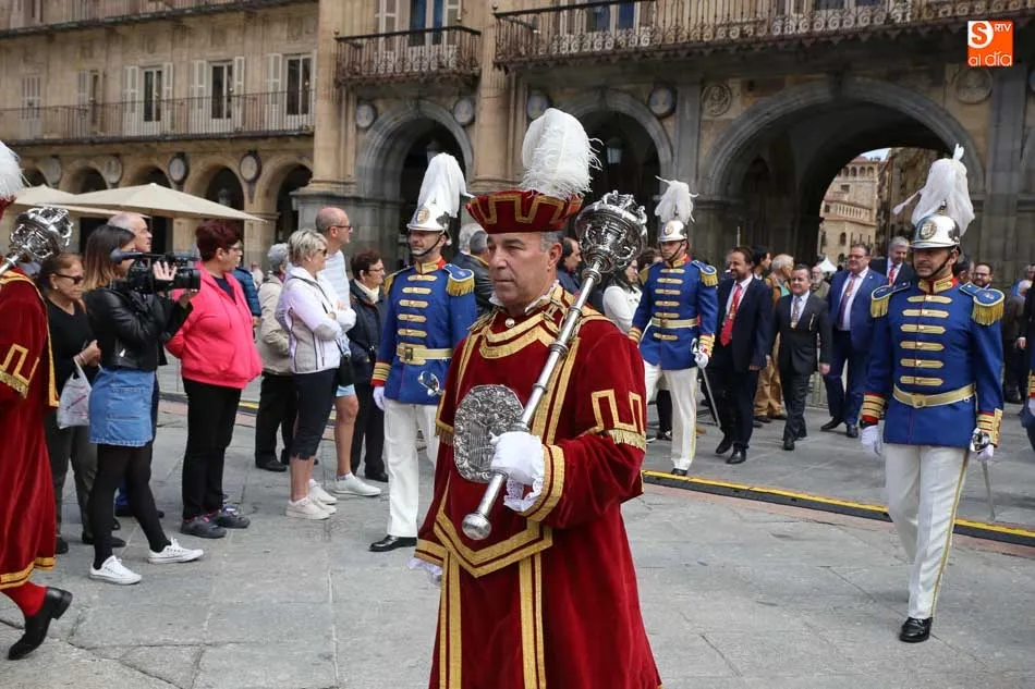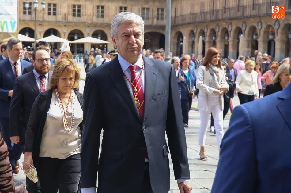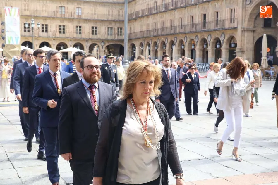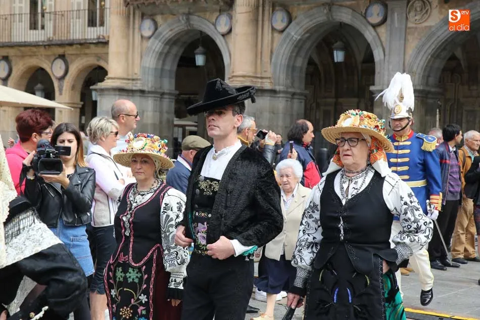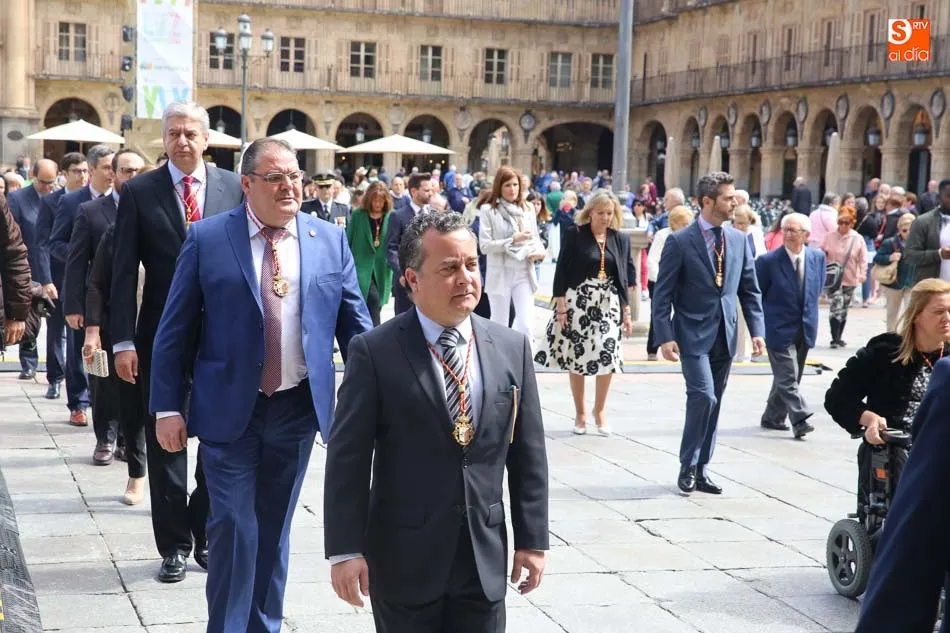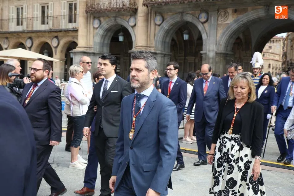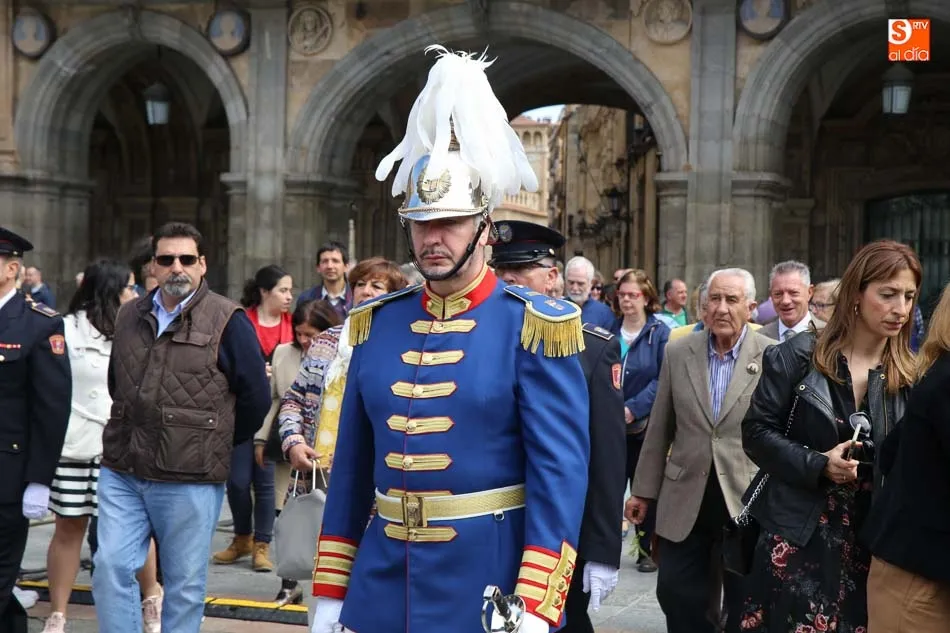 El alcalde de Salamanca, Alfonso Fernández Mañueco, encabezaba la marcha, seguido por concejales y junto a un grupo charro con trajes tradicionales y agentes de la Policía Local con el traje de gala.