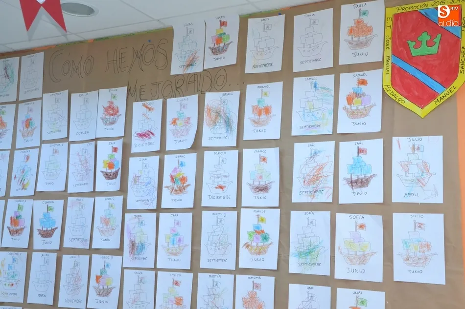 Los alumnos se llevaron para casa al concluir la mañana los trabajos que han realizado durante el curso, pudiéndose ver en una de las paredes una comparativa de cómo pintaban al principio de curso y cómo lo hacen ahora, tomando como referencia los mismos dibujos. Además, por las paredes estaban repartidos varios escudos de armas pintados por los alumnos.