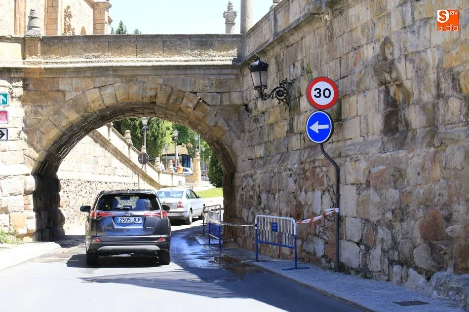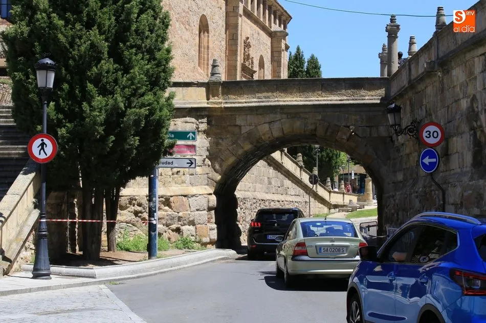 Un camión de la empresa El Peñaranda, que llevaba un contenedor, ha chocado con el arco del puente de la calle Arroyo de Santo Domingo, junto a la iglesia de San Esteban. El accidente tenía lugar este viernes, alrededor de las 12.30 horas, y afectó al tráfico de la zona.