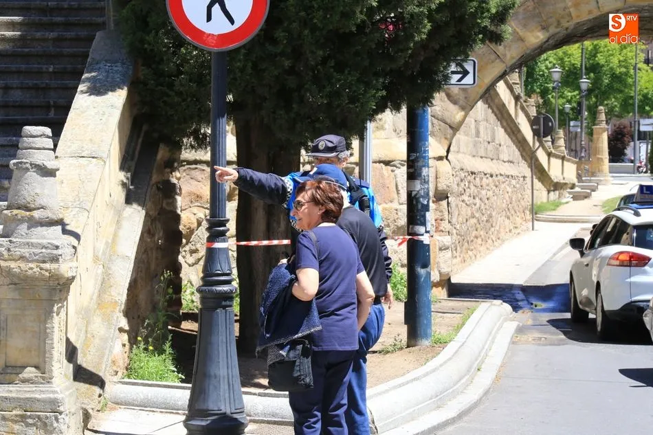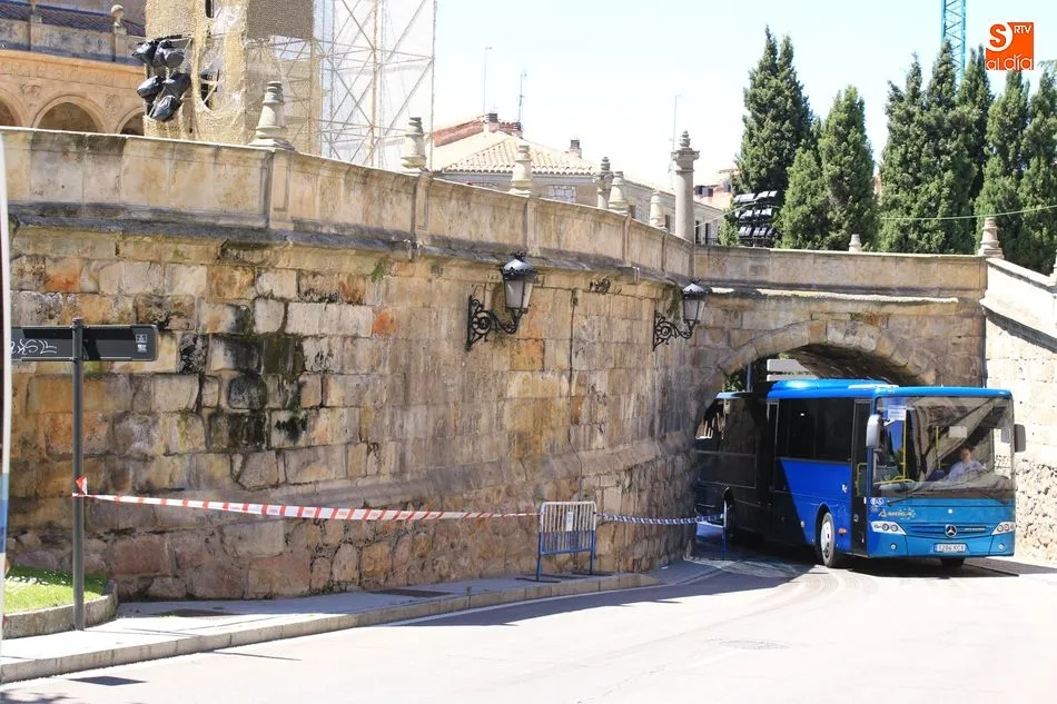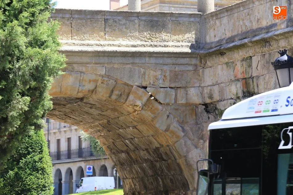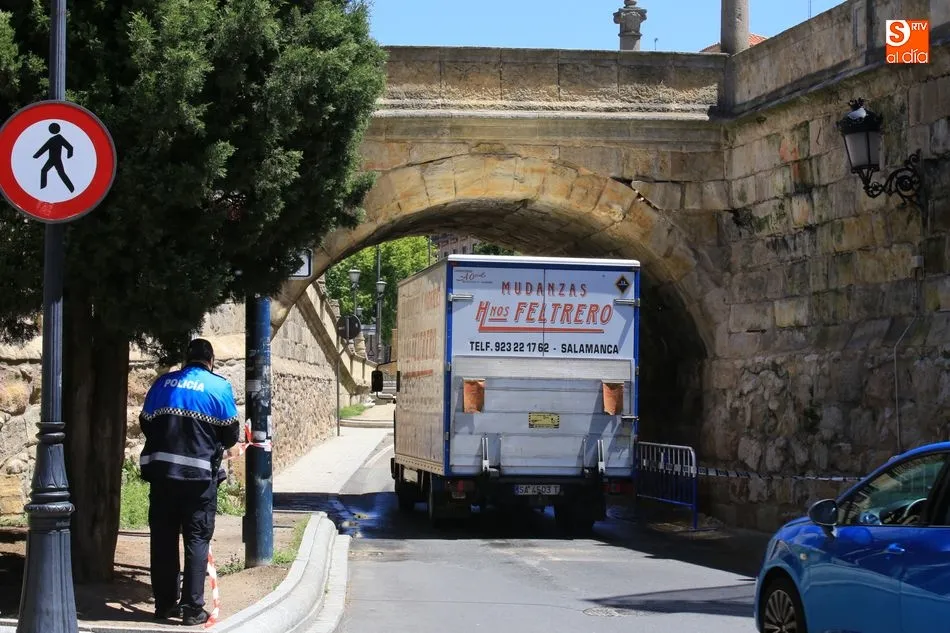 Se trata de un puente histórico con una altura limitada. El impacto provocó daños en una piedra y los Bomberos acudieron al lugar para comprobar que no había peligro de posibles desprendimientos. También se espera la inspección de técnicos del Ayuntamiento.