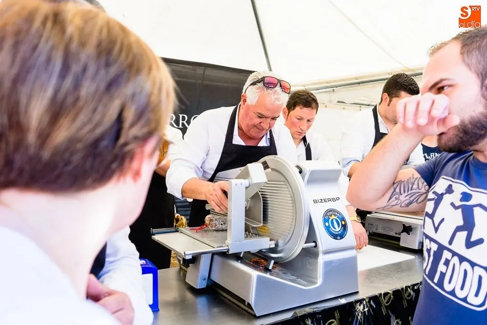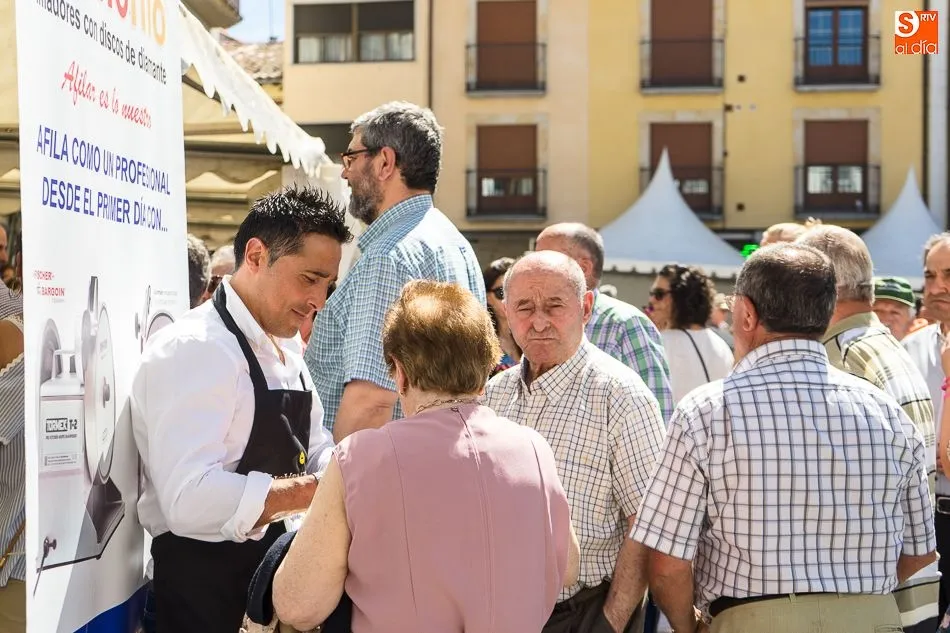 Un acto destacó claramente por encima de todos en este segundo día de la Feria Artesana y Alimentaria de San Antonio. La degustación gastronómica gratuita ofrecida por Jamones y Embutidos El Ventorro colapsó la Plaza Mayor y congregó en torno a su expositor a un gran número de visitantes y vecinos deseosos de hincar el dientes a los ibéricos ofrecidos.