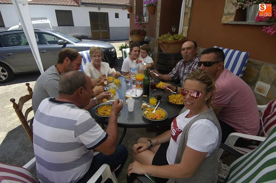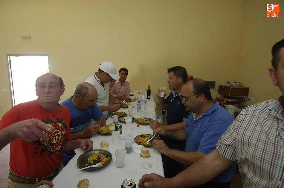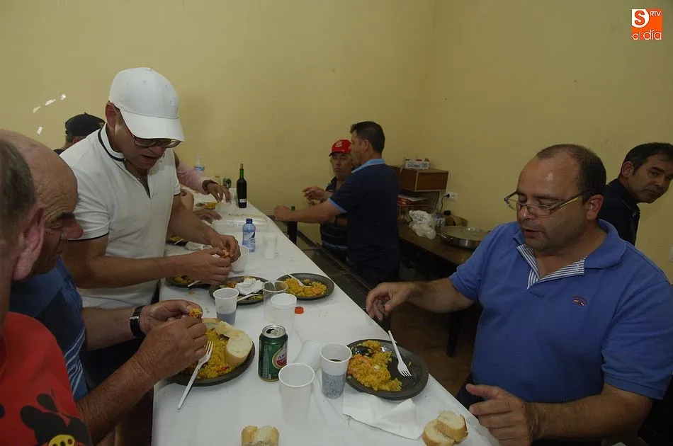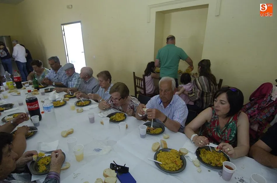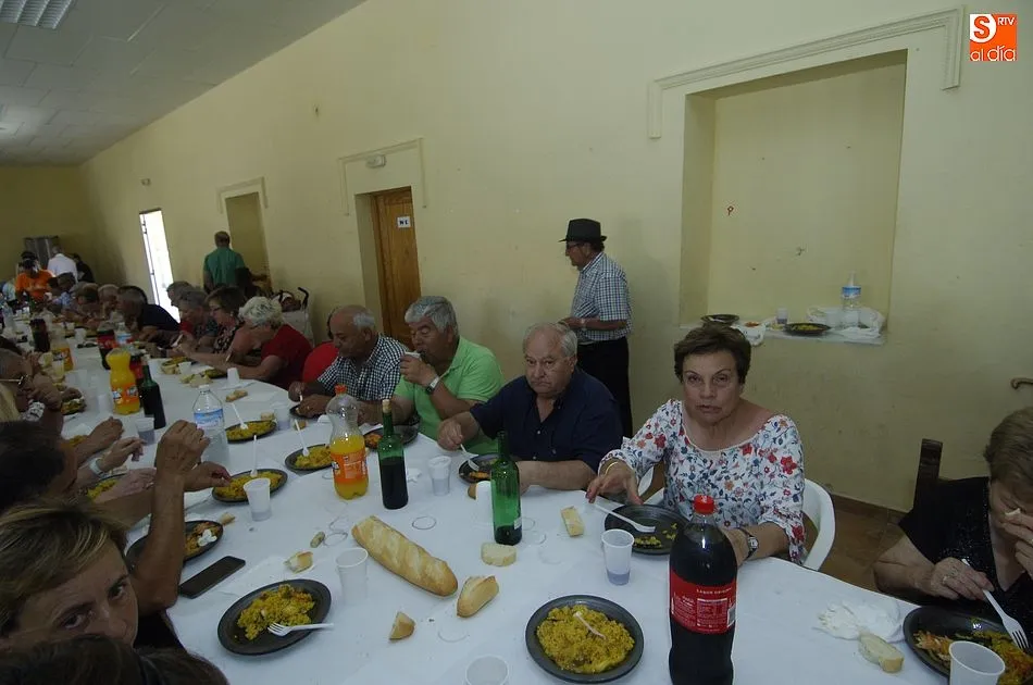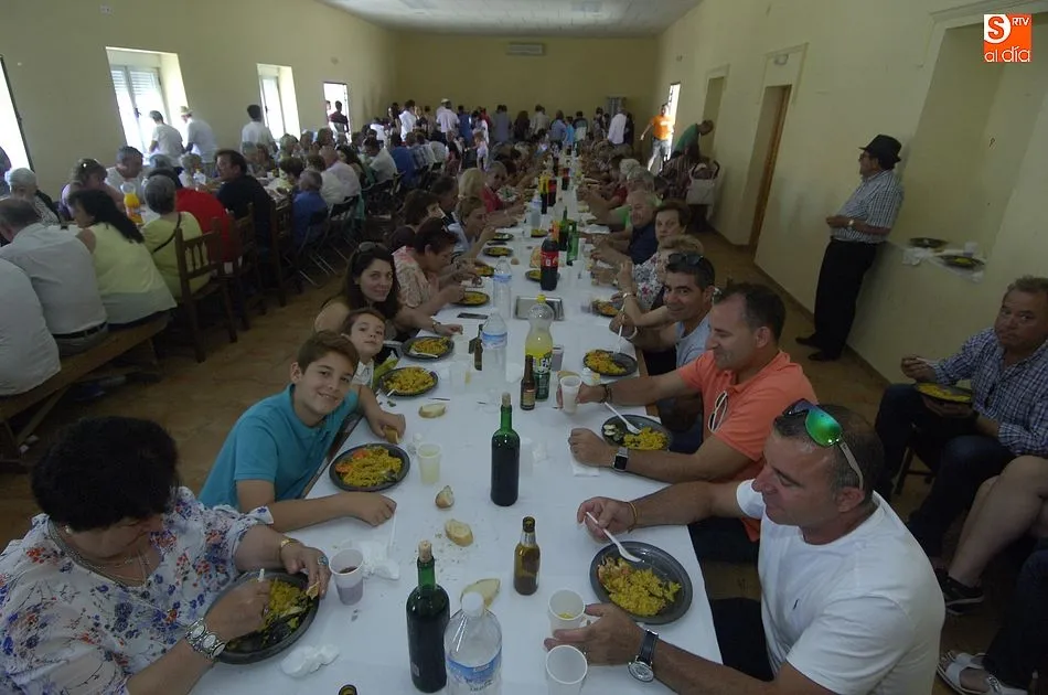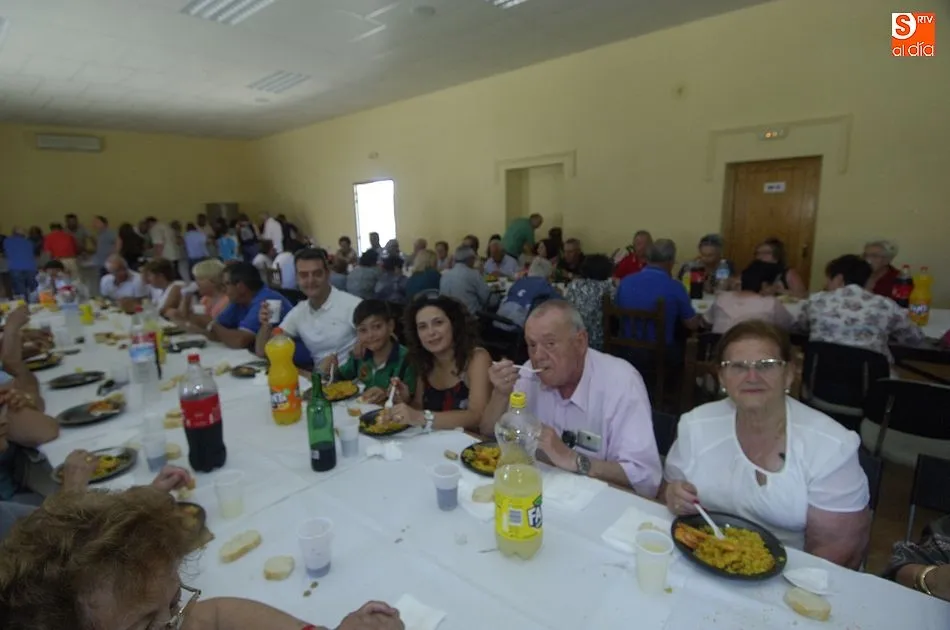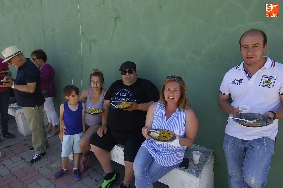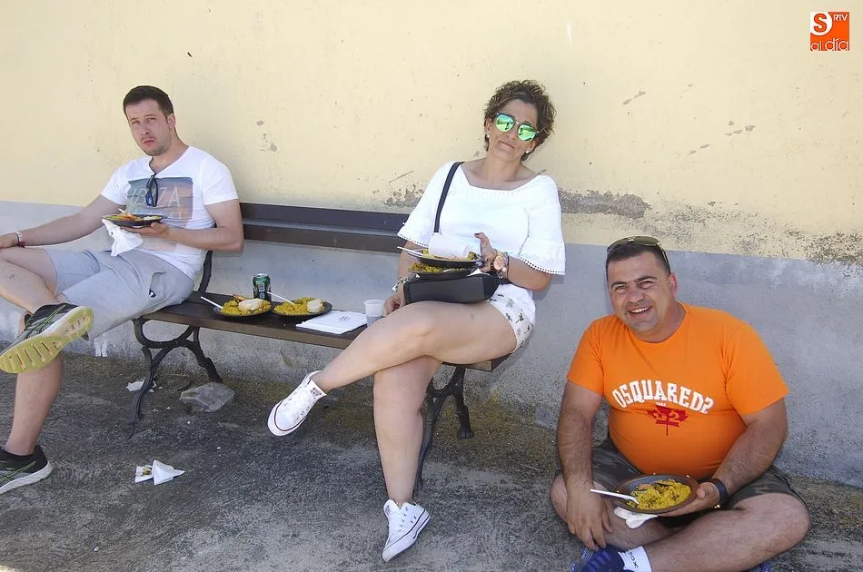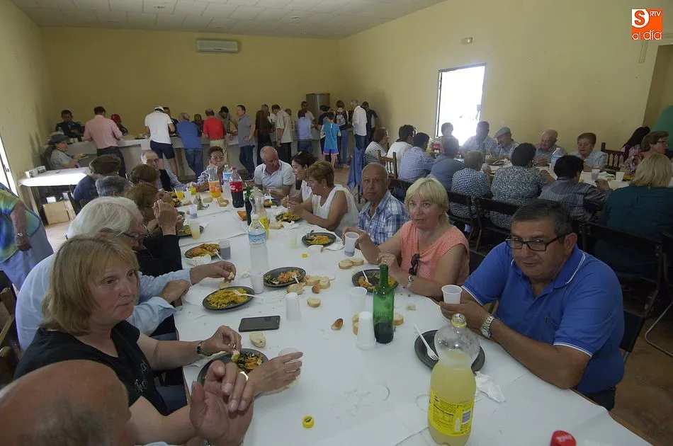 En lo que se refiere a la degustación de la paella, parte de los congregados comieron en el interior del salón multiusos, mientras que los que ya no tuvieron sitio allí dentro tuvieron que hacerlo fuera, resguardados eso sí a la sombra del sofocante calor que hacía a esas horas en Martín de Yeltes. Entre los asistentes a la comida estuvo el párroco de la localidad, Gabriel Ángel Cid.