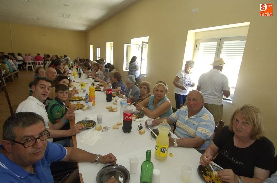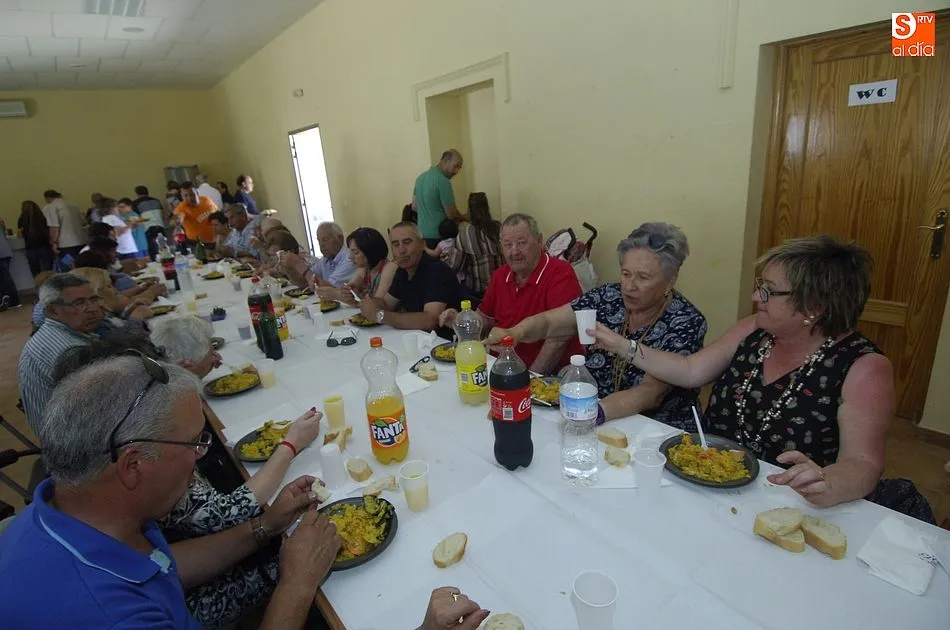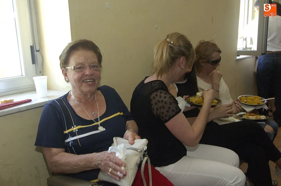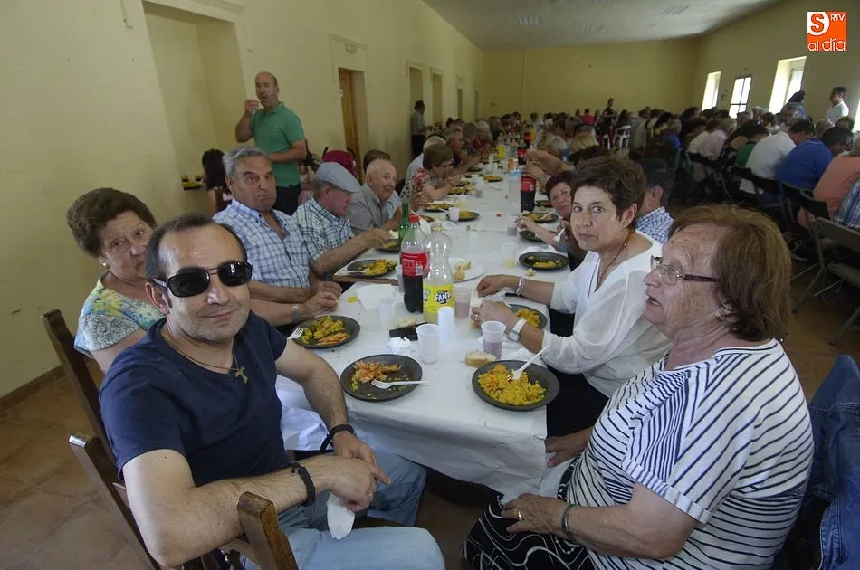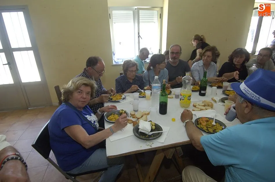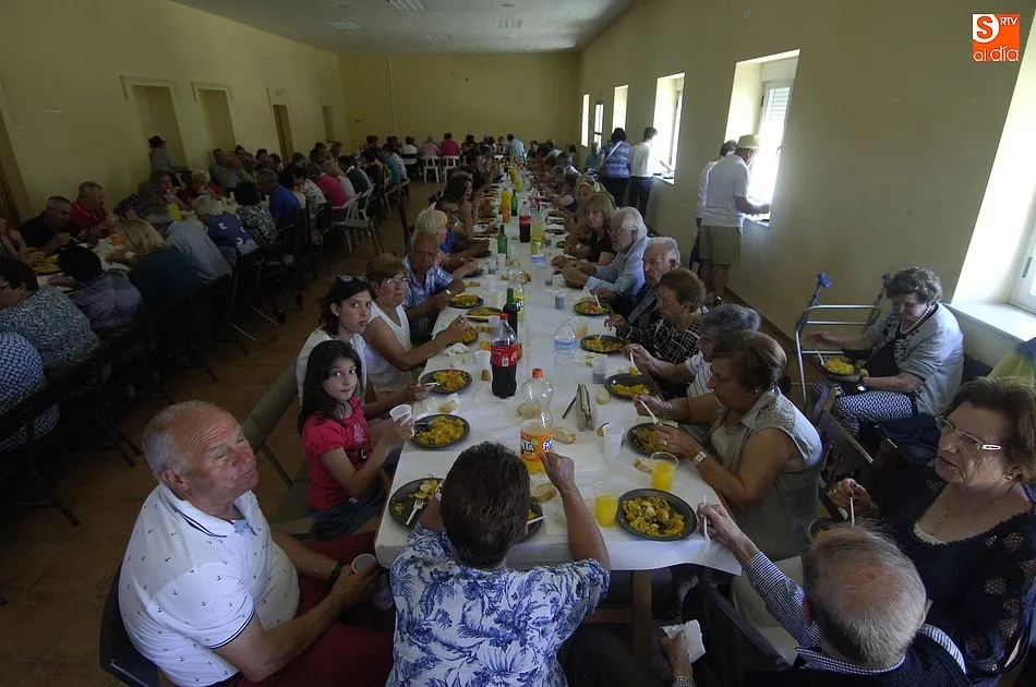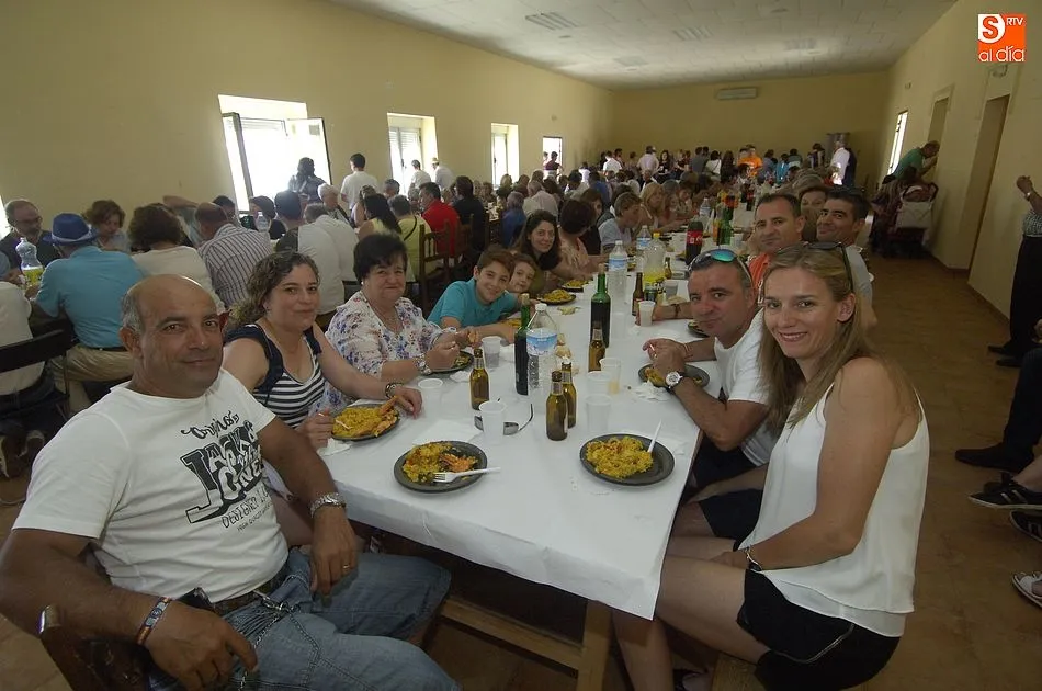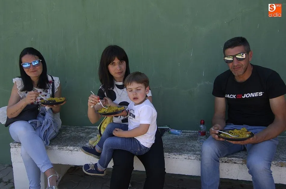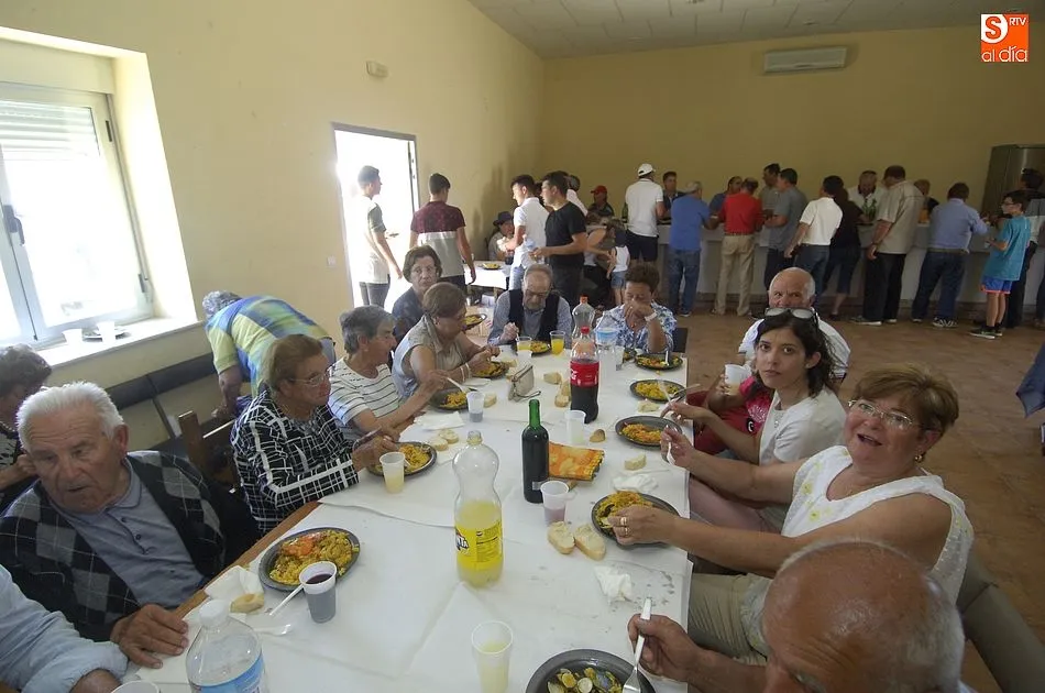 En lo que se refiere a la degustación de la paella, parte de los congregados comieron en el interior del salón multiusos, mientras que los que ya no tuvieron sitio allí dentro tuvieron que hacerlo fuera, resguardados eso sí a la sombra del sofocante calor que hacía a esas horas en Martín de Yeltes. Entre los asistentes a la comida estuvo el párroco de la localidad, Gabriel Ángel Cid.