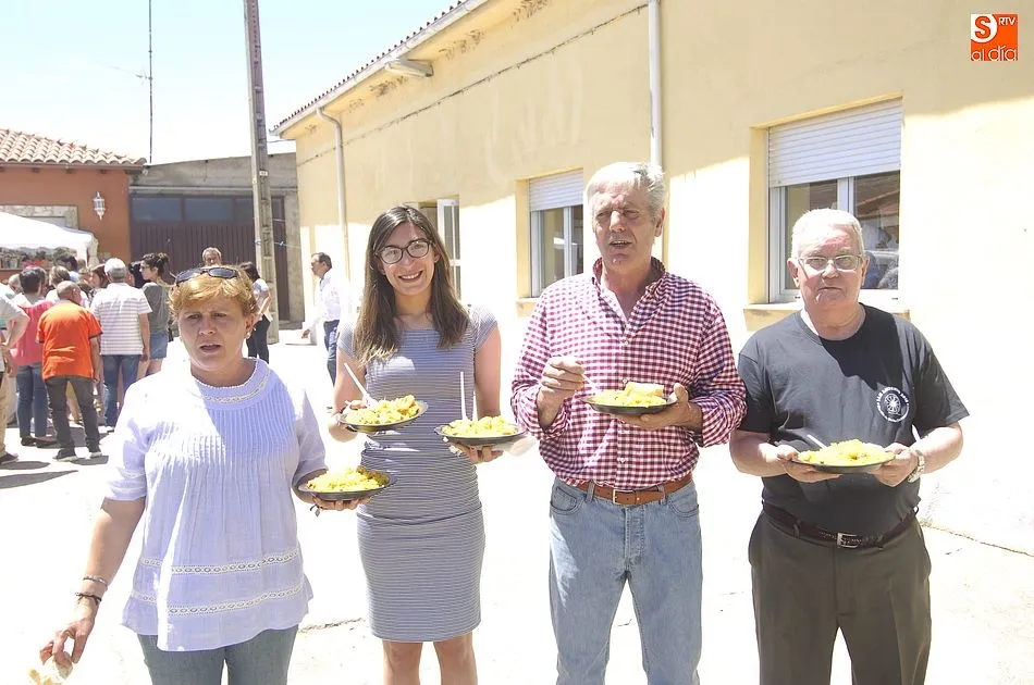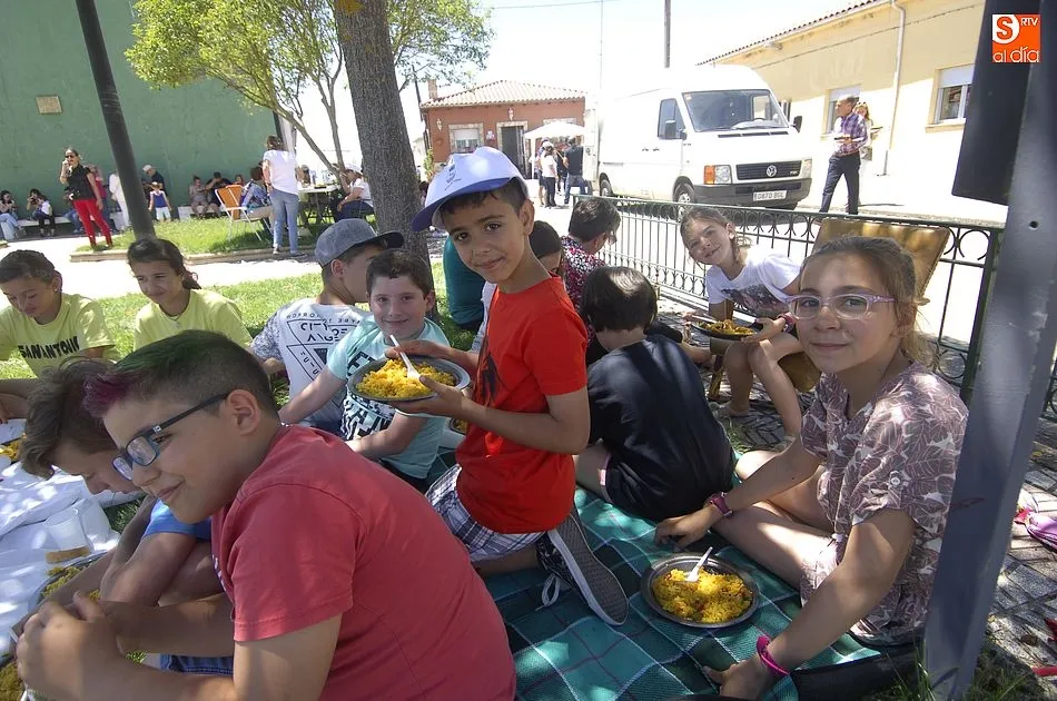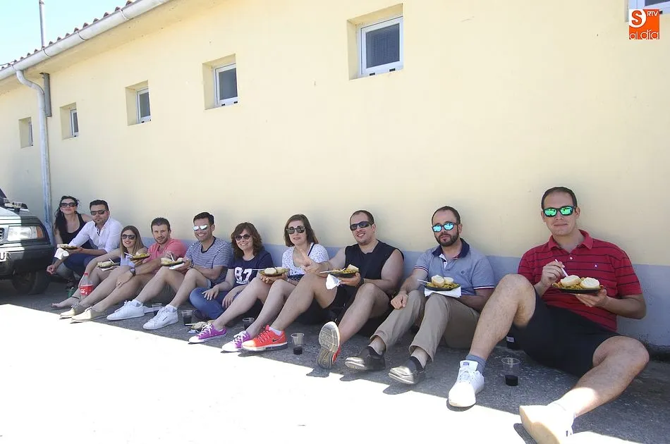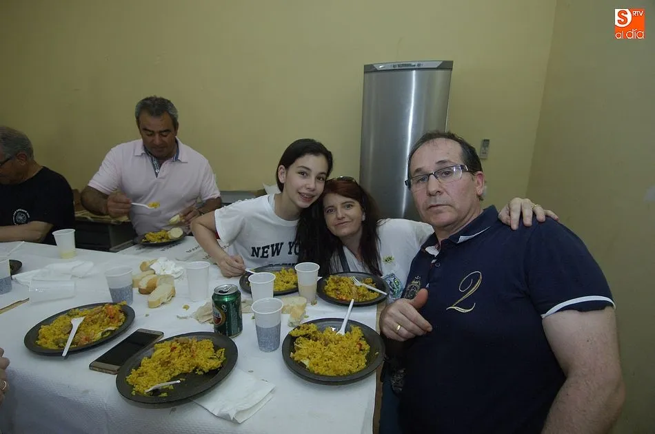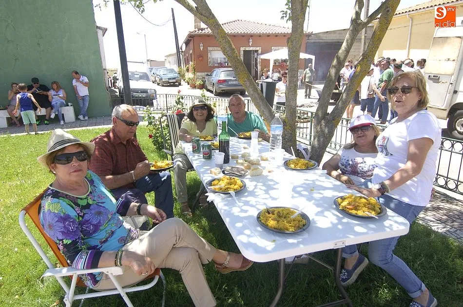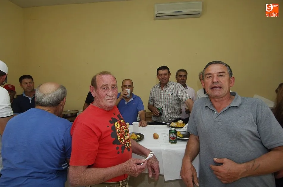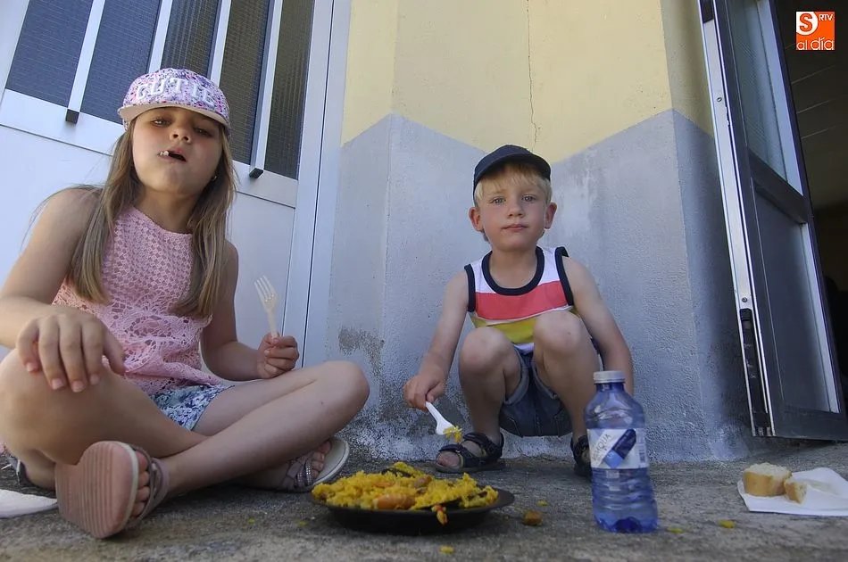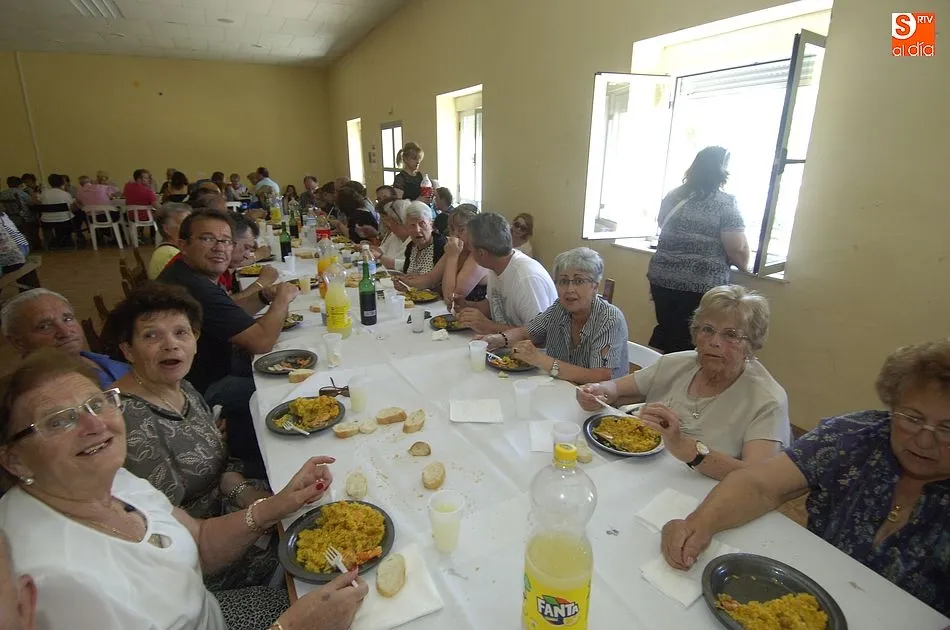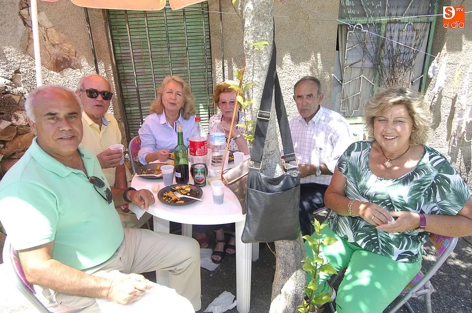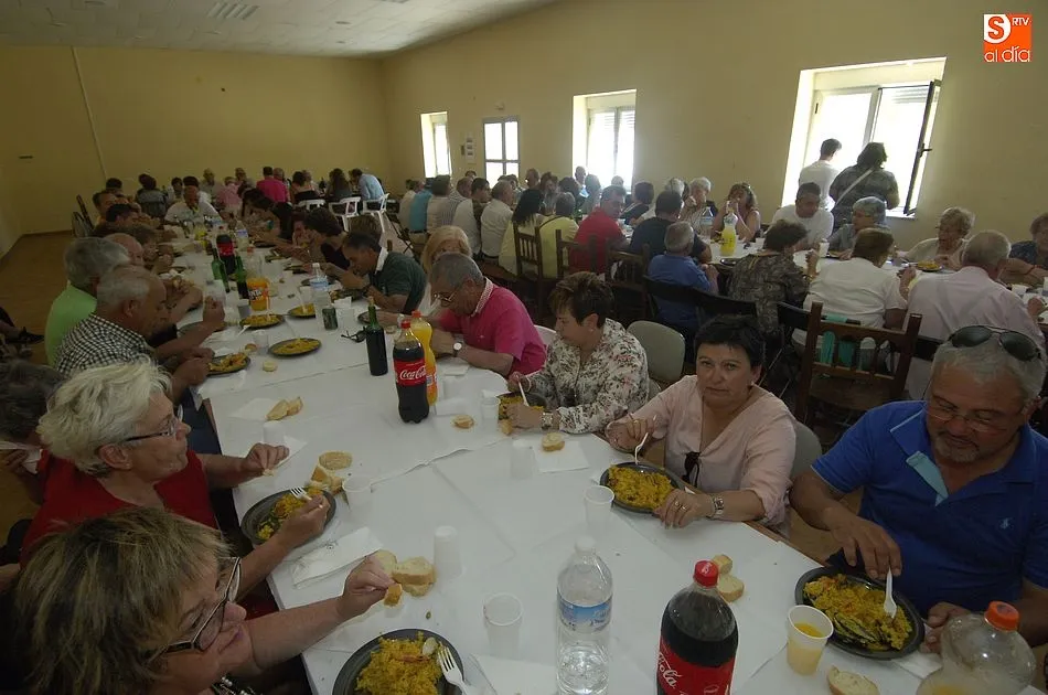 En lo que se refiere a la degustación de la paella, parte de los congregados comieron en el interior del salón multiusos, mientras que los que ya no tuvieron sitio allí dentro tuvieron que hacerlo fuera, resguardados eso sí a la sombra del sofocante calor que hacía a esas horas en Martín de Yeltes. Entre los asistentes a la comida estuvo el párroco de la localidad, Gabriel Ángel Cid.