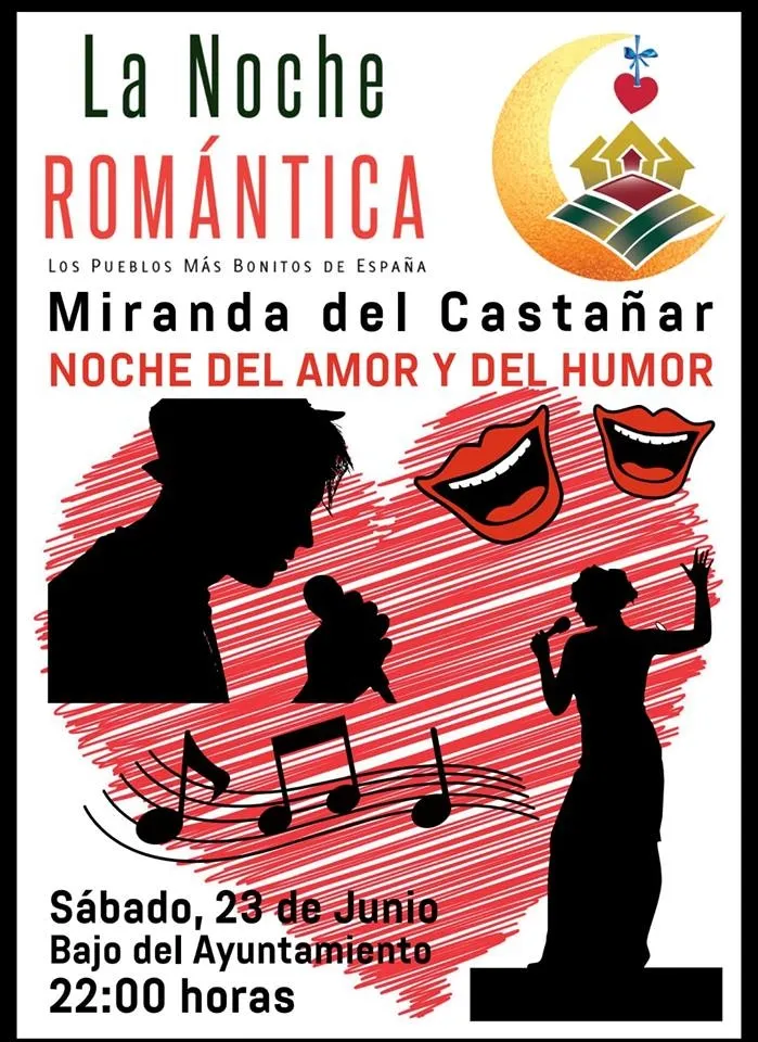 Miranda del Castañar ya tiene programación para la próxima Noche Romántica, que tendrá lugar el próximo sábado, 23 de junio. El Ayuntamiento ha preparado una noche en la que se ofrecerán monólogos de humor y la actuación de un cantautor. Además, a partir de medianoche se invitará a los presentes a participar en la romántica propuesta de ?El Beso más Bonito del Mundo? en el que miles de personas en cada municipio mostraran su cariño, su afecto o su amor eterno con un beso. Las actividades comenzarán a las 22:oo horas en el Bajo del Ayuntamiento.