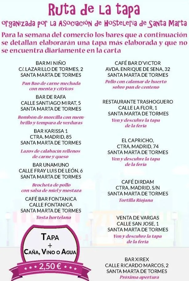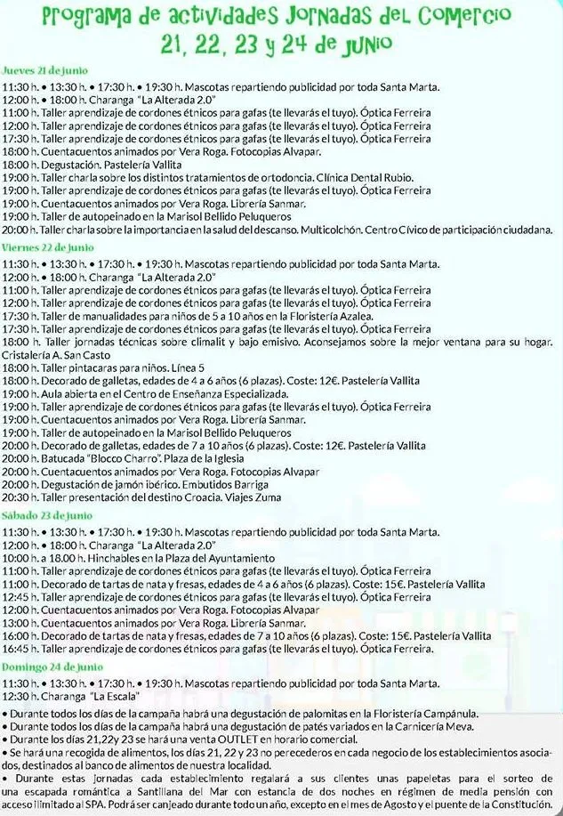 Juegos infantiles, talleres, degustaciones, música, pasacalles o cuentacuentos forman parte del amplio programa con el que se quiere potenciar el consumo en el comercio de la localidad. Actividades a las que se suma la Ruta de la Tapa en la que participarán 11 bares de Santa Marta, que presentarán durante estos días de la jornada una tapa más elaborada a 2,50 incluida la bebida, explicó Mariano Fraile.