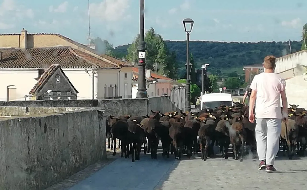 A primera hora de la mañana del jueves, el emblemático Puente Mayor de Ciudad Rodrigo acogió el paso de un rebaño de ovejas merinas negras, al igual que ya ocurrió el año pasado por estas mismas fechas dentro de una operación de tránsito de una finca a otra.