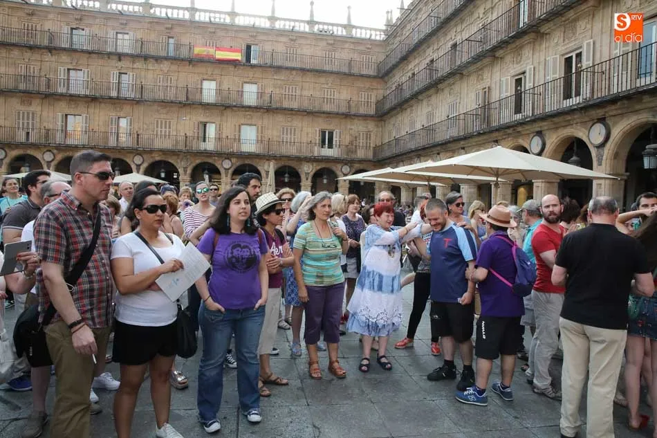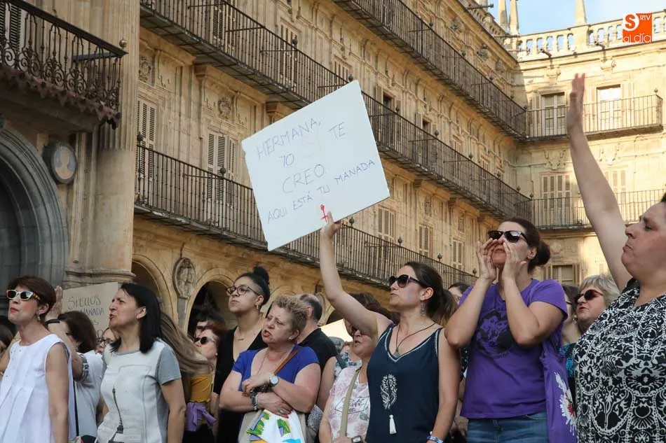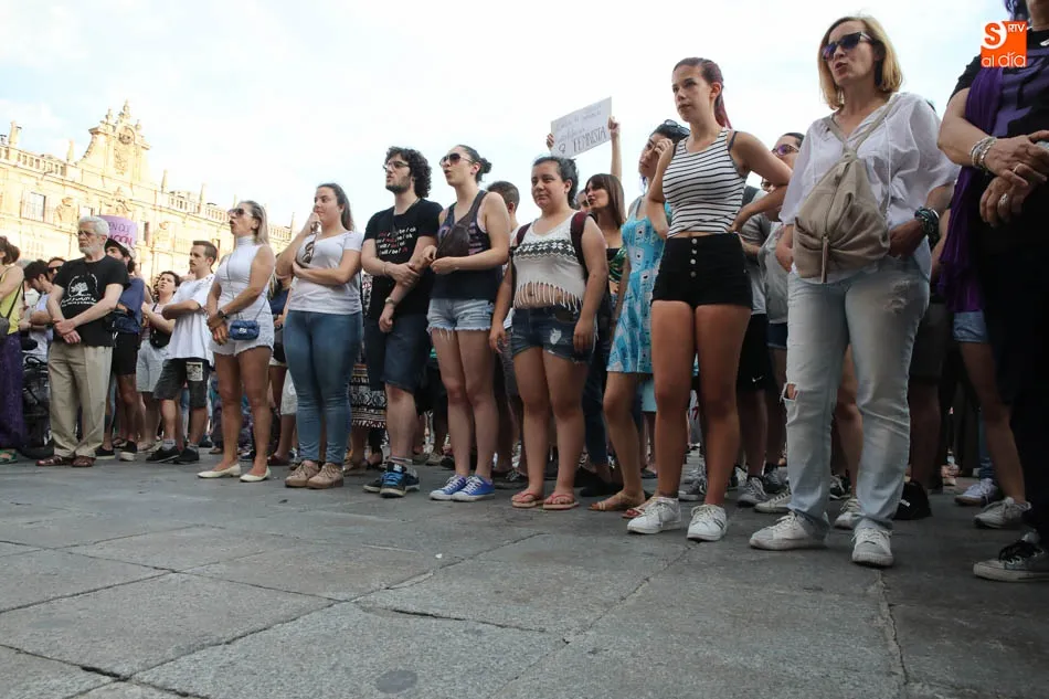 Colectivos y organizaciones feministas de Salamanca han protagonizado este viernes una nueva jornada de protesta en la Plaza Mayor contra la libertad provisional bajo fianza de 6.000 euros dictada para los cinco miembros de 'La Manada' condenados a nueve años de cárcel por abuso sexual en los Sanfermines de 2016.