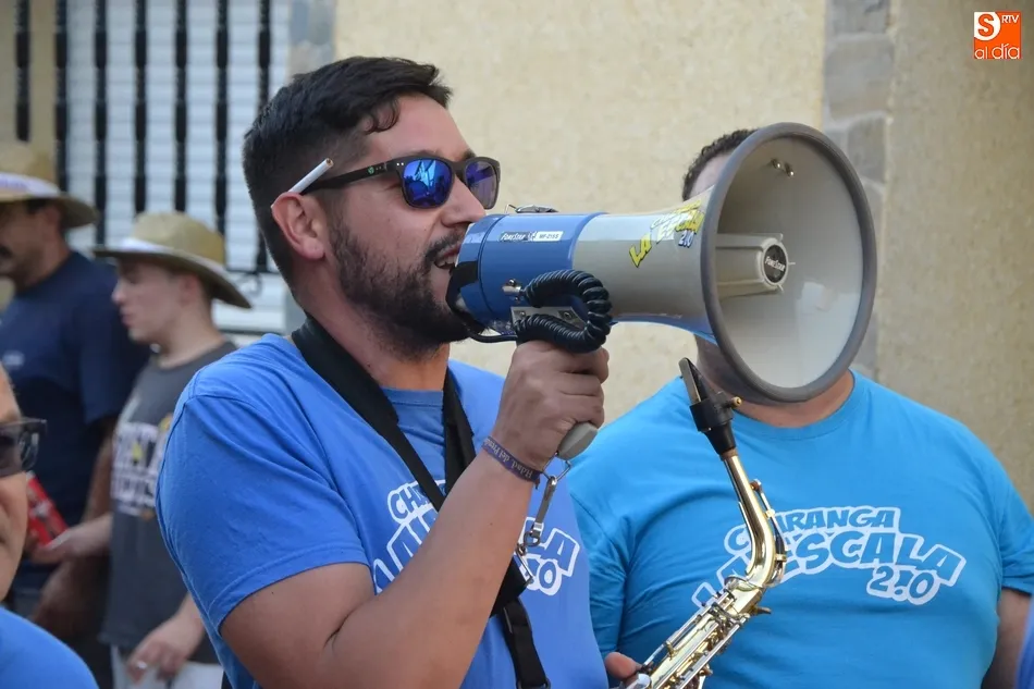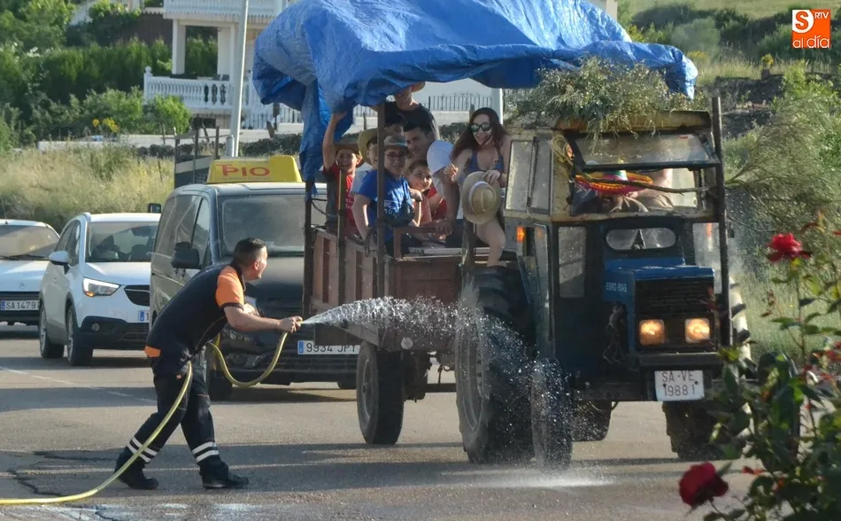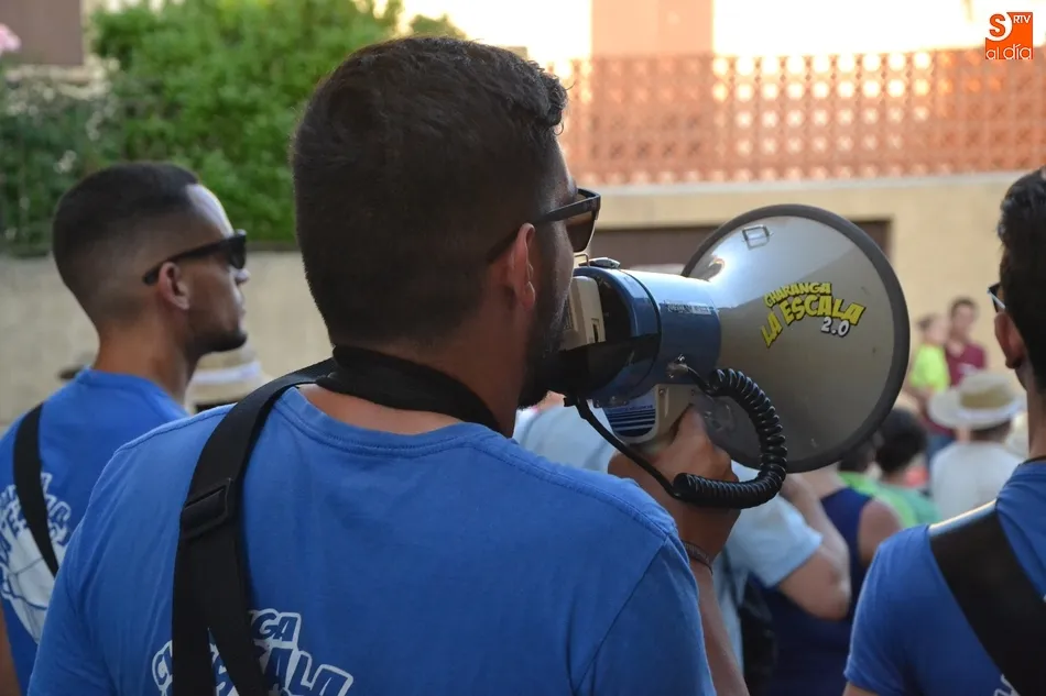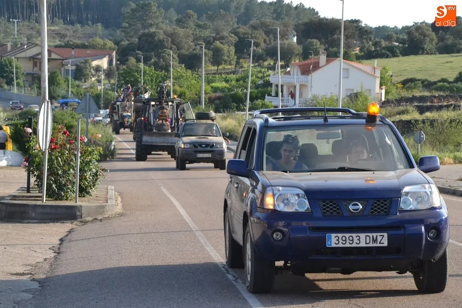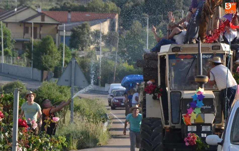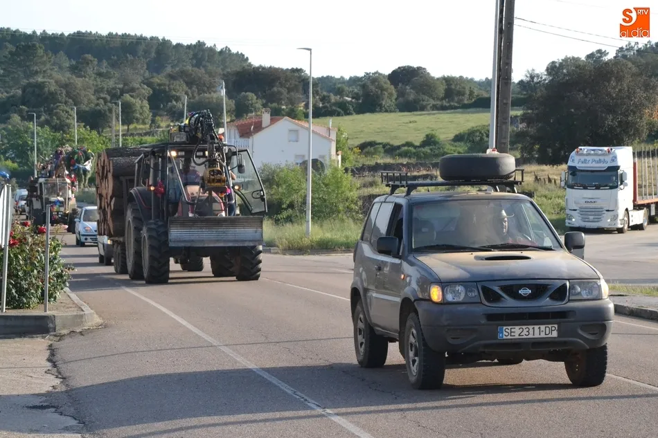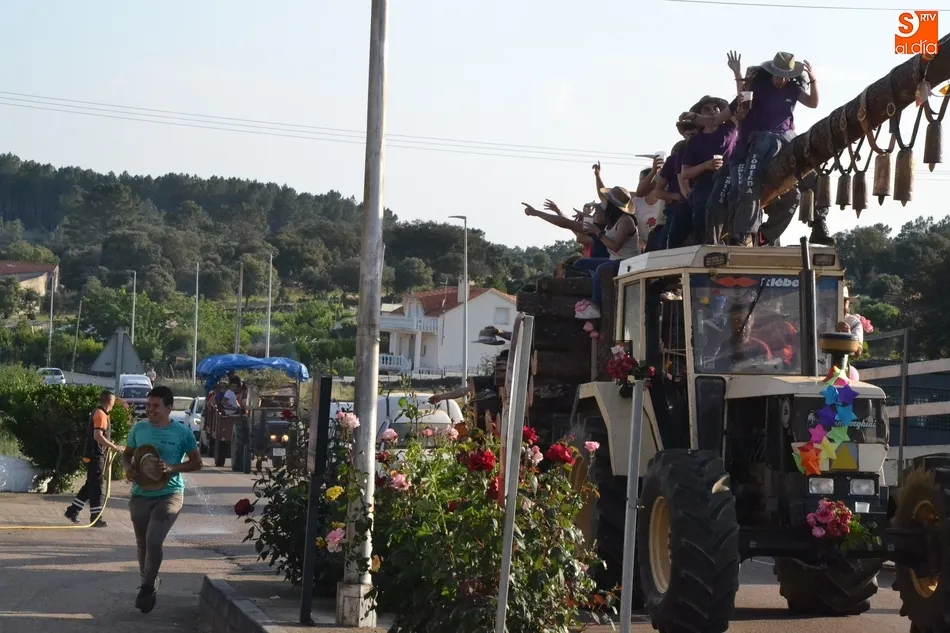 En torno a las 20.15 horas (con más puntualidad que el año pasado), el pino hizo entrada en el núcleo urbano de Robleda, dentro de una larga caravana de vehículos que fue rociada con agua ?muy agradecida- desde la gasolinera que hay en la carretera, en cuyos márgenes también estaba esperando la Charanga La Escala 2.0, que acompañó todo el trayecto por las calles de Robleda.