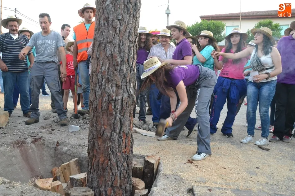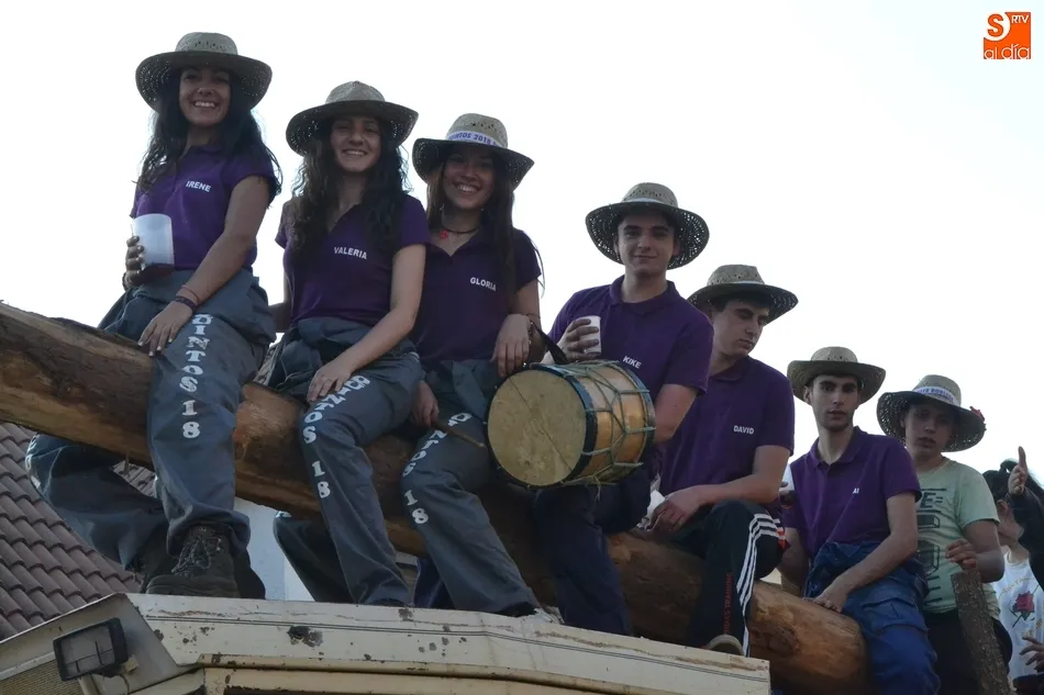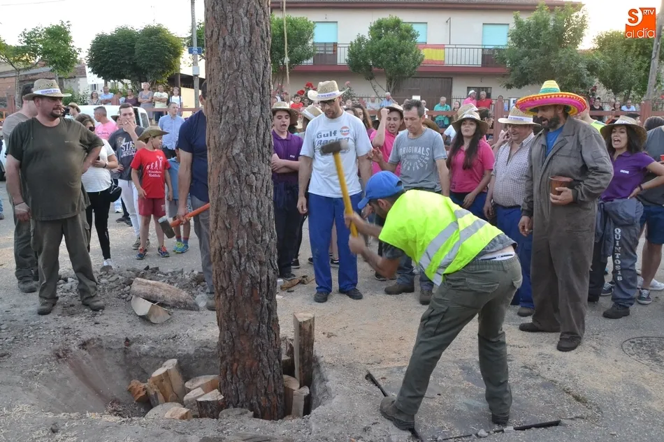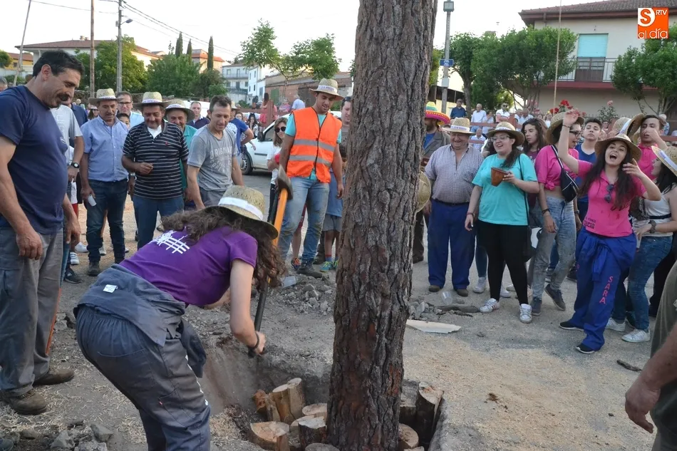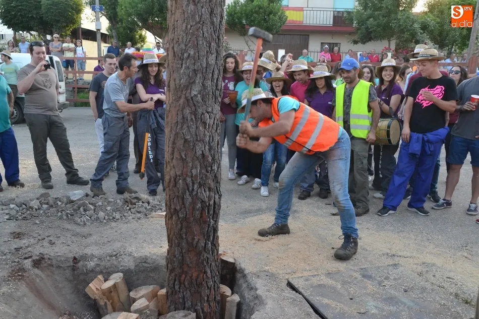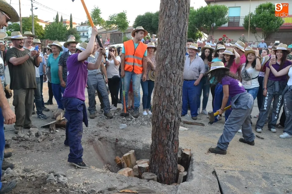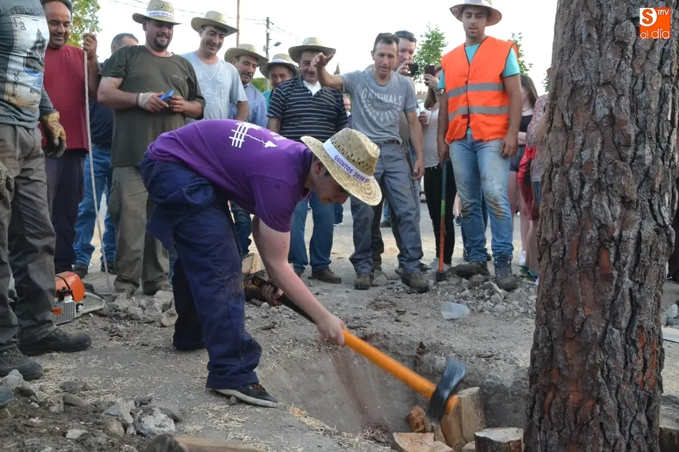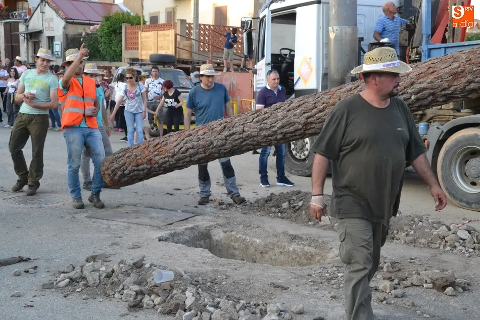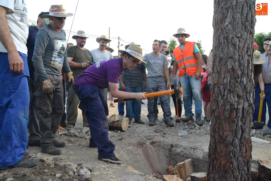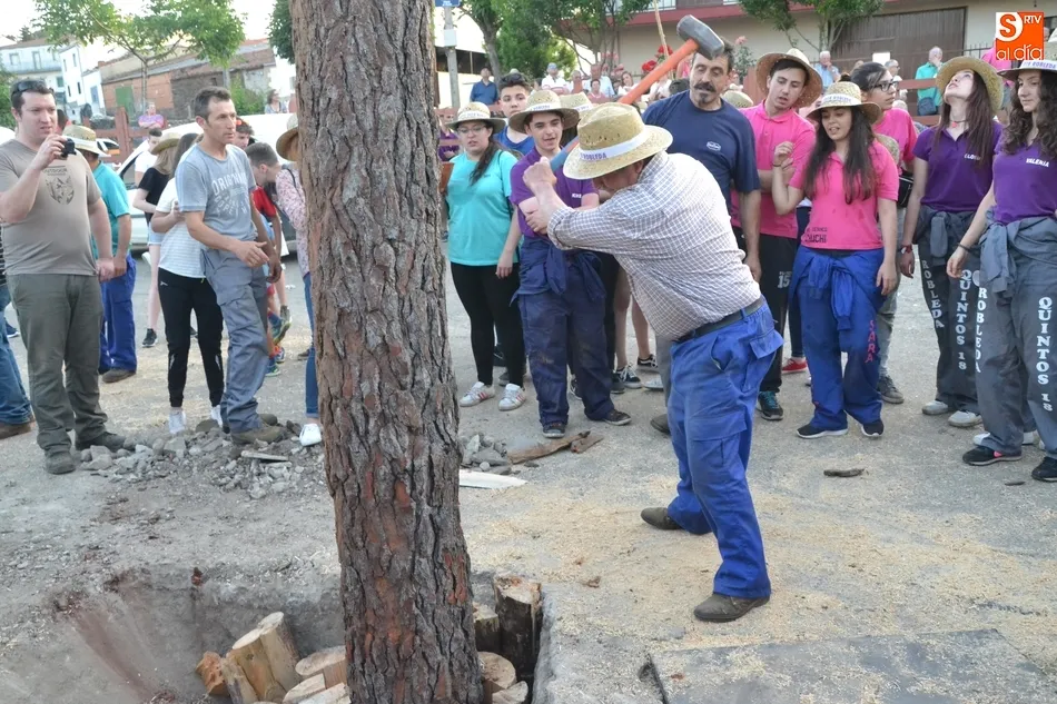 En ese trayecto por las calles, la comitiva hizo tres paradas (una de ellas en la Plaza Mayor), antes de llegar a la Plaza del Caño, donde estaban esperando numerosos vecinos para seguir la operación de izado, que fue como siempre larga y laboriosa. En las labores de sujeción colaboraron los propios quintos, dando algún que otro martillazo a los trozos de troncos que hacen de cuña del árbol, al cual intentaron trepar posteriormente los quintos del año (lograron subir 2-3 metros).