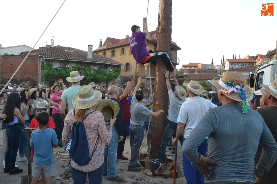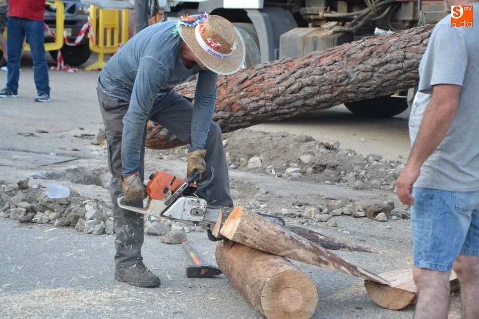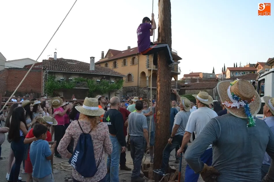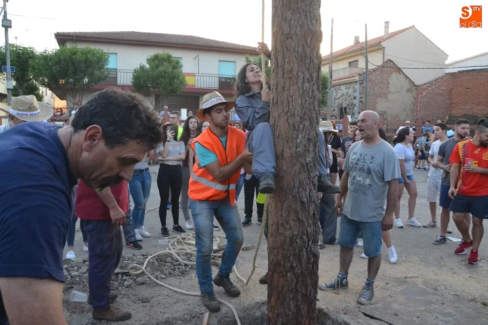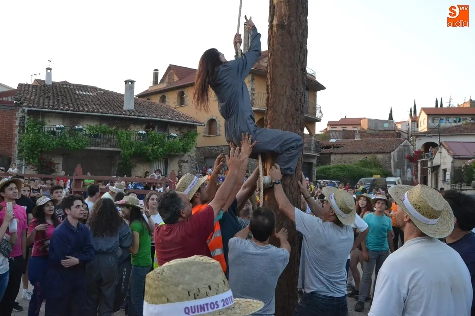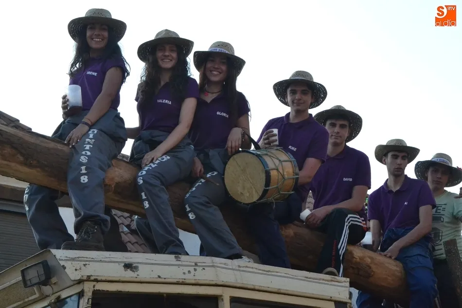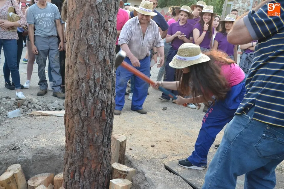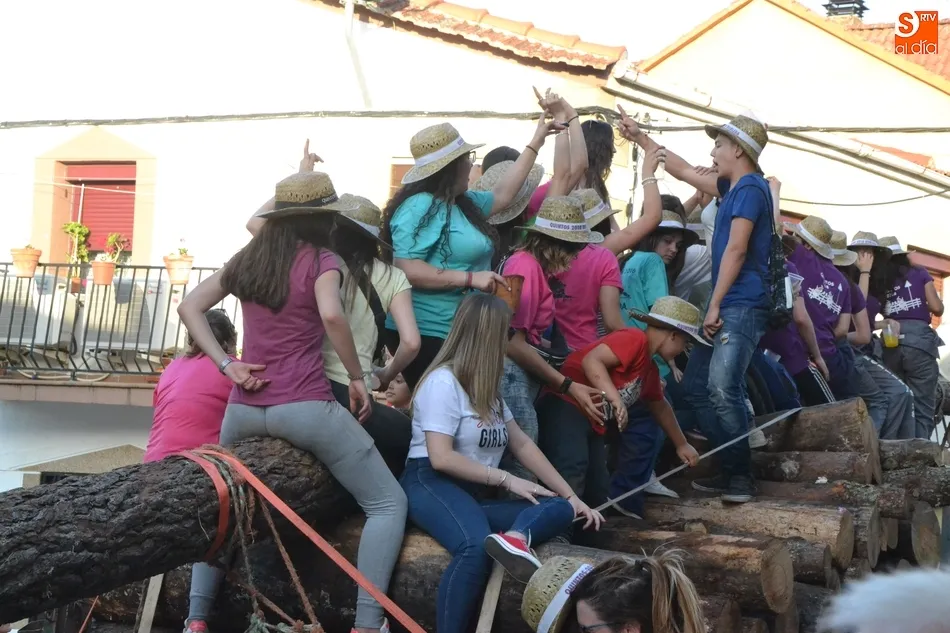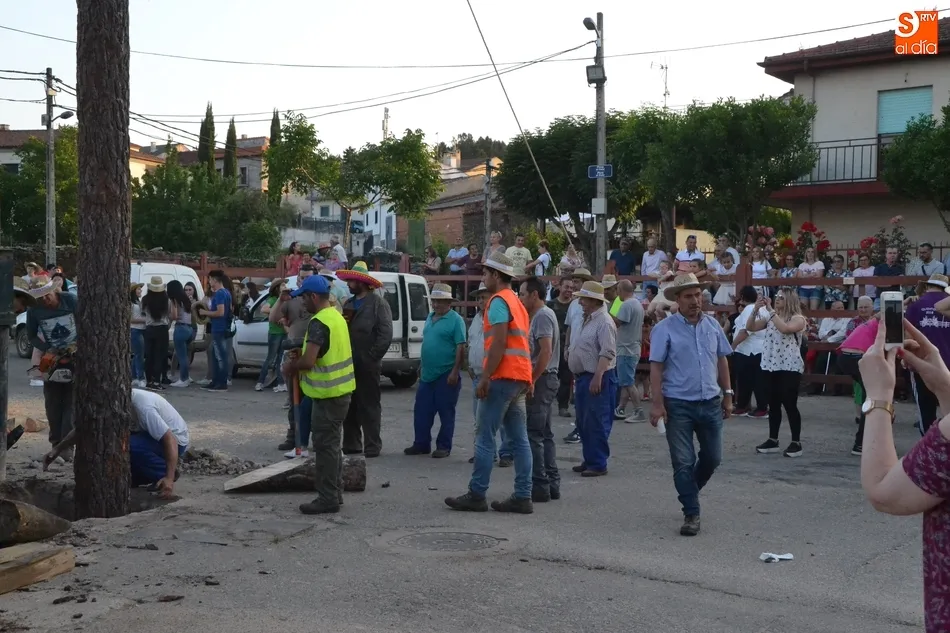 En ese trayecto por las calles, la comitiva hizo tres paradas (una de ellas en la Plaza Mayor), antes de llegar a la Plaza del Caño, donde estaban esperando numerosos vecinos para seguir la operación de izado, que fue como siempre larga y laboriosa. En las labores de sujeción colaboraron los propios quintos, dando algún que otro martillazo a los trozos de troncos que hacen de cuña del árbol, al cual intentaron trepar posteriormente los quintos del año (lograron subir 2-3 metros).