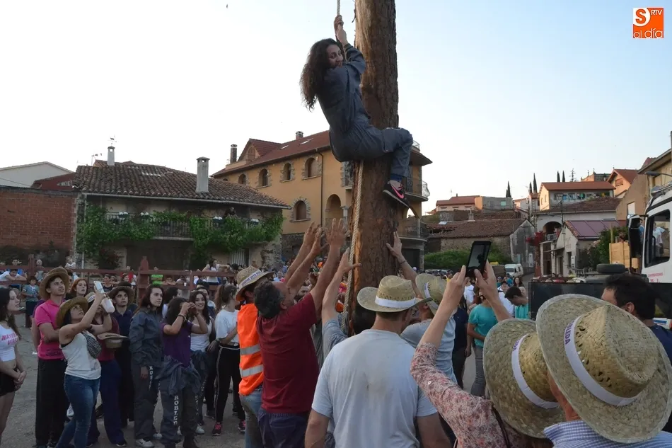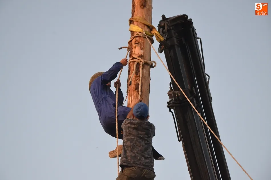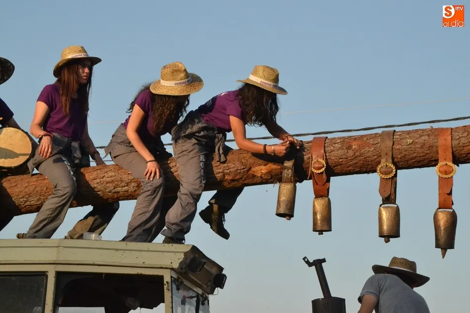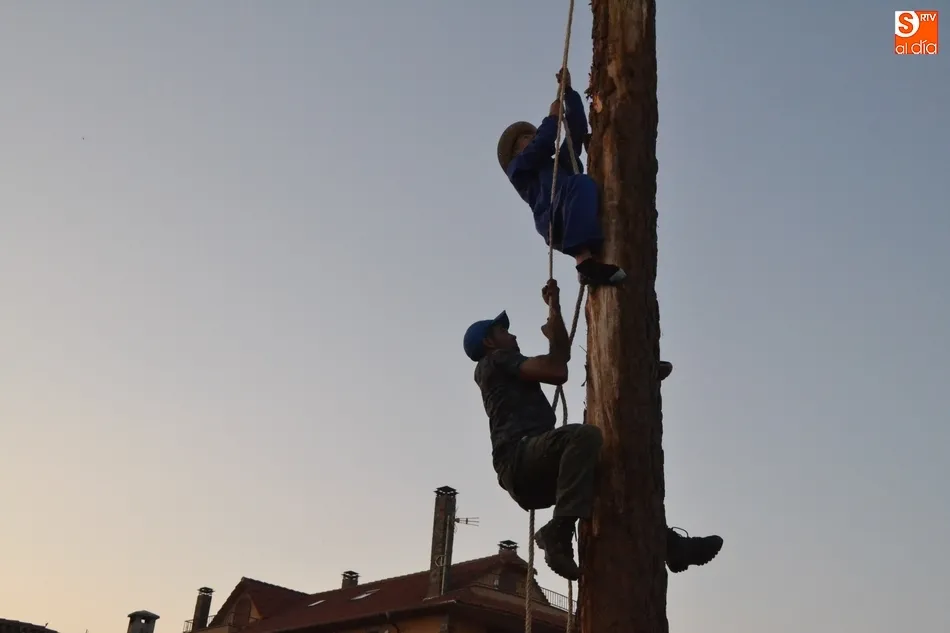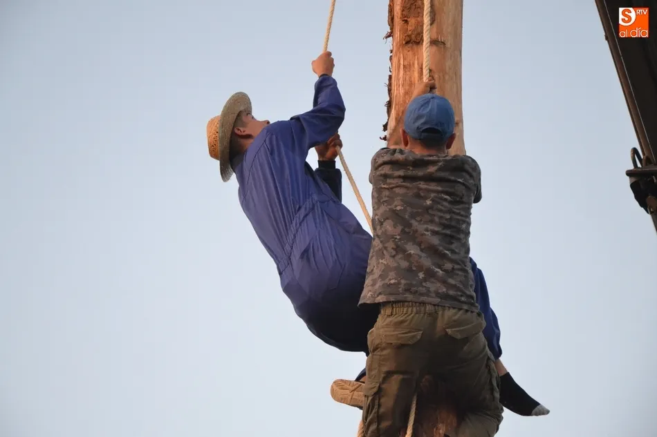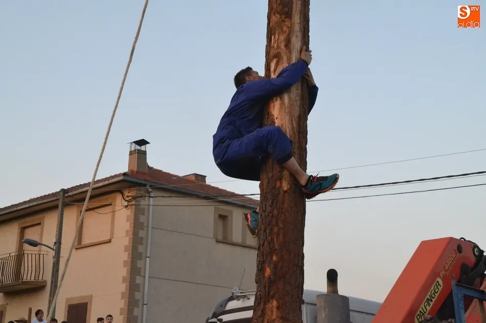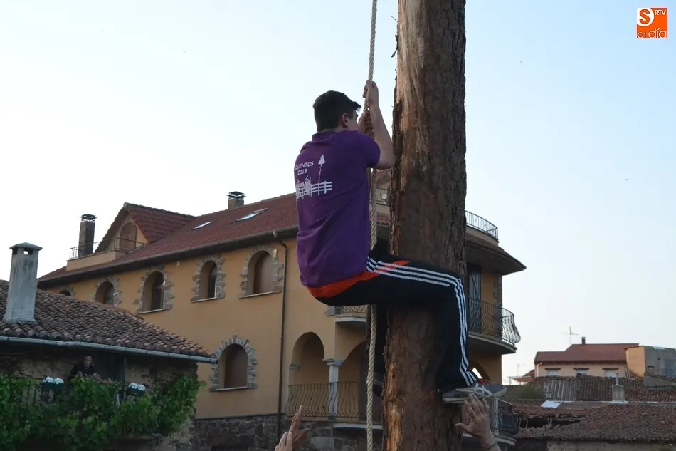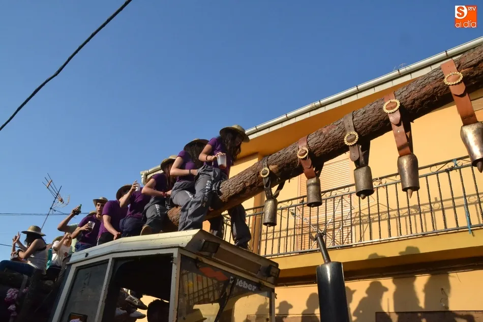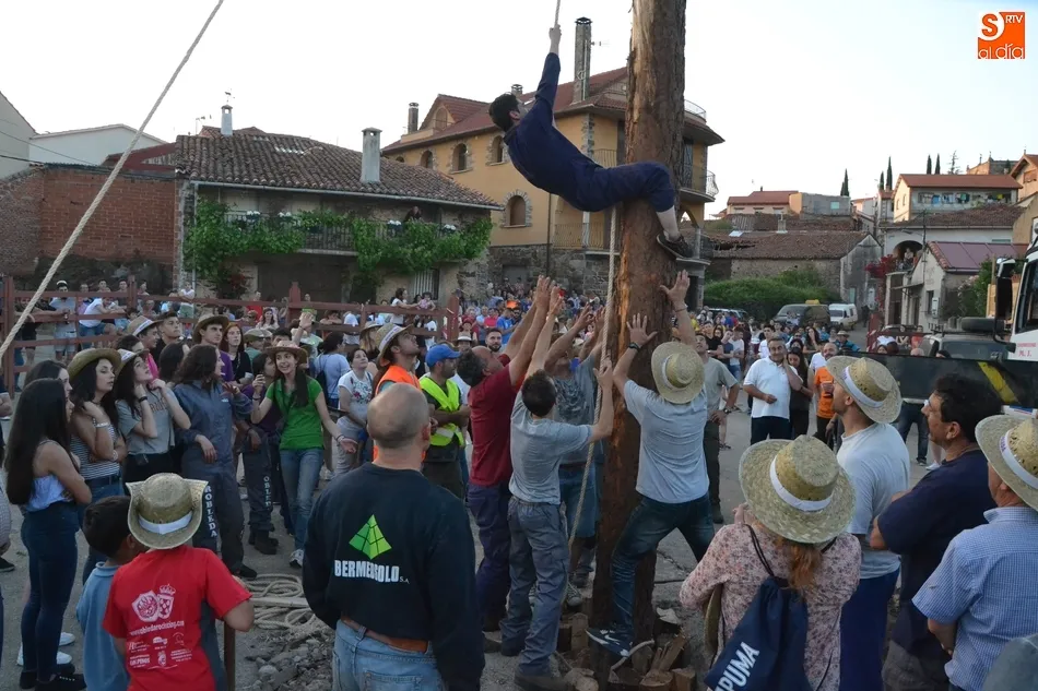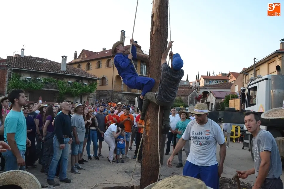En ese trayecto por las calles, la comitiva hizo tres paradas (una de ellas en la Plaza Mayor), antes de llegar a la Plaza del Caño, donde estaban esperando numerosos vecinos para seguir la operación de izado, que fue como siempre larga y laboriosa. En las labores de sujeción colaboraron los propios quintos, dando algún que otro martillazo a los trozos de troncos que hacen de cuña del árbol, al cual intentaron trepar posteriormente los quintos del año (lograron subir 2-3 metros).