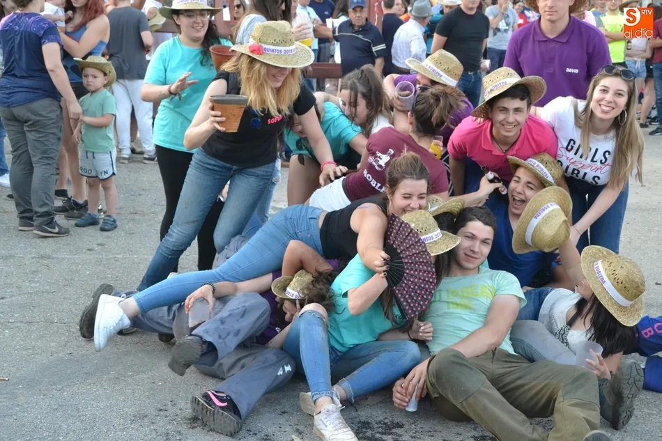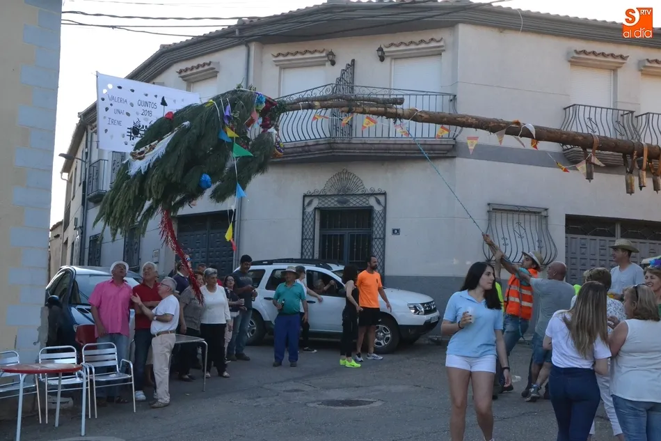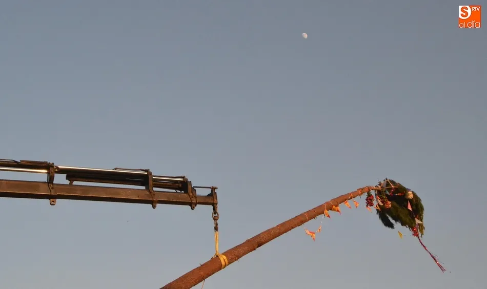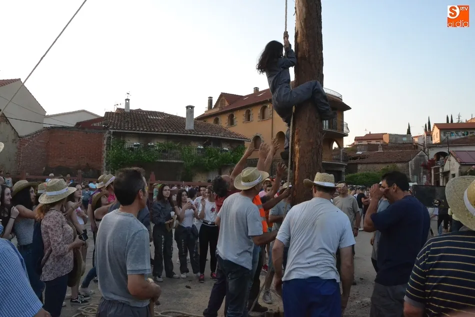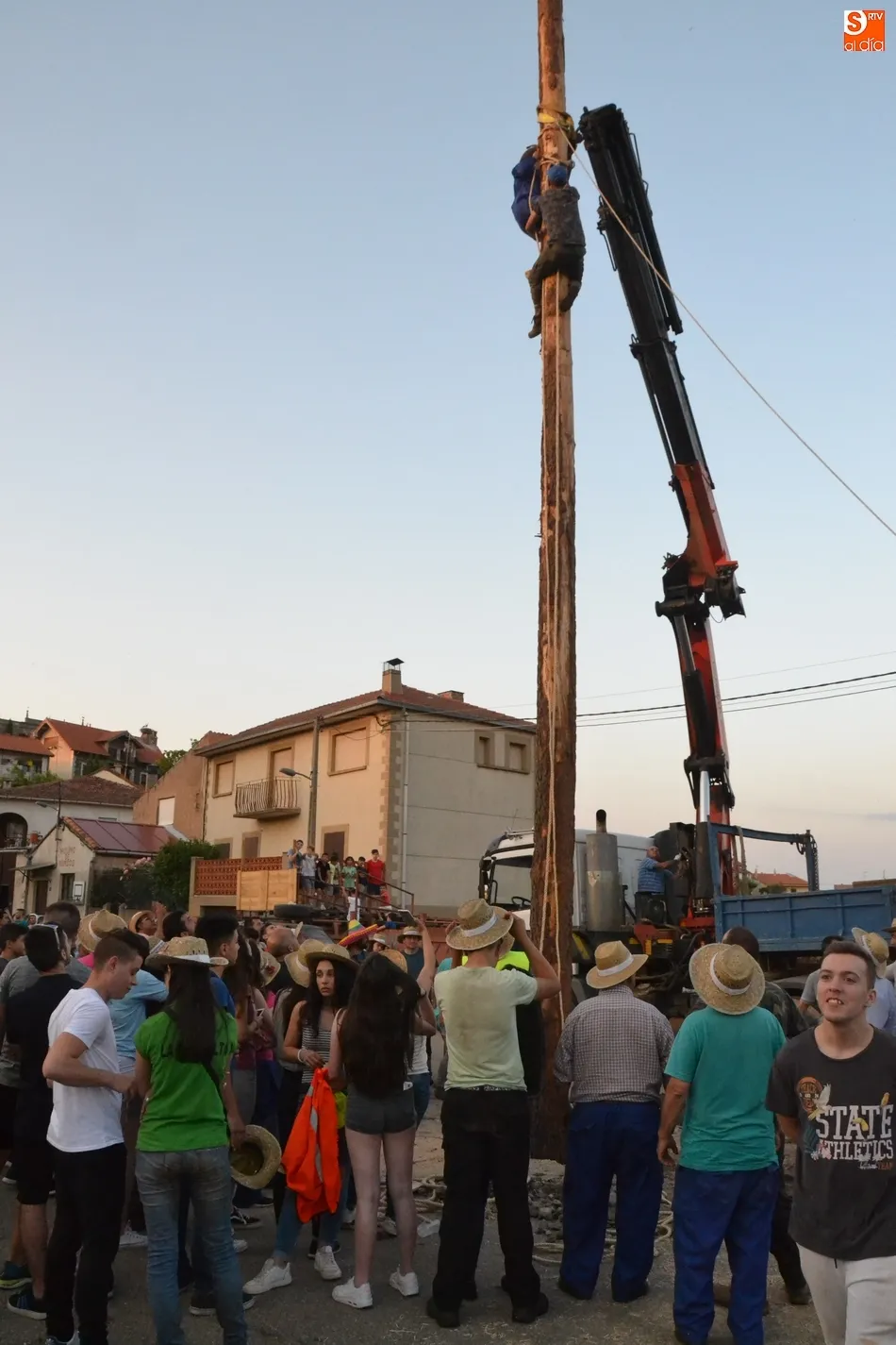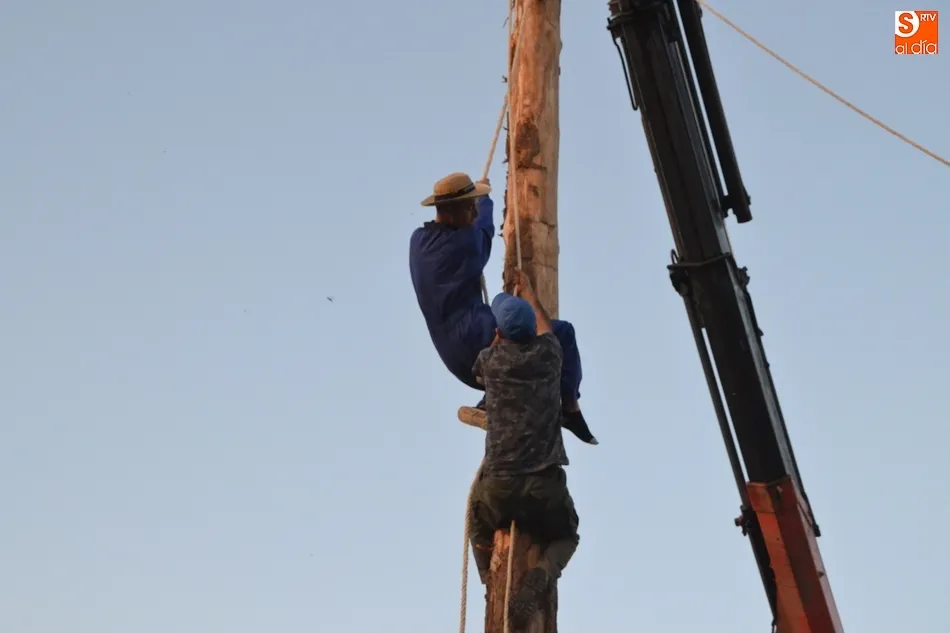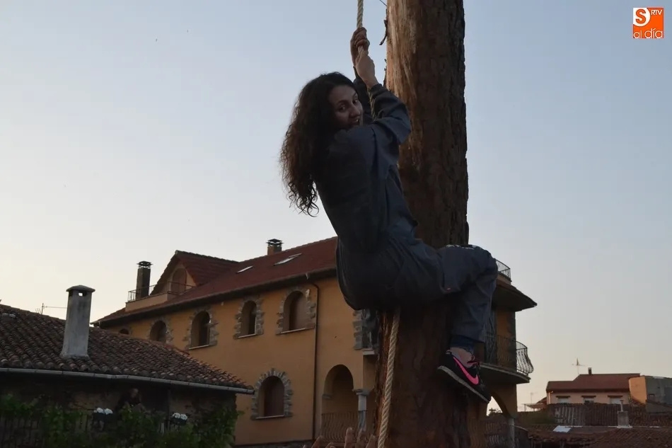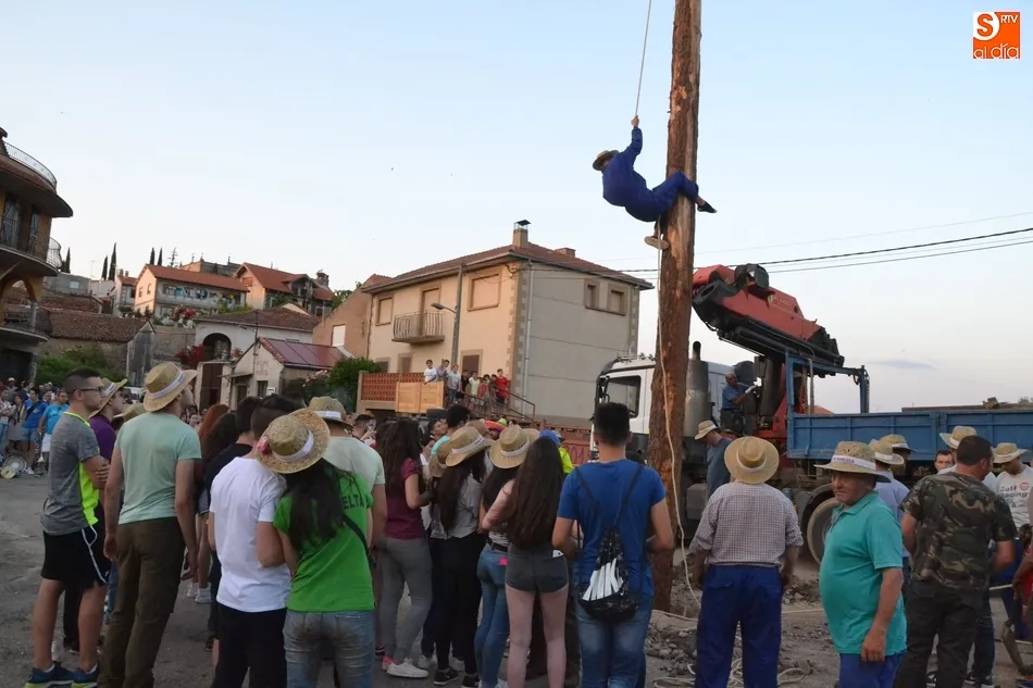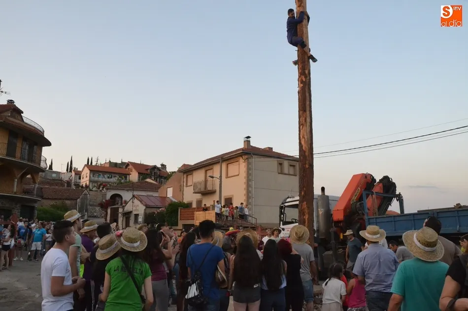 En ese trayecto por las calles, la comitiva hizo tres paradas (una de ellas en la Plaza Mayor), antes de llegar a la Plaza del Caño, donde estaban esperando numerosos vecinos para seguir la operación de izado, que fue como siempre larga y laboriosa. En las labores de sujeción colaboraron los propios quintos, dando algún que otro martillazo a los trozos de troncos que hacen de cuña del árbol, al cual intentaron trepar posteriormente los quintos del año (lograron subir 2-3 metros).