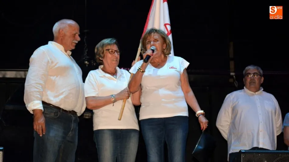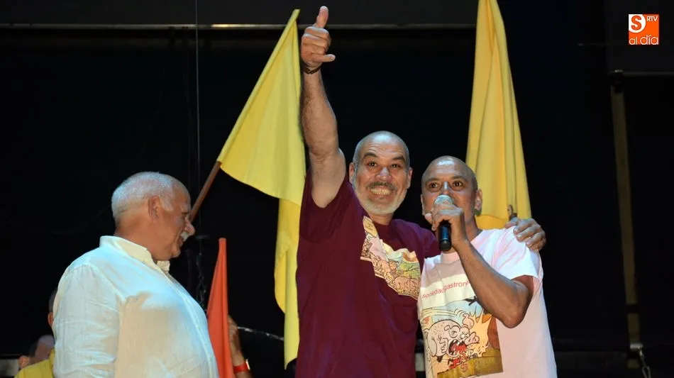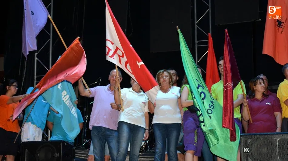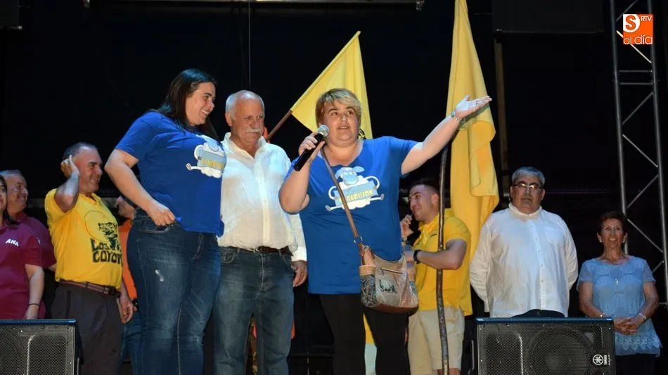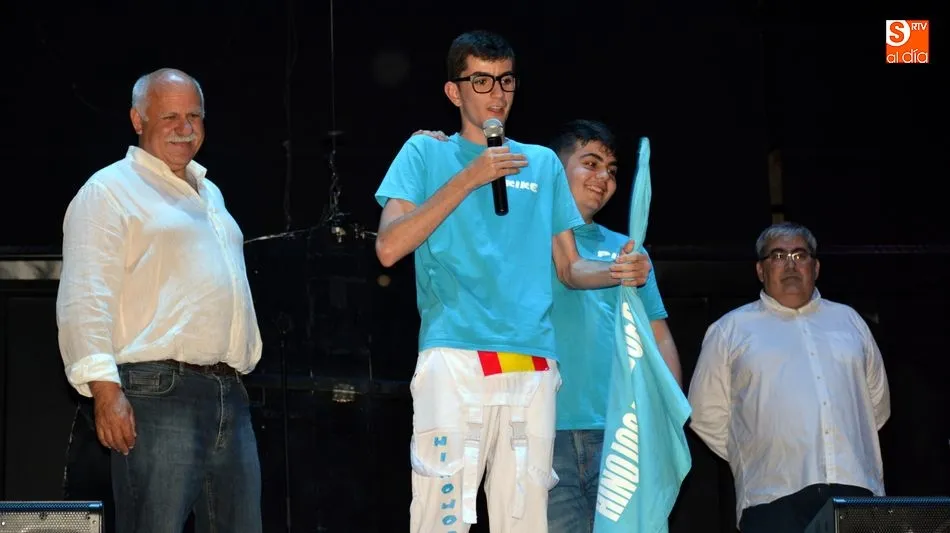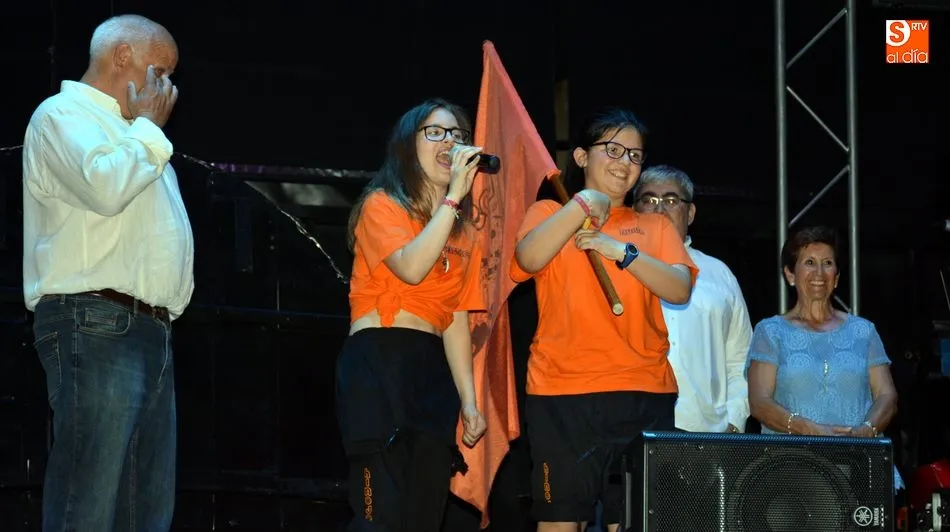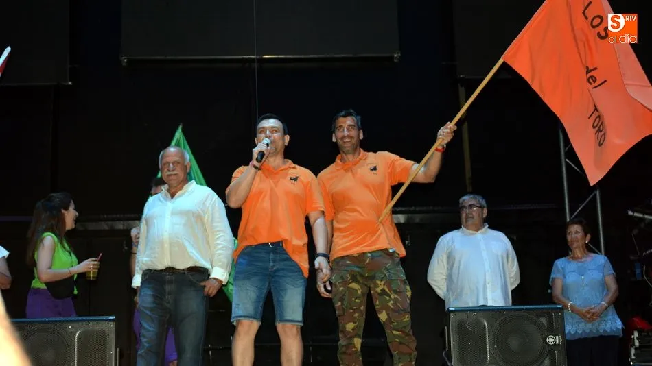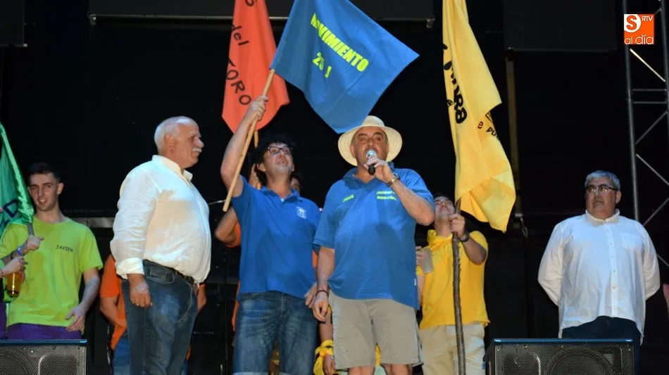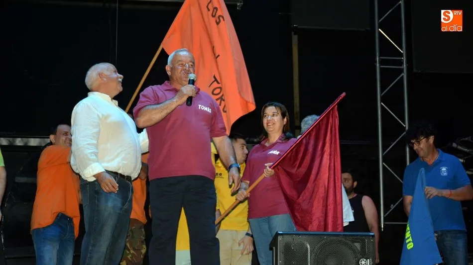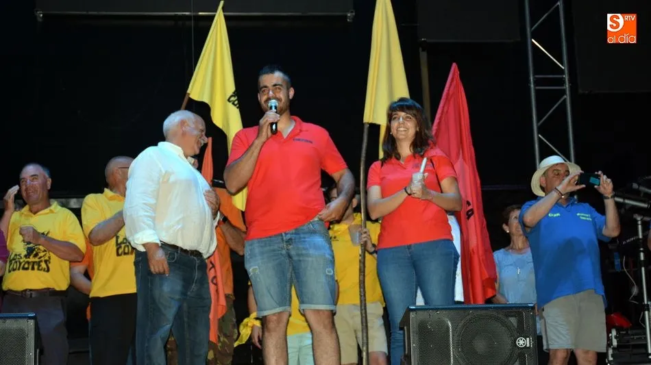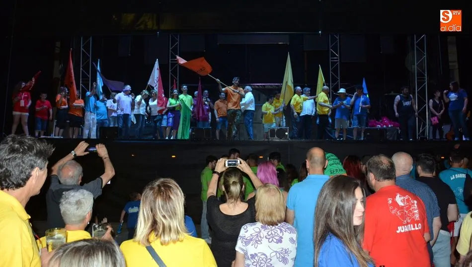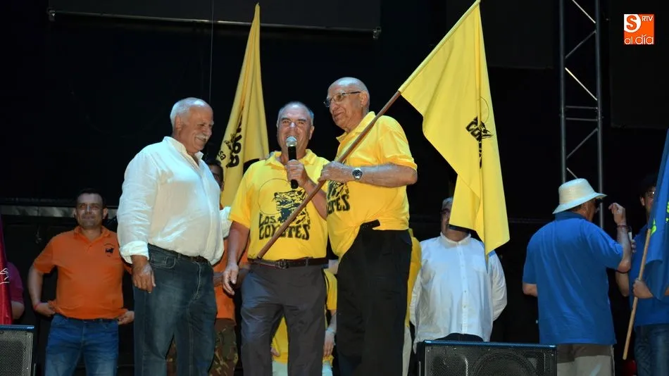 A continuación, llegó la hora del saludo de los peñistas. Dos representantes de cada grupo subieron al escenario, bandera en ristre, para dirigirse al público presente. Peñas de todas las edades, niños, jóvenes y veteranos (Los Pontones, Los Tauros, Los Miura, La Embestida, El Toro, El Rebujón, Los Coyotes,?.) expresaron sus deseos de disfrutar unas grandes fiestas con los tradicionales gritos de ?Viva San Juan Bendito?, ?Viva las conejinas?, ?Viva Hinojosa de Duero?, ratificados con los aplausos del público presente.
