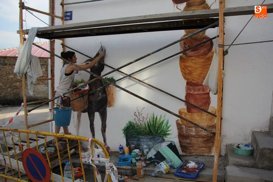 También, en la plaza del caño, Timy, de origen alemán, pintaba sobre la casa de los cántaros de agua a una mujer con su cántaro sobre el hombro; mientras que Catalina ?tras su paso por Granada, llegaba desde la capital charra para reafirmar sus raices pereñanas? pintaba en la casa del cestero a un burro acarreando en serones vides de cepas con su hojarasca, aunque antes ya había plasmado en la antigua quesería a una mujer faenando con las cántaras de leche.