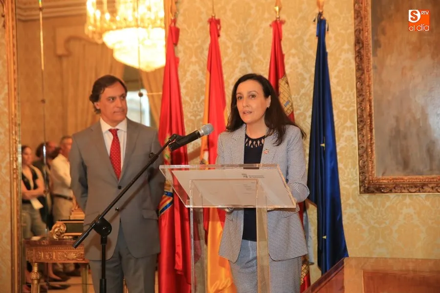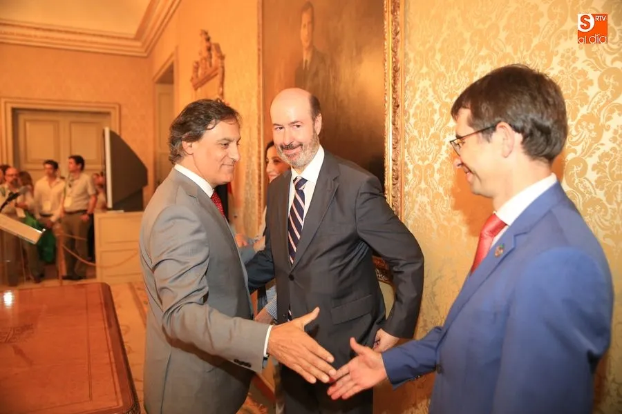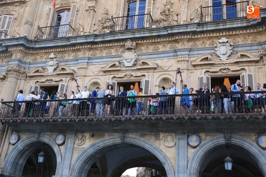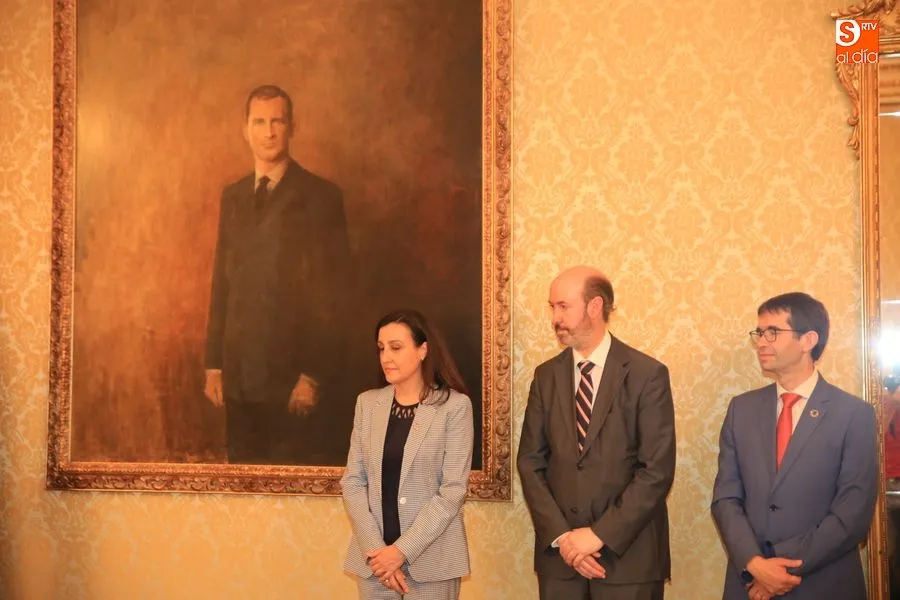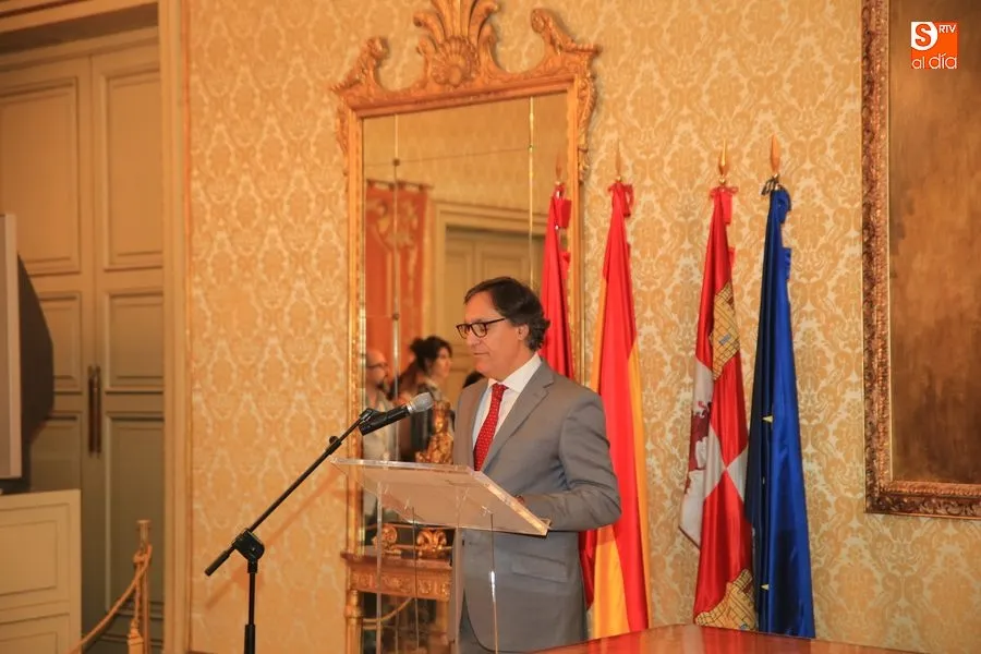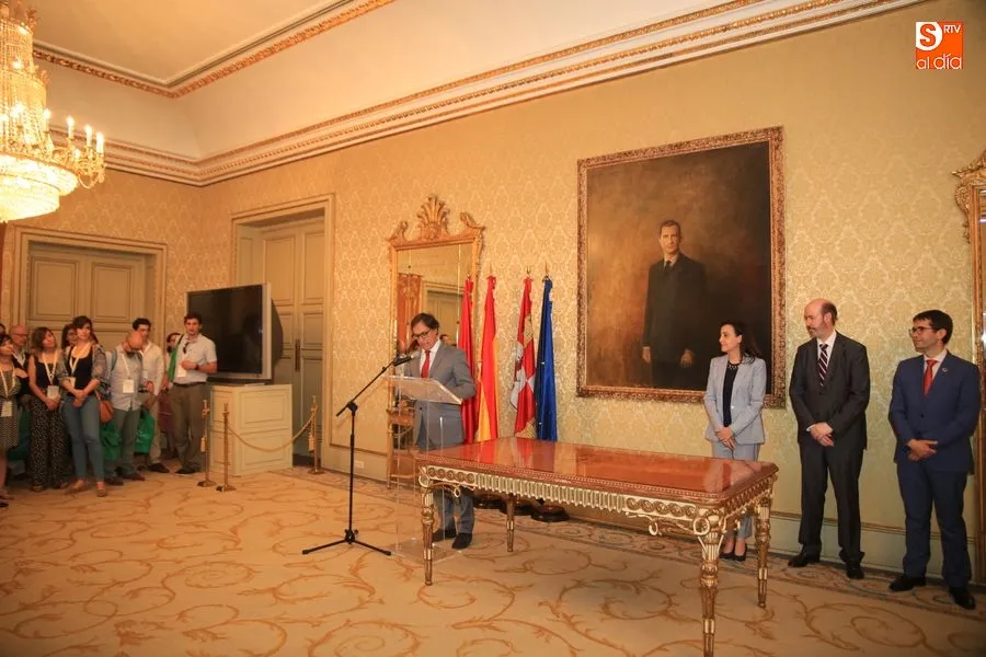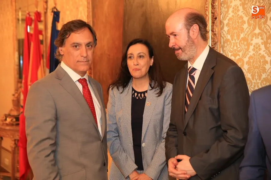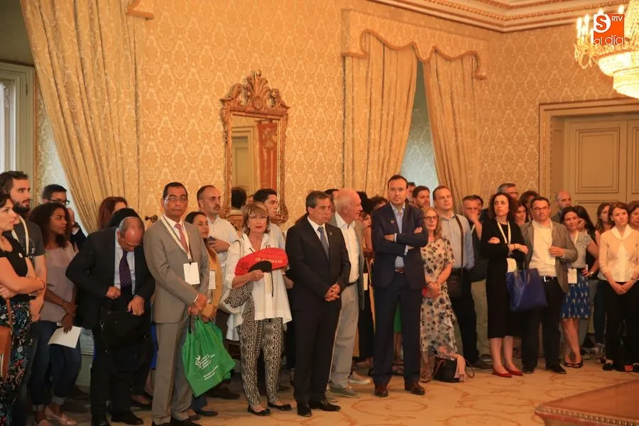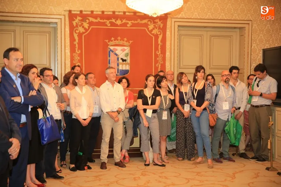 Tras el acto llevado a cabo hoy en el colegio del arzobispo Fonseca, el primer teniente de alcalde, Carlos García Carbayo, recibió a los participantes de la Conferencia Iberoamericana ofreciéndoles una calurosa bienvenida en el Salón de recepciones del Ayuntamiento.