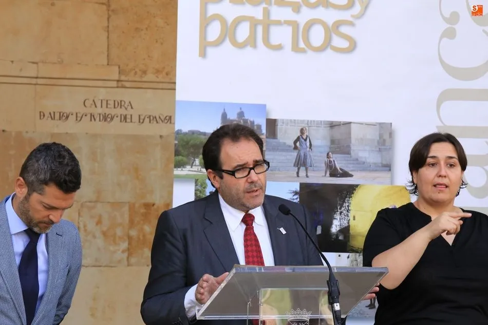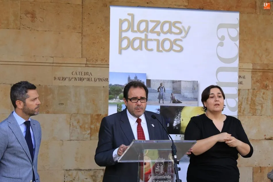 El concejal de Turismo y Cultura del Ayuntamiento, Julio López Revuelta, acompañado del director de la Oficina del VIII Centenario de la Universidad, Julio Cordero, ha presentado hoy la séptima edición del programa turístico-cultural Salamanca Plazas y Patios, que se desarrollará desde este mismo viernes hasta el 26 de agosto y que incluye más de una veintena de propuestas. El VIII Centenario de la Universidad marcará buena parte de la programación. El Patio de Escuelas, la Plaza de San Benito y la Cueva de Salamanca serán escenarios de las propuestas escénicas.