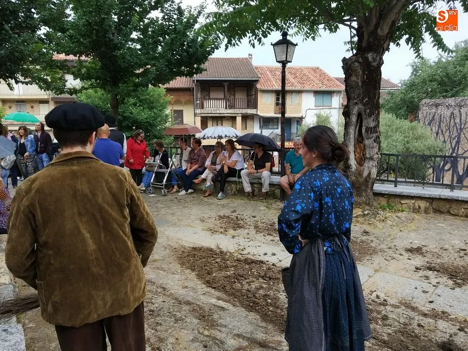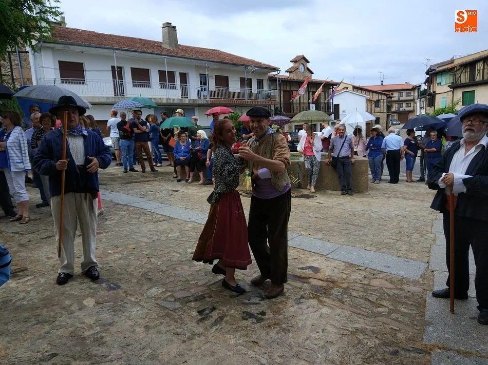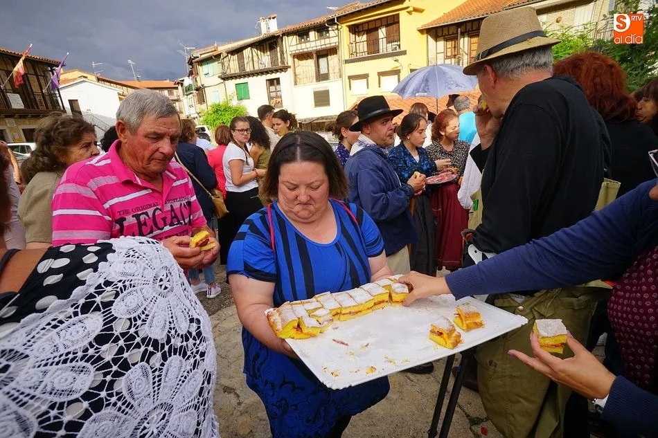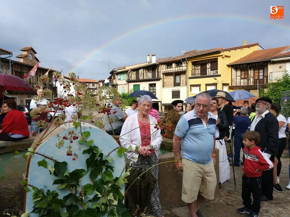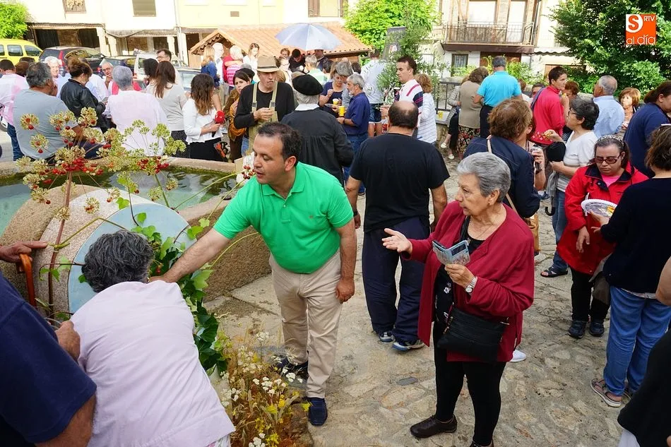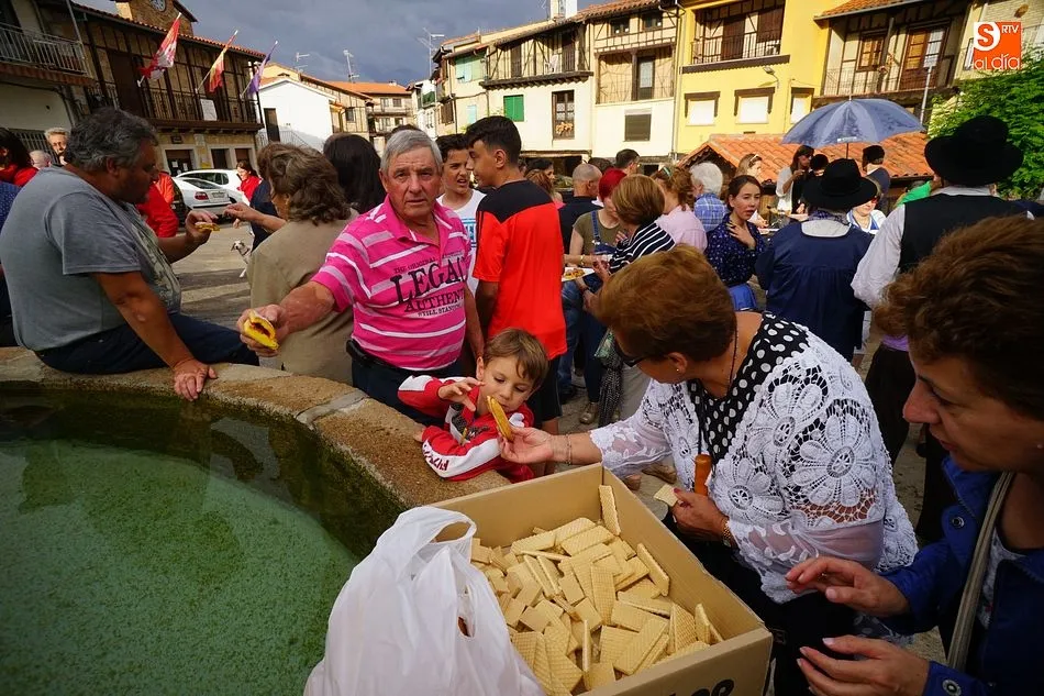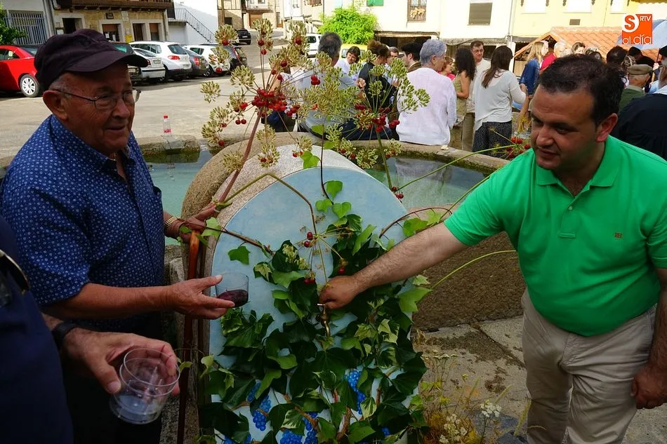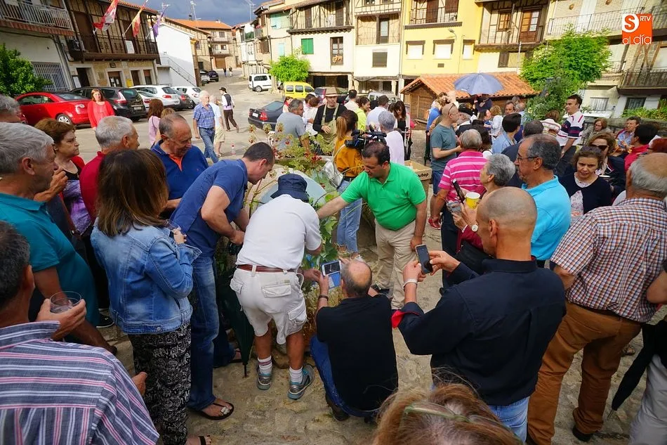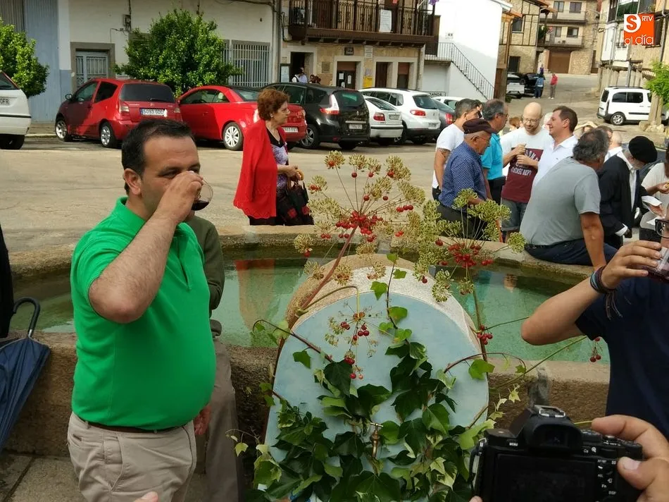 Por la tarde llegó el momento del grueso de la fiesta, con la escenificación del ?Arriendo de Calles? a cargo de Cateja Teatro. Se trata de una representación teatral de una vieja costumbre local mediante la cual los vecinos pujaban por el aprovechamiento de estiercol que se producía en la vía pública y que se usaba para abonar los cercanos viñedos y campos de cerezos. La tradición se recuperó el pasado año, y se contó con una decena de participantes ataviados con trajes típicos, no faltó la música en directo y la explicación de las viejas costumbres y leyendas, como la del ?Milagro de la Fuente del Vino. Para hacer la experiencia más realista, se instaló frente a la ermita una verdadera fuente de vino por la que pasaron todos los presentes, incluido el alcalde, Javier García, también presidente de la Ruta del Vino de la Sierra de Francia. Los presentes degustaron de nuevo los productos típicos, como vainillas, hornazos y jamón ibérico, loncheado por miembros de la Asociación de Cortadores de Jamón de Castilla y León.
