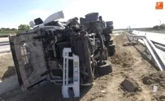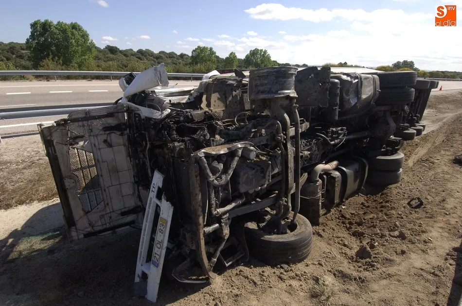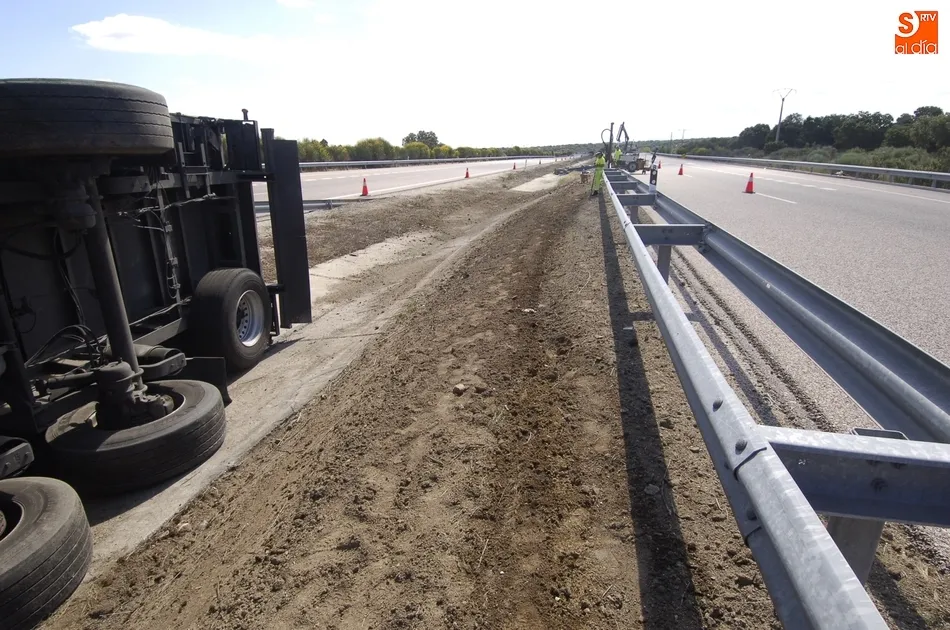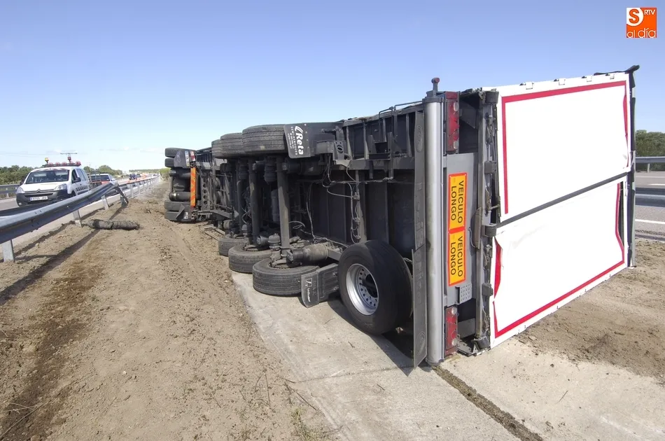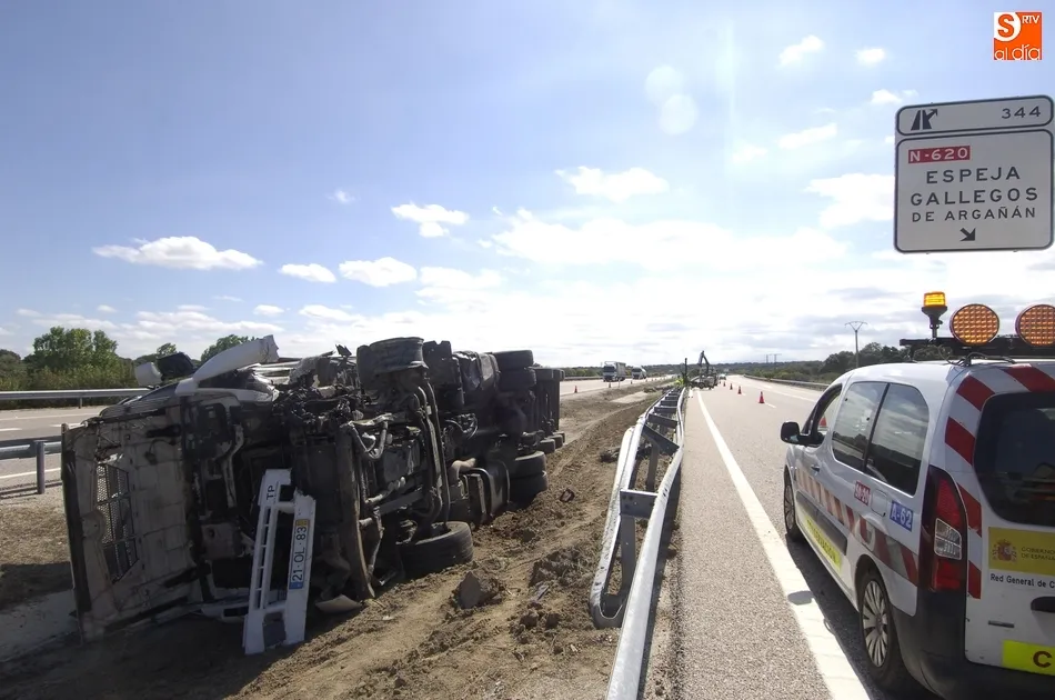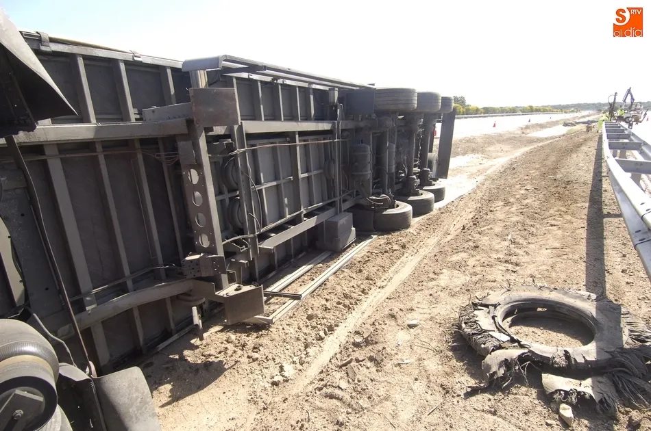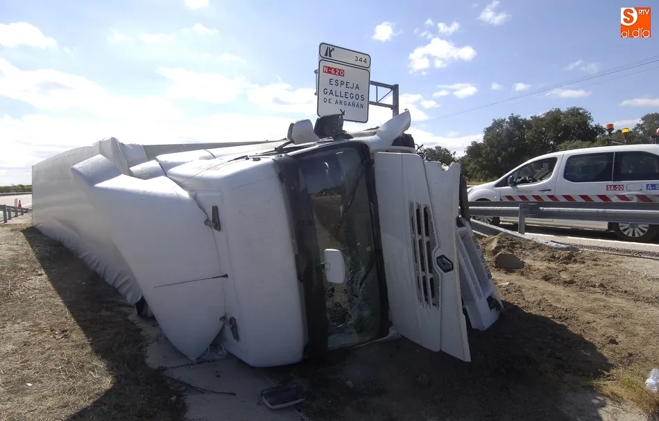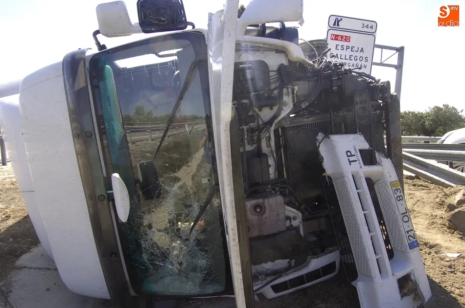 Un camión de matrícula portuguesa protagonizó en la tarde del martes un espectacular accidente en plena Autovía A-62 que milagrosamente se saldó sin daños personales de relevancia para el ocupante de ese vehículo (ni para otros conductores).
