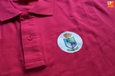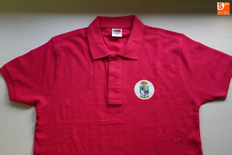 Los polos son de color fucsia y llevan el escudo del pueblo sobre fondo blanco