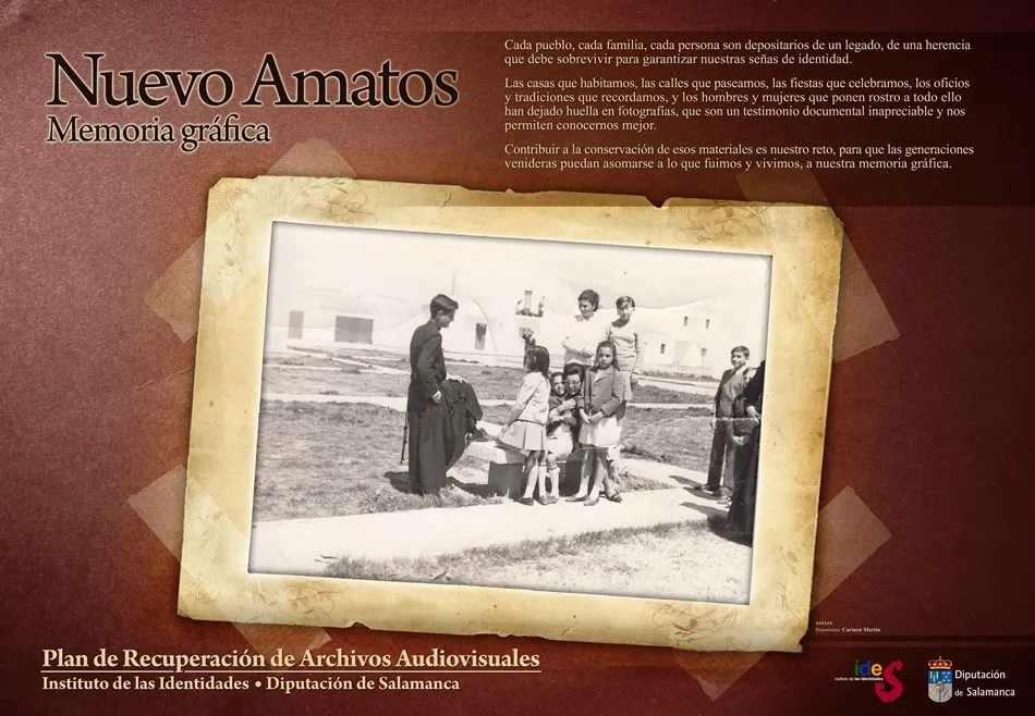 Nuevo Amatos, uno de los llamados pueblos de colonización, perteneciente al ayuntamiento de Calvarrasa de Abajo, desvela a propios y extraños, a partir del día 6 de julio, su memoria gráfica, gracias al Instituto de las Identidades de la Diputación de Salamanca y su Plan de Recuperación de Archivos Audiovisuales Familiares.