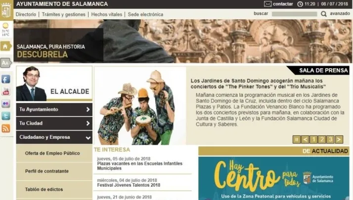 El contenido de www.aytosalamanca.es ha obtenido una puntuación de 9,40 sobre 10 según los resultados globales reflejados en el informe de este estudio. Esta calificación coloca a la web municipal en la cuarta posición de un total de 50 portales web de ayuntamientos de capitales de provincia analizados y en la novena de los 198 sitios web de administraciones locales que se han testeado.