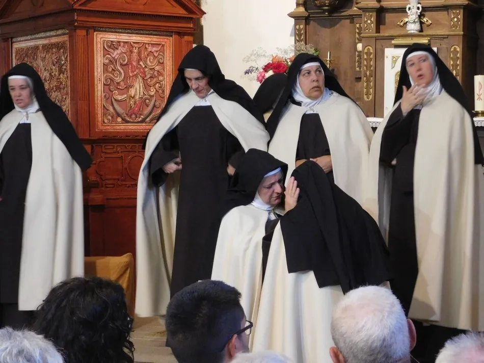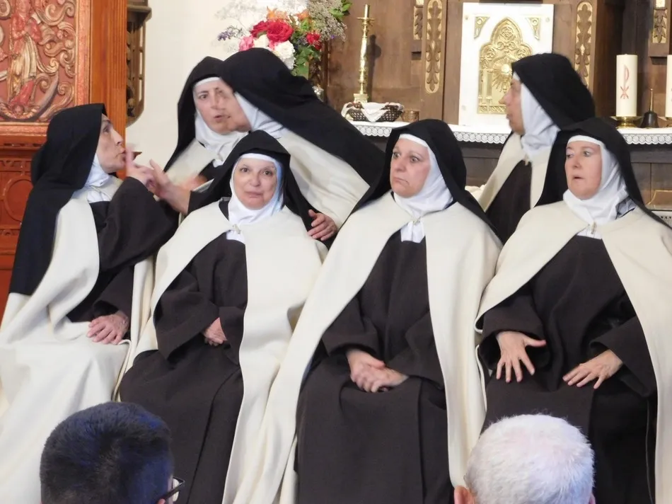 Una vez más fue san Pedro Apóstol, regente de la parroquia de Puebla de san Medel, el que utilizara sus famosas llaves para que unas cansadas hermanas carmelitas llegaran hasta el altar que se iba a convertir en el escenario perfecto en que nos hablan de la vida de su madre, de sus enseñanzas, de la obviedad de sus actos, además de divertirse con sus bellos poemas, leer sus cartas y relatar los avatares de sus fundaciones, mientras una voz masculina desde lo alto de un púlpito pide explicaciones ante tanto atrevimiento. Y así un público admirado que enseguida se ha situado con los personajes en Alba de Tormes, va conociendo que se está hablando de tan sólo una mujer, de seductora inteligencia, lúcida humildad y resistente paciencia, que bajo el hábito de lana de oveja que visten también sus hermanas fue libre y no le importó ni el frío ni el calor, ni las amenazas humanas. Claro ejemplo de ello son las espontáneas palabras de unas monjas que hablan del rey y el Inquisidor General del reino con la misma gracia con la que los trataba su madre.