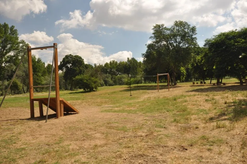 Todos los elementos de este parque mixto están elaborados en madera para conseguir una perfecta integración con el entorno natural de la isla del Soto y están situados en la primera pradera desde el acceso por la pasarela de la plaza de la Iglesia.