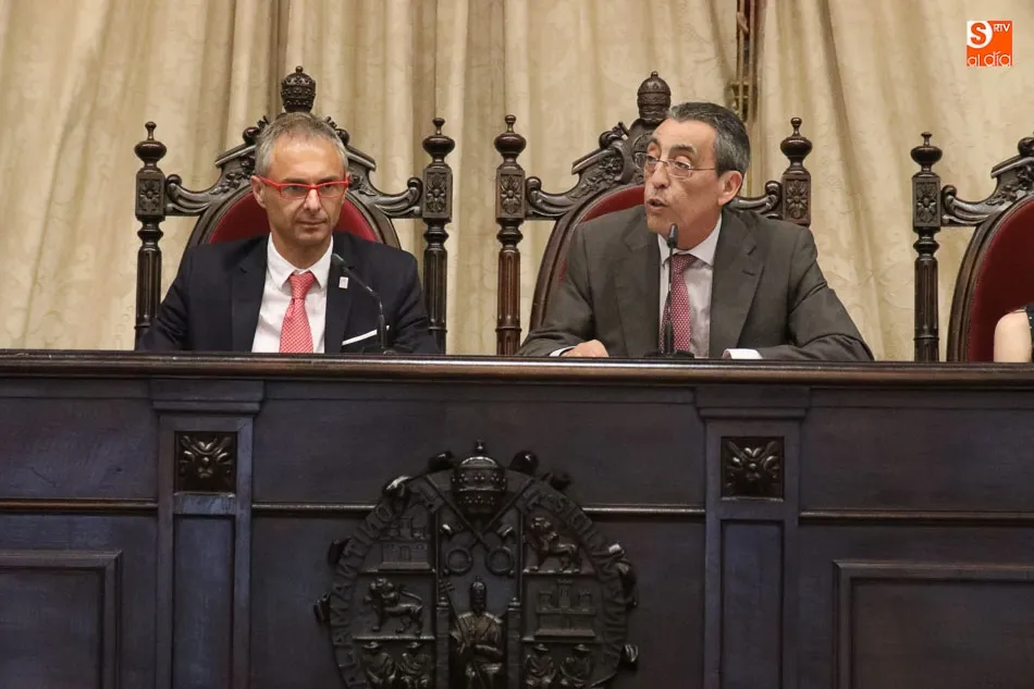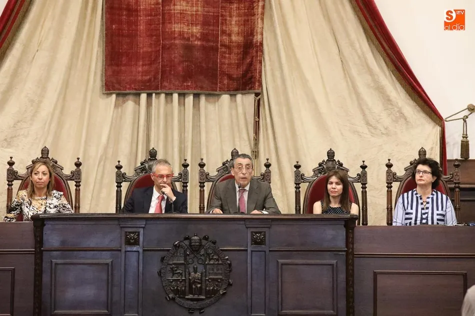 En el acto estuvieron presentes las vicerrectoras de Docencia y Evaluación de la Calidad, Izaskun Álvarez Cuartero; de Investigación y Transferencia, Susana Pérez Santos; de Estudiantes y Sostenibilidad, Ana Belén Ríos Hilario; la directora del Gabinete del rector, Mª Dolores Calvo; y el delegado territorial de la Junta de Castilla y León en Salamanca, Bienvenido Mena.