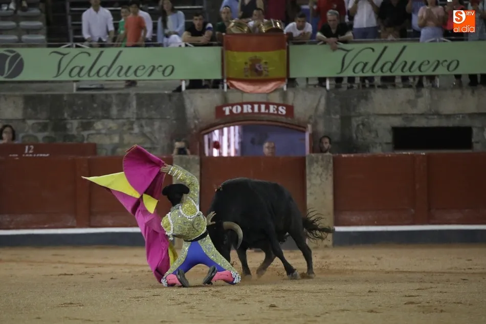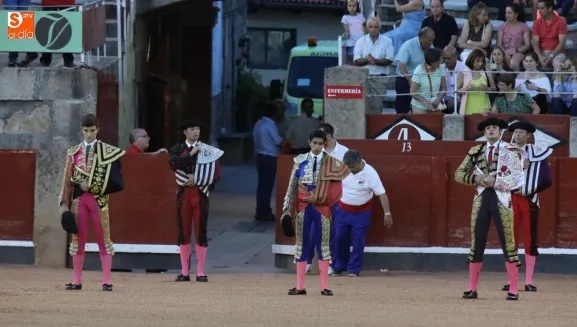 El castaño bociblanco y rabón que abrió plaza, de la ganadería ?La Glorieta?, le correspondió a Rubén Blázquez, un espigado mozo salmantino que supo enhebrar templadas verónicas bien cimbreadas. El novillo, flojito, calamocheó mucho en la tela roja, pero obedeció los toques dentro de la incomodidad de su embestida. Además se pegó una fea voltereta, lo que mermó más si cabe sus condiciones motoras. No tuvo clase pero fue aprovechable. Después de un pinchazo y estocada con descabello, el torero fue levemente aplaudido.