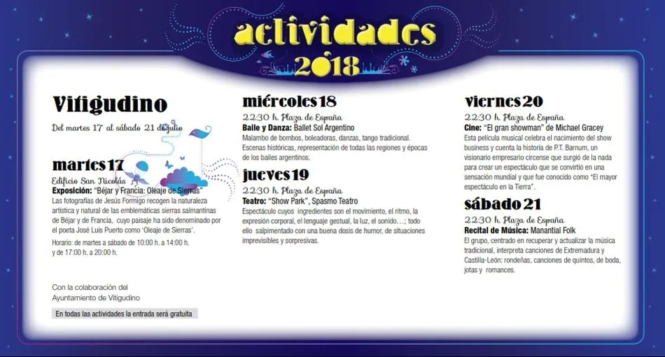 A partir del 18 de julio, la Plaza de España será el escenario donde se desarrollarán las actuaciones que completan el programa, comenzando ese miércoles, a las 22.30 horas, con el Ballet Sol Argentino, una representación de todas las regiones y épocas de los bailes argentinos. Al día siguiente y a la misma hora, Spasmo Teatro pondrá una buena dosis de humor con la representación de la obra Show Park.