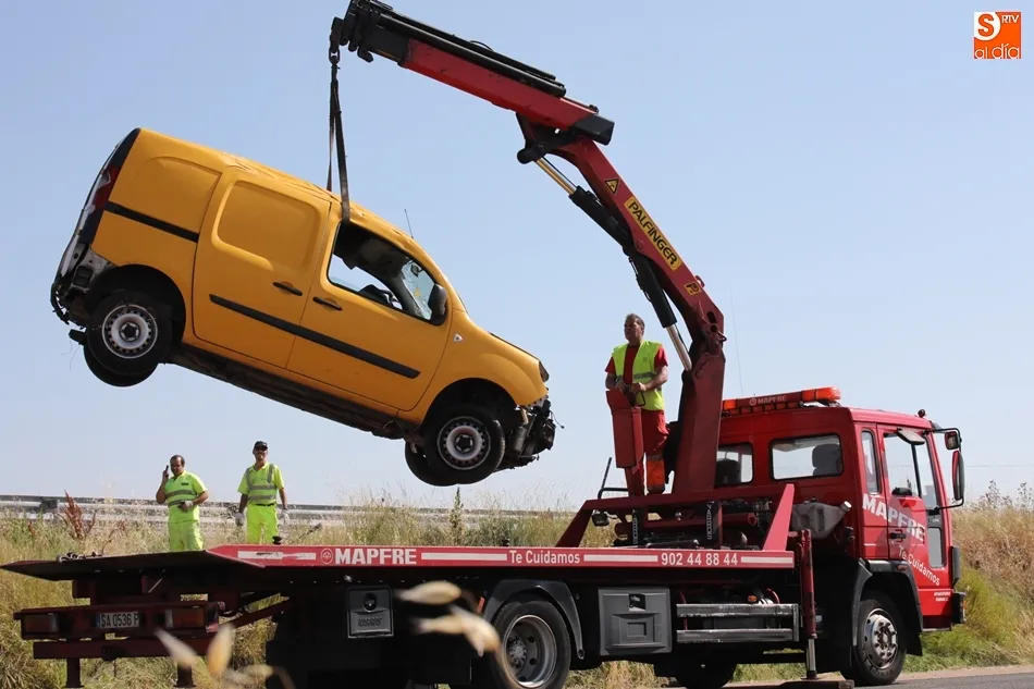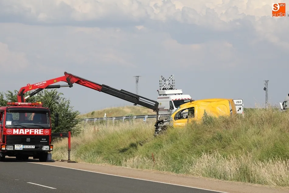 Una furgoneta que circulaba por la A-62, en el kilómetro 261, en el término muncipal de Calzada de Don Diego y en dirección a Ciudad Rodrigo, ha sufrido esta tarde una aparatosa salida de vía con vuelco, habiendo dado aviso a los servicios de emergencia 112 y solicitando asistencia para dos heridos. Hasta el lugar de los hechos se han desplazado efectivos sanitarios y policiales, al tiempo que ha sido necesaria la presencia de la grúa para remolcar el vehículo siniestrado.