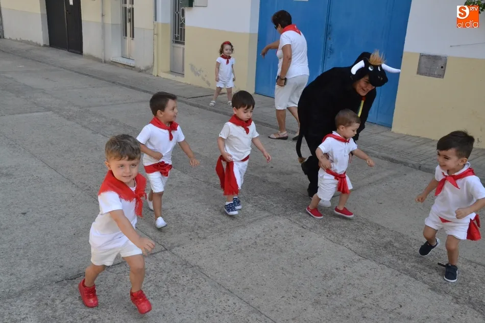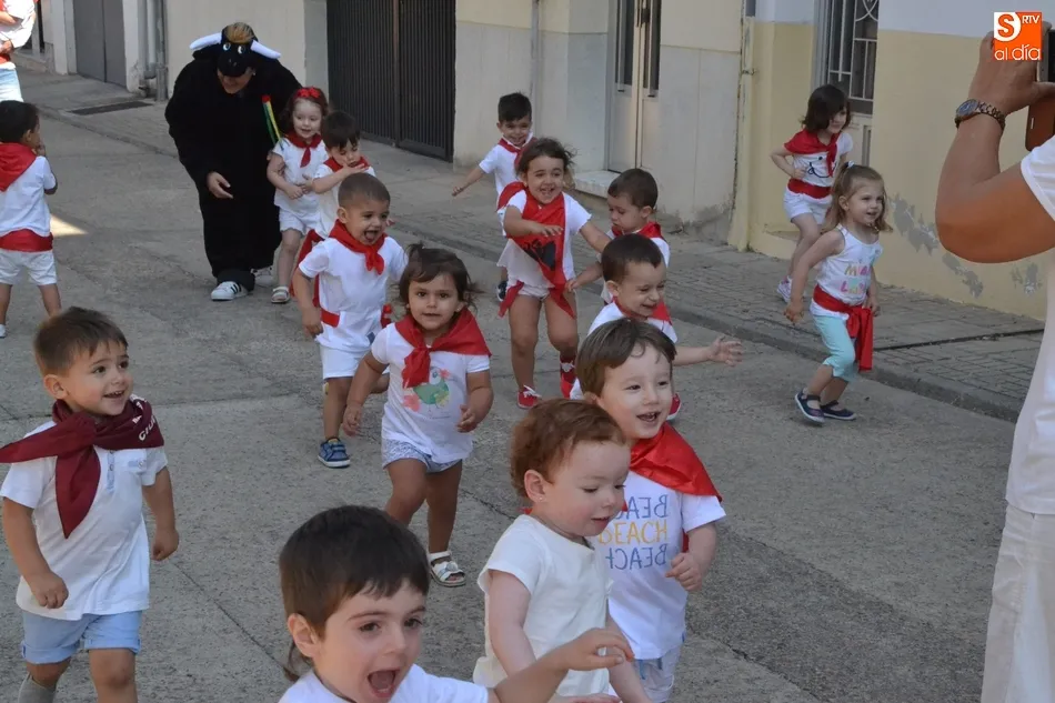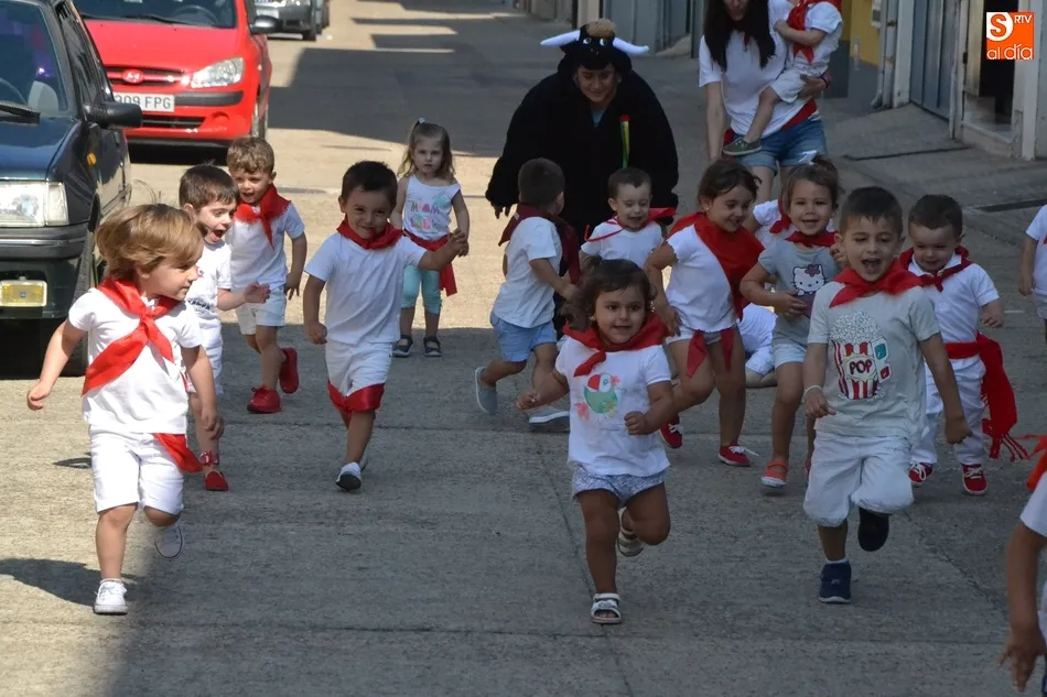 Previamente a esas carreras, los alumnos de la Escuela realizaron los habituales cánticos pidiendo protección a San Fermín, quién estuvo presente a través de una imagen que se había pegado en una pared de la calle. En este caso, este último encierro fue un poco accidentado, dejando varias caídas (con los consiguientes lloros) y una pequeña montonera al tropezar varios niños entre ellos.
