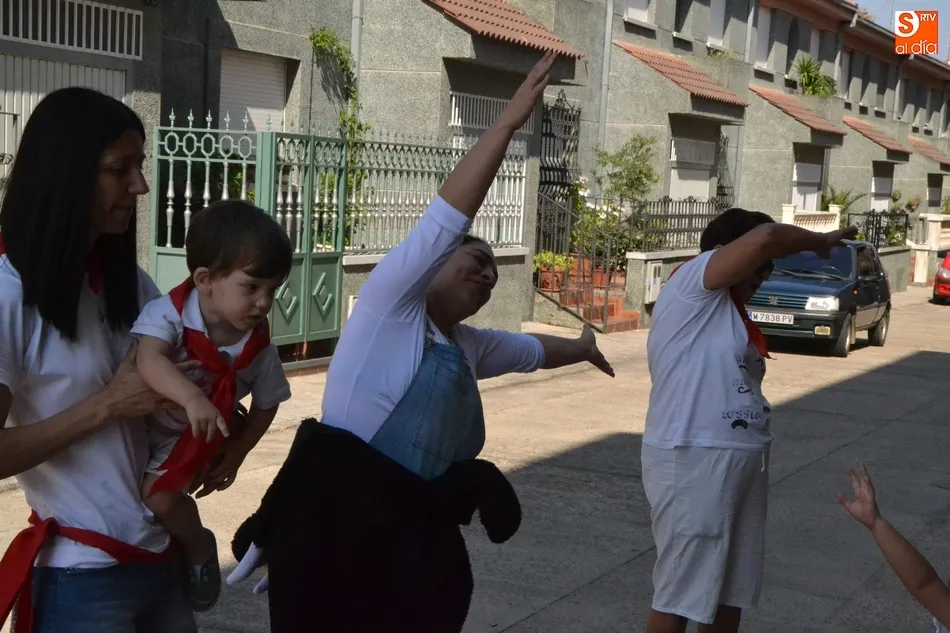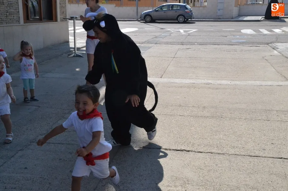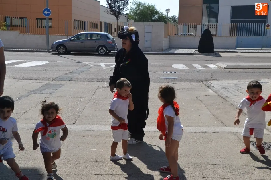 Como ya hicieron la semana pasada para abrir las fiestas, los alumnos mayores de la escuela, ataviados con vestimentas blancas, pañuelos rojos y algunos incluso con fajín, salieron a la calle Vicente Aleixandre para correr el último encierro de estos Sanfermines delante de su particular toro.