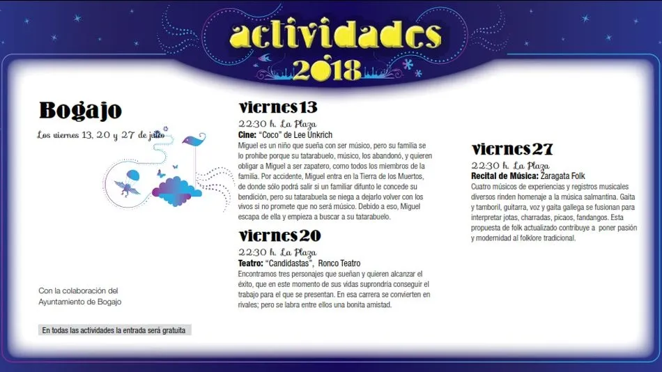 Bogajo acogerá durante este mes de julio tres actividades incluidas en las Noches de Cultura, programa veraniego de actuaciones artísticas y culturales promovido por la Diputación de Salamanca.